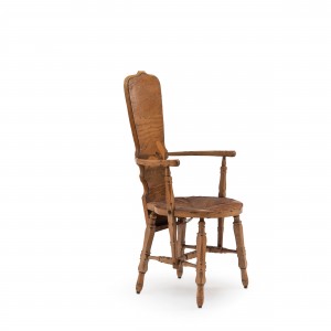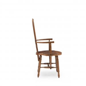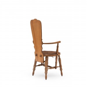 Rustic French Provincial style (19th Cent) high back arm chair with rush seat and inlaid back having a water scene with 2 cranes.