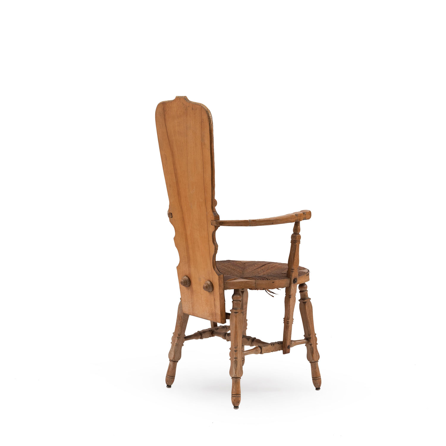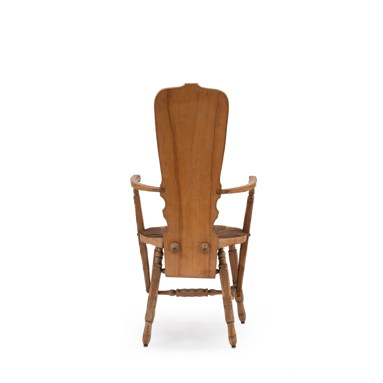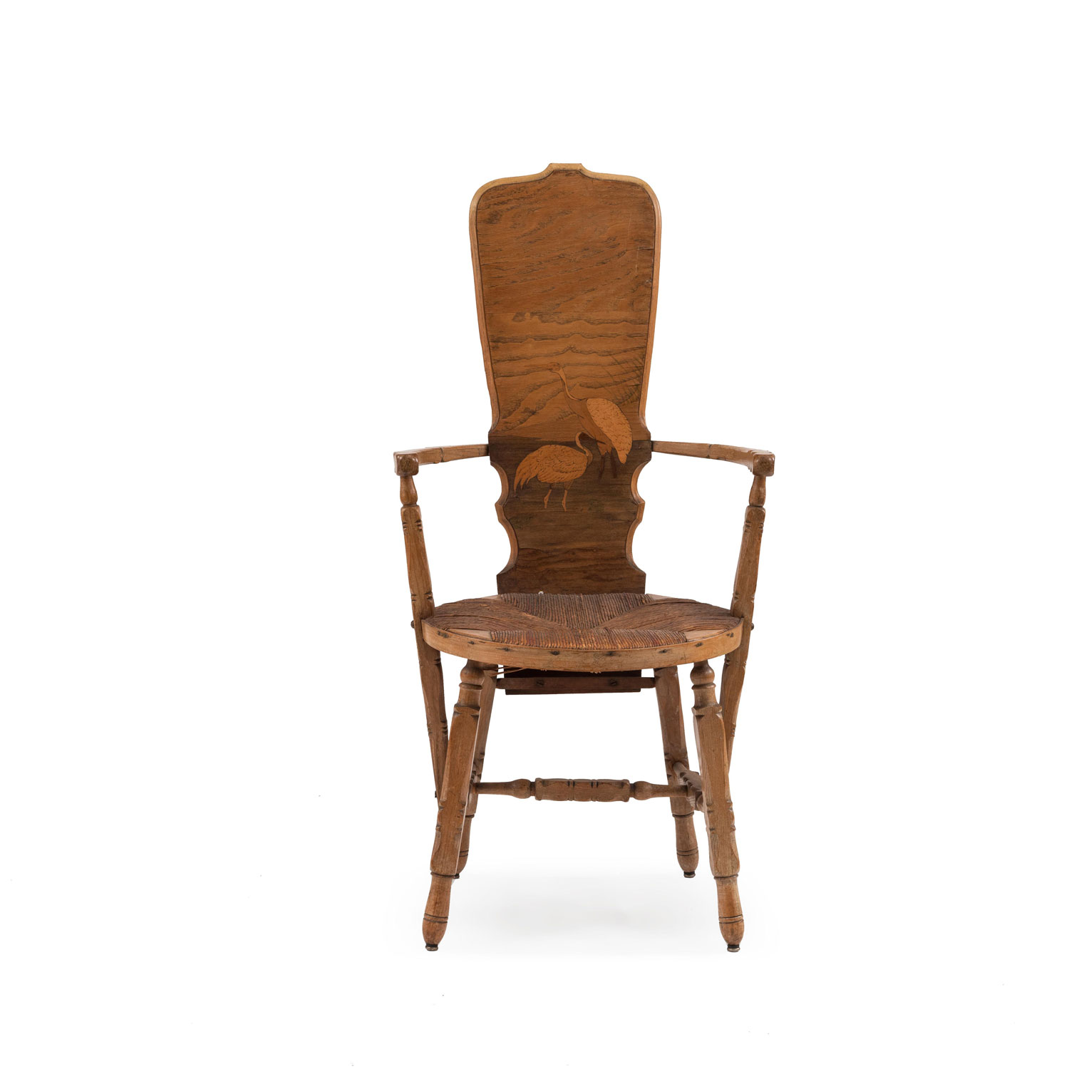 Rustic French Provincial style (19th Cent) high back arm chair with rush seat and inlaid back having a water scene with 2 cranes