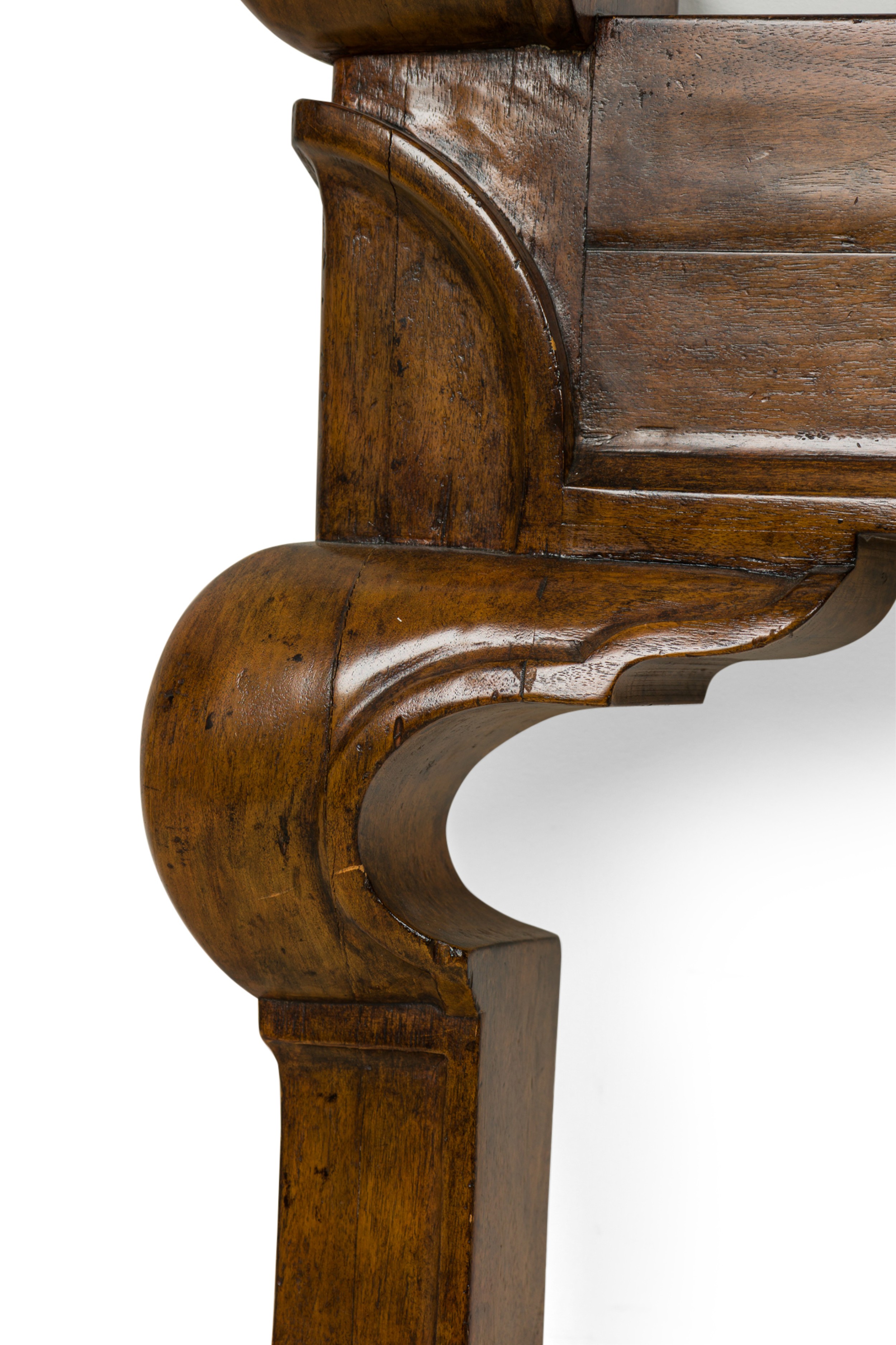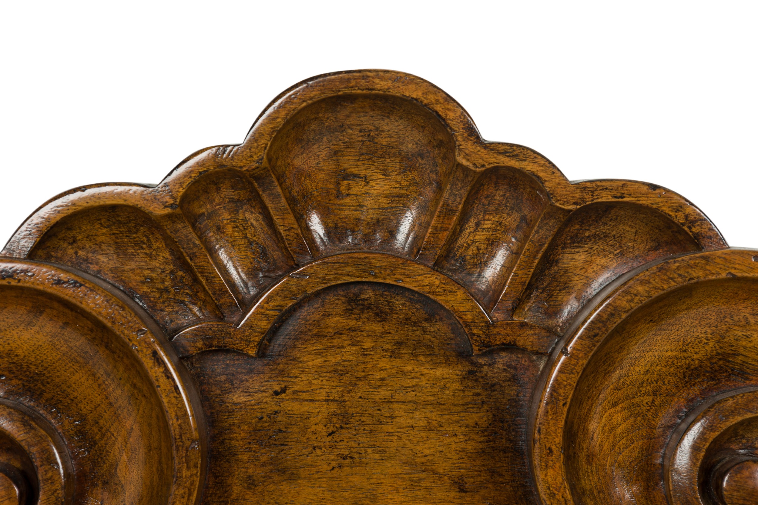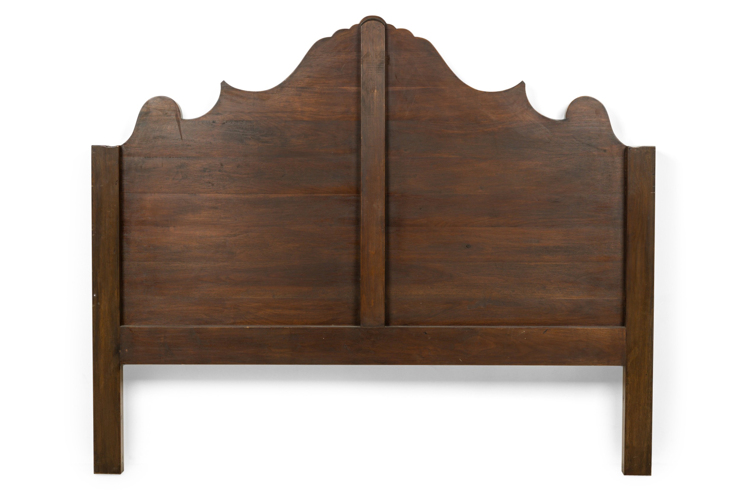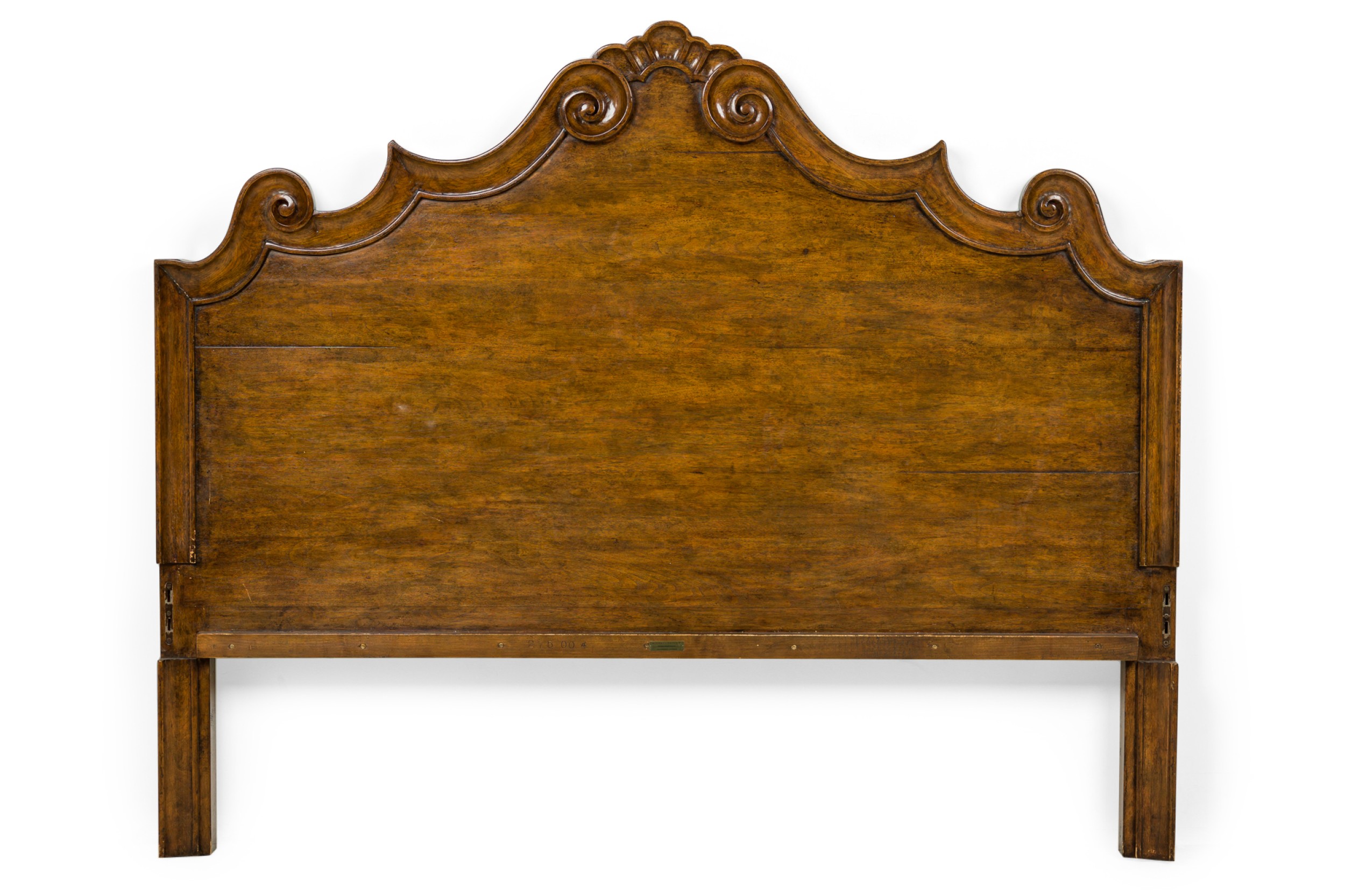 French Provincal style (20th Century) walnut king size bed with a shaped design to the headboard with a scroll and center carved shell design (headboard, footboard, 2 rails) (MICHAEL TAYLOR DESIGN)