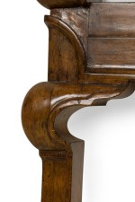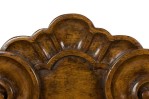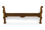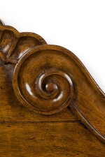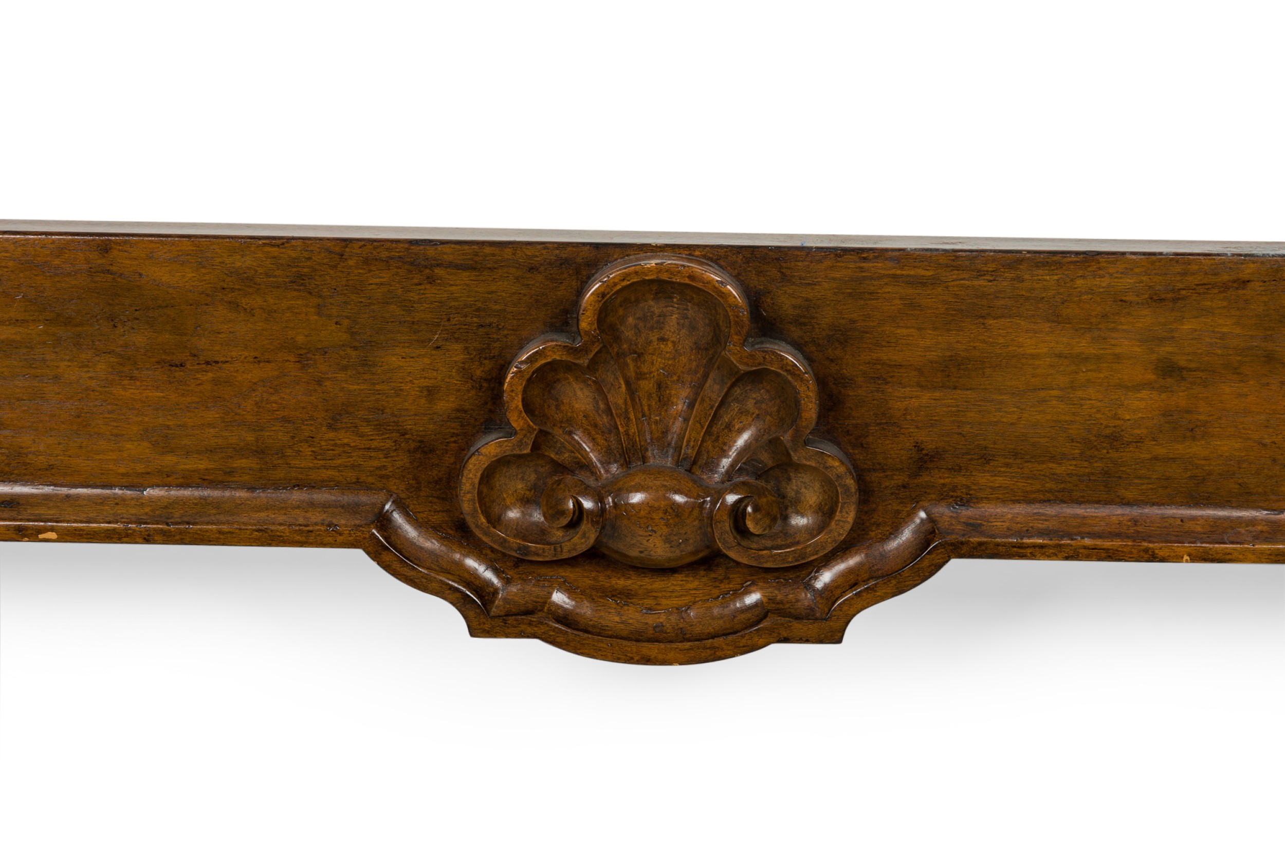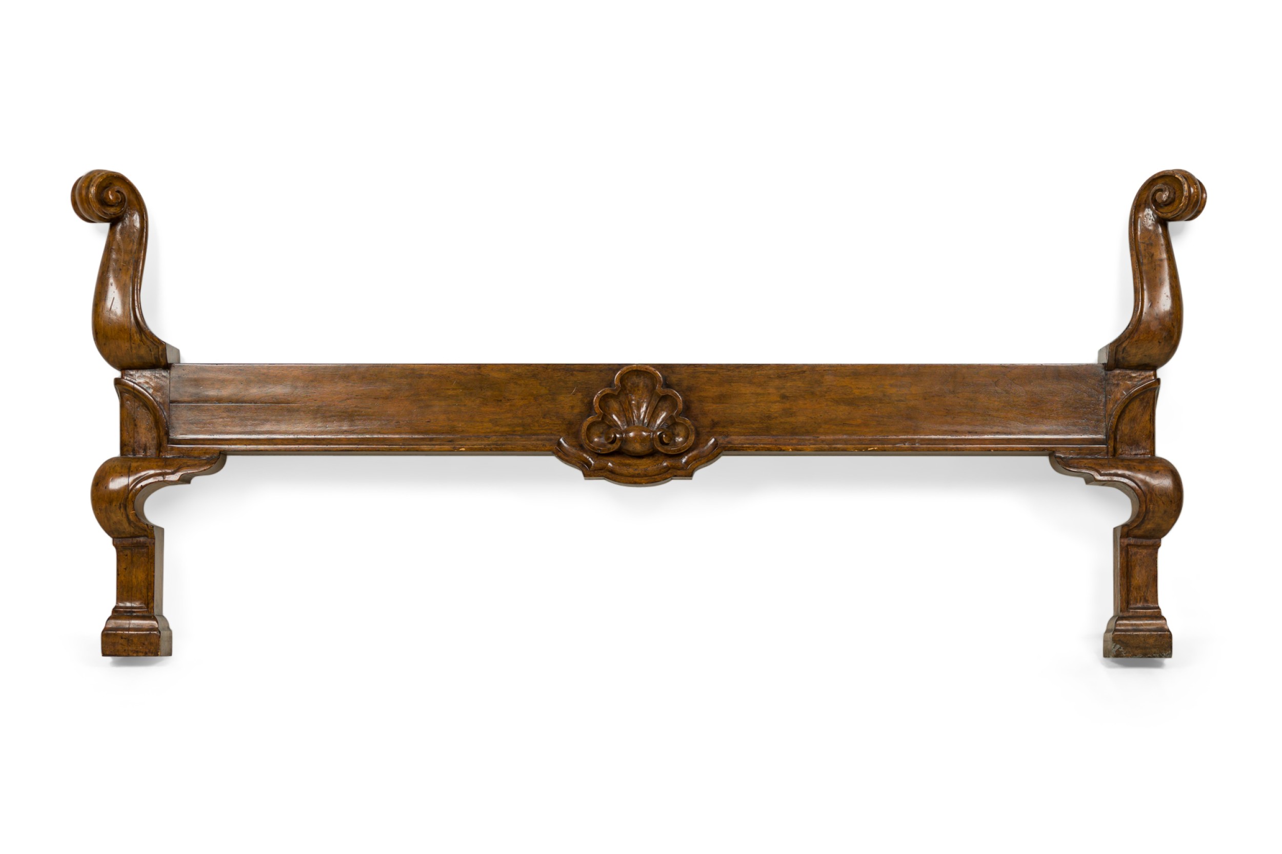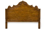 French Provincal style (20th Century) walnut king size bed with a shaped design to the headboard with a scroll and center carved shell design (headboard, footboard, 2 rails) (MICHAEL TAYLOR DESIGN).