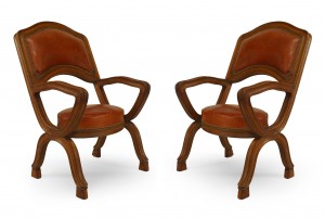 Set of 6 French Provincial (19th Cent) oak open arm chairs with "X" form legs supporting an oval leather seat and shaped back.