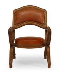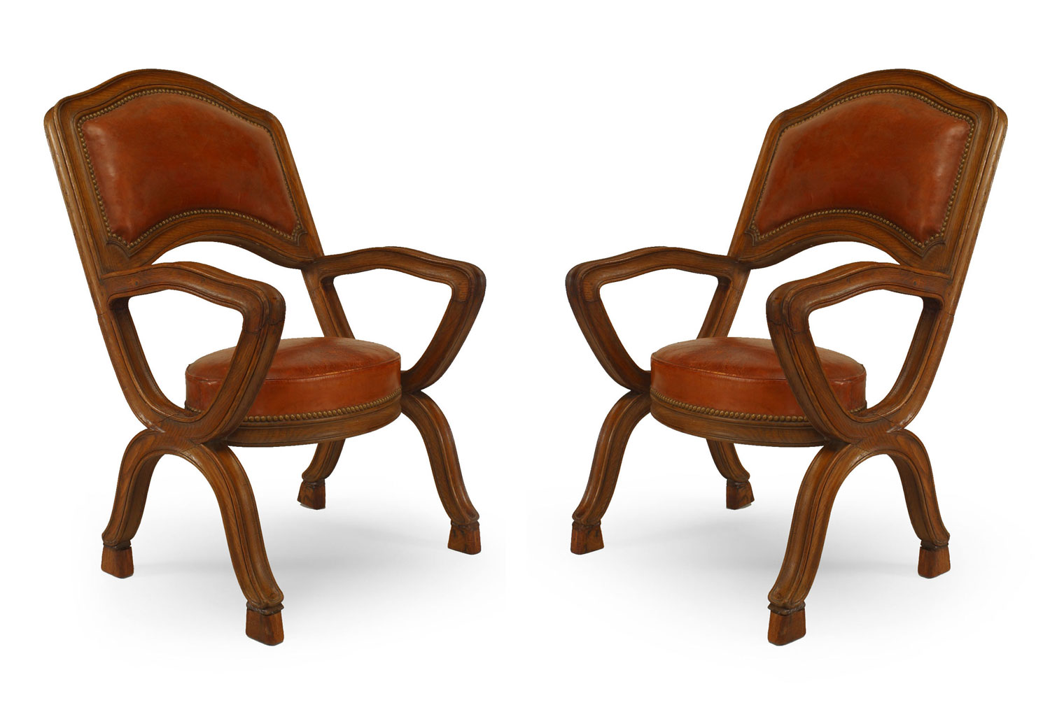 Set of 6 French Provincial (19th Cent) oak open arm chairs with "X" form legs supporting an oval leather seat and shaped back