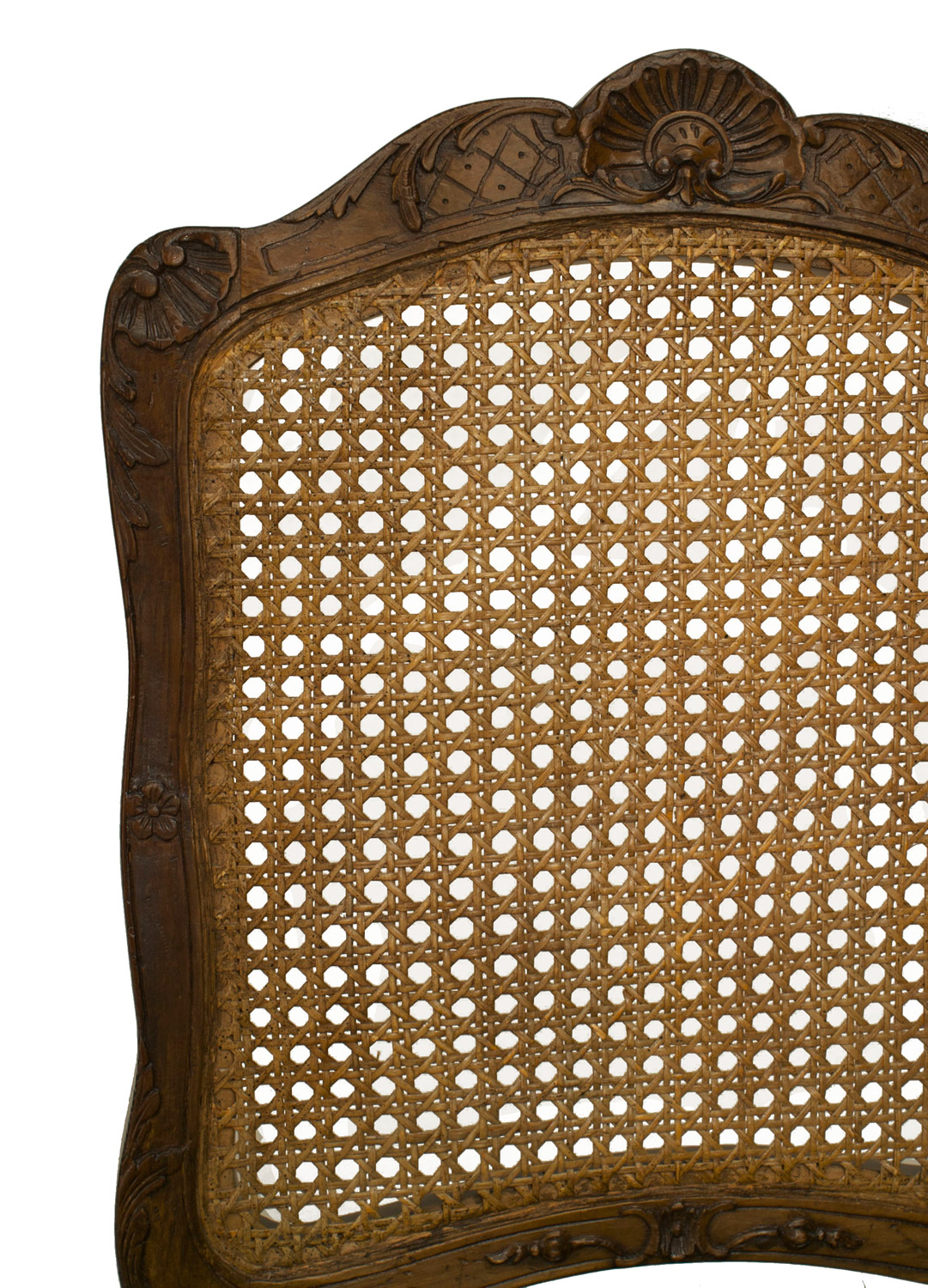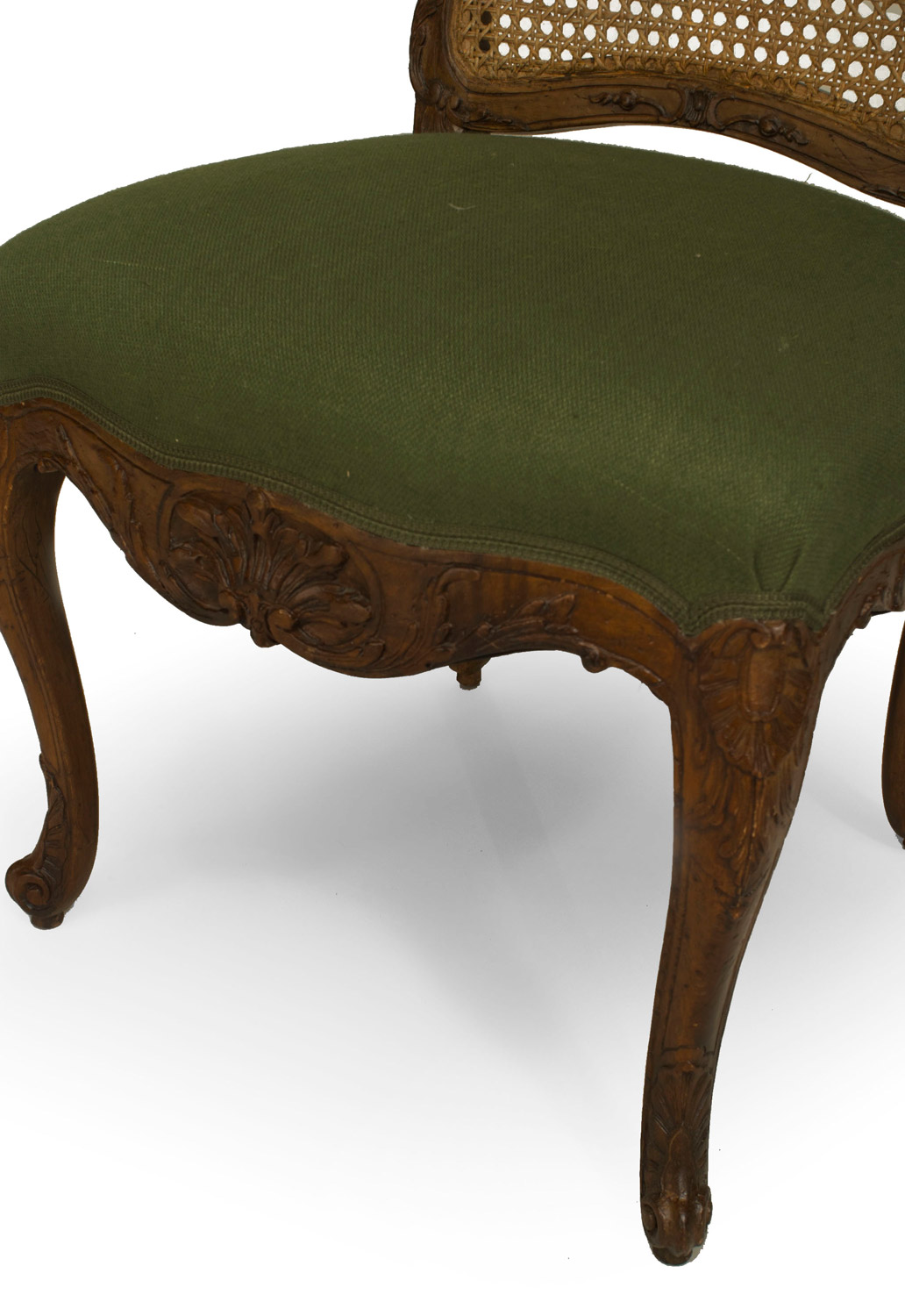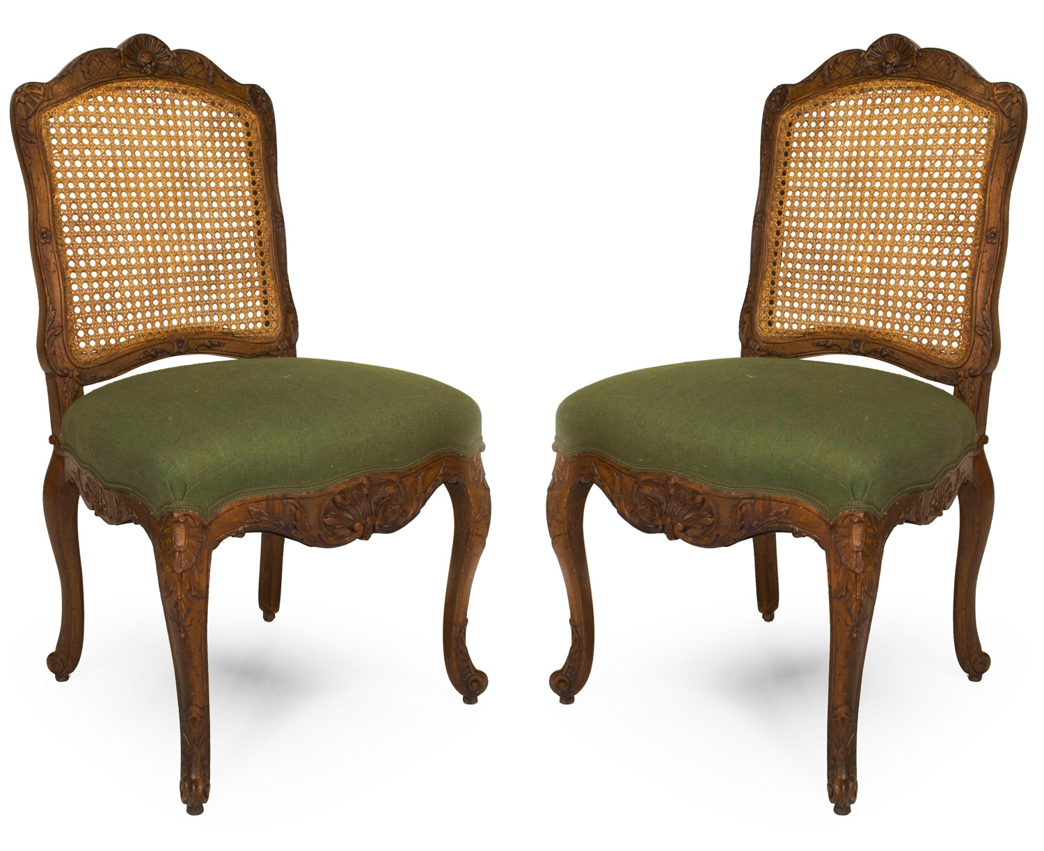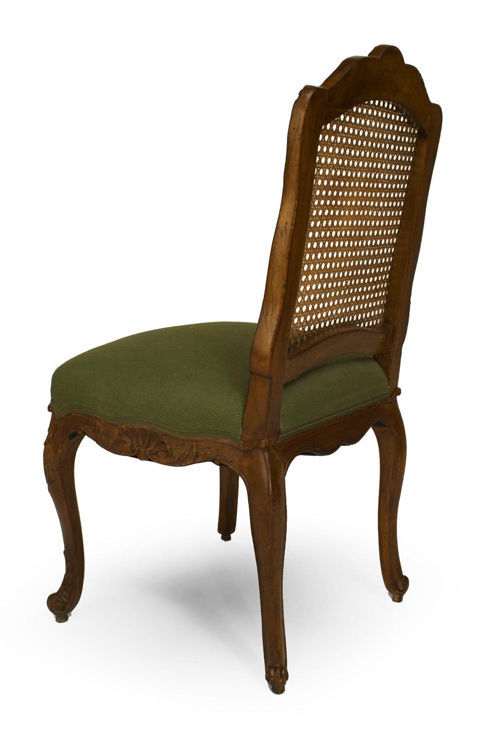 SET of 8 French Provincial Louis XV style (20th Cent) walnut carved side chairs with a shaped cane back and green upholstered seat.