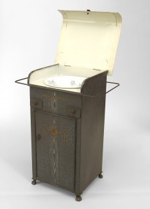French Provincial grey faux wood painted tole washstand with side bars and gold wreath decoration..