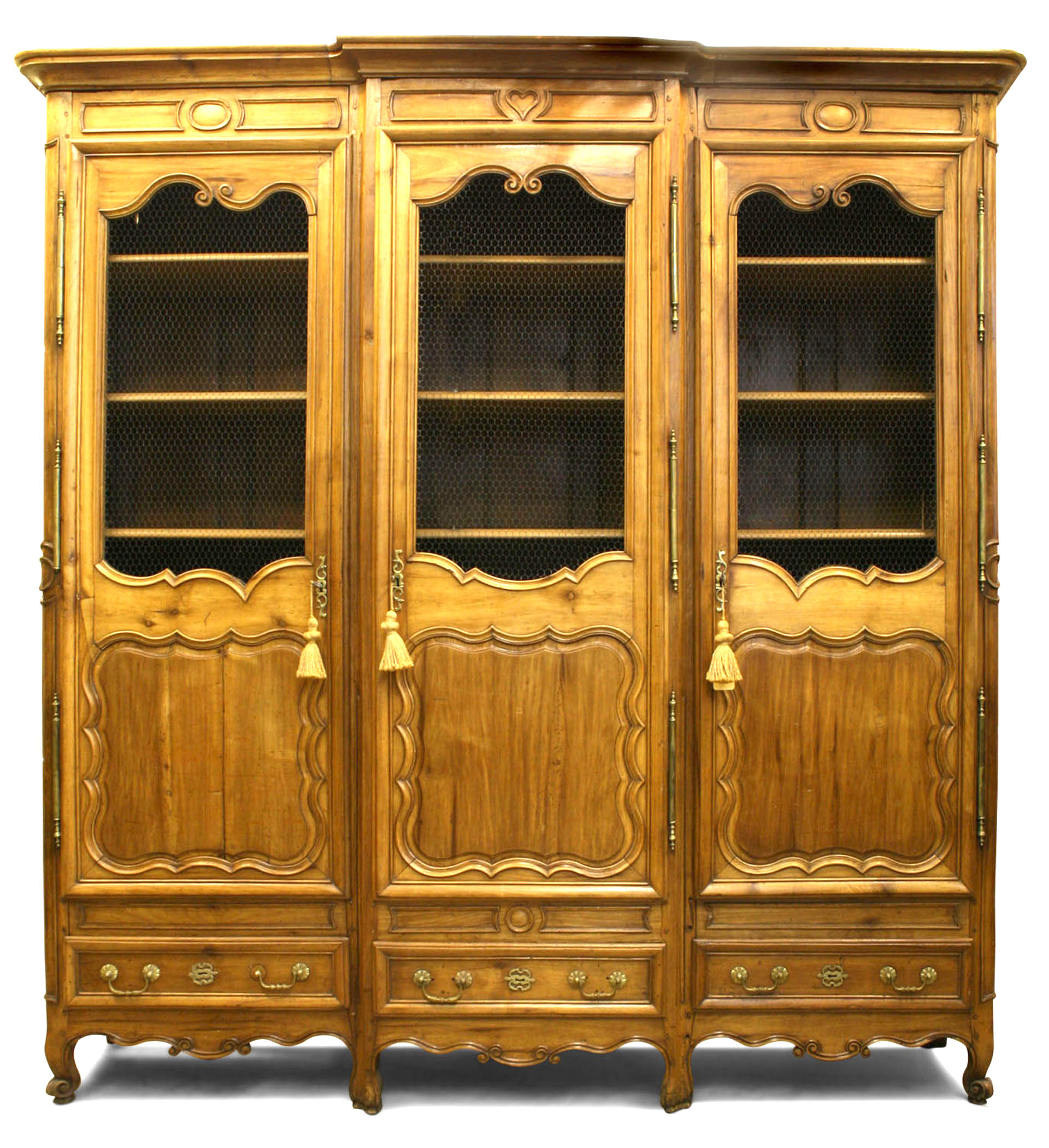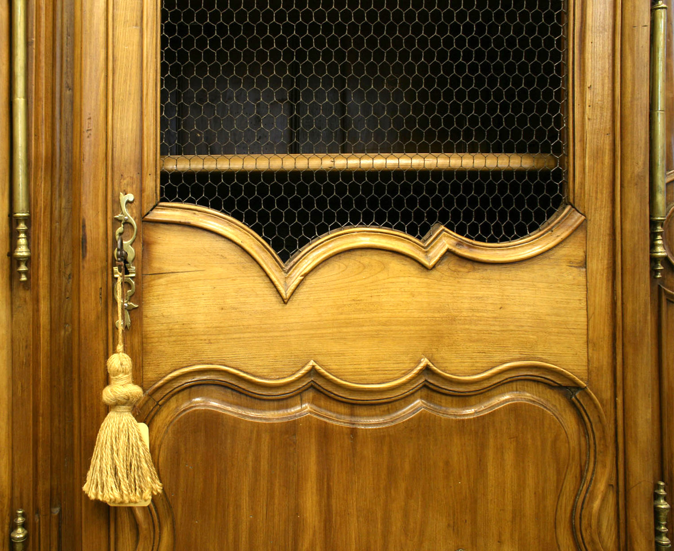 French Provincial (18/19th Century) walnut armoire cabinet with 3 drawers at bottom and doors with wire mesh panels..