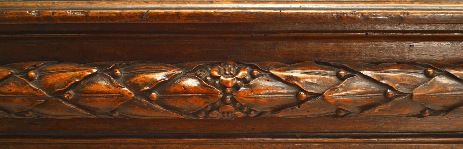 French Provincial (18th Century) walnut rectangular game table with carved wreath design apron supported on fluted legs..