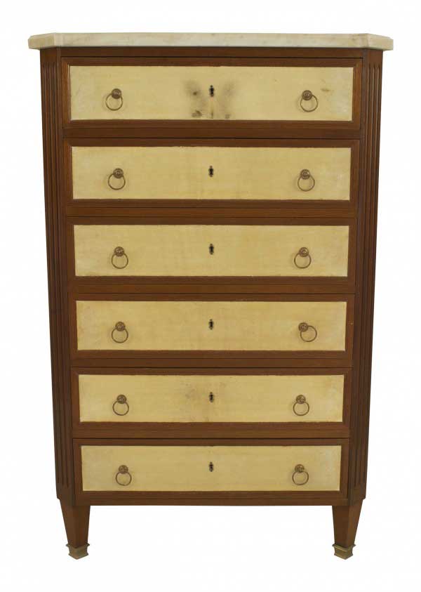 Style: French Materials & Techniques: Brass, carved, metal, painted, wood Category: Bedroom Distressed