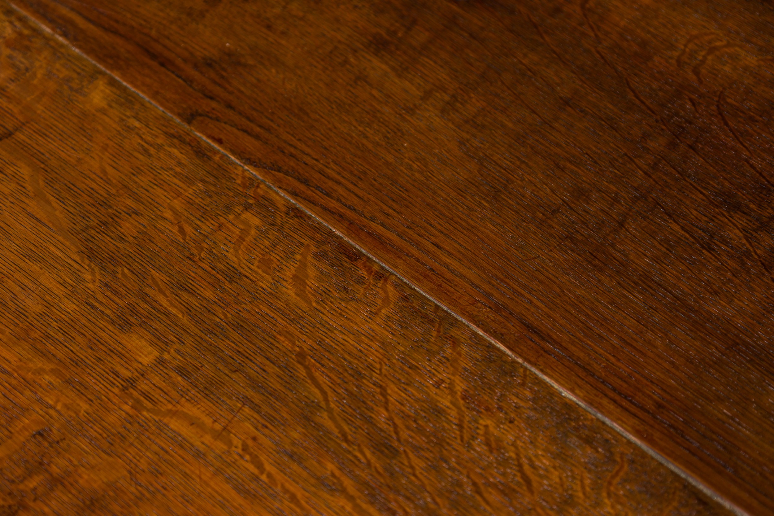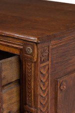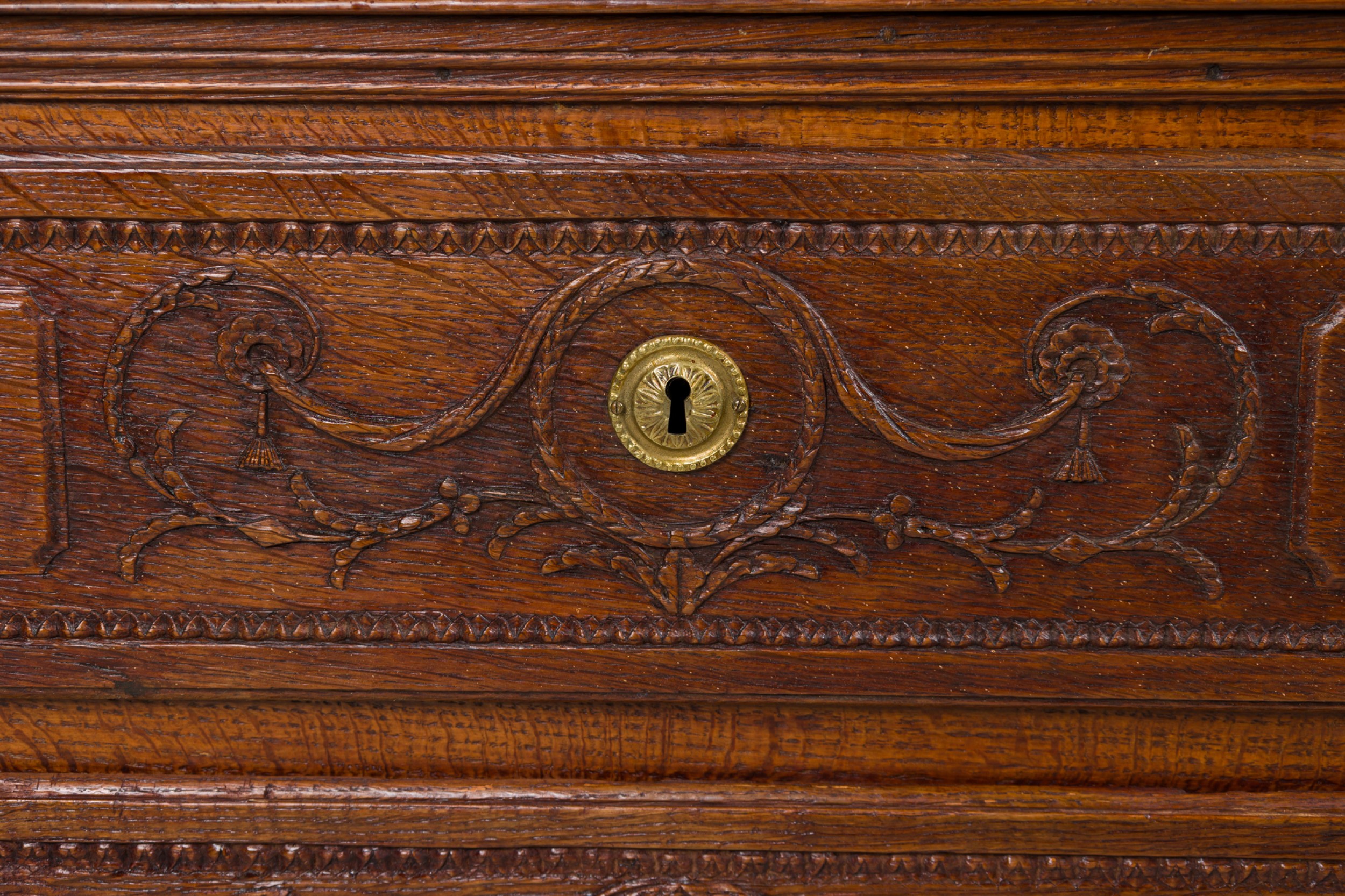 French Provincial (18th Century) dark stained oak chest with three drawers, each having carved wreath and border carved embellishments, two circular brass ring drawer pulls centering a brass keyhole, flanked by fluted carved column side with floral rosettes and resting on four square tapered legs.