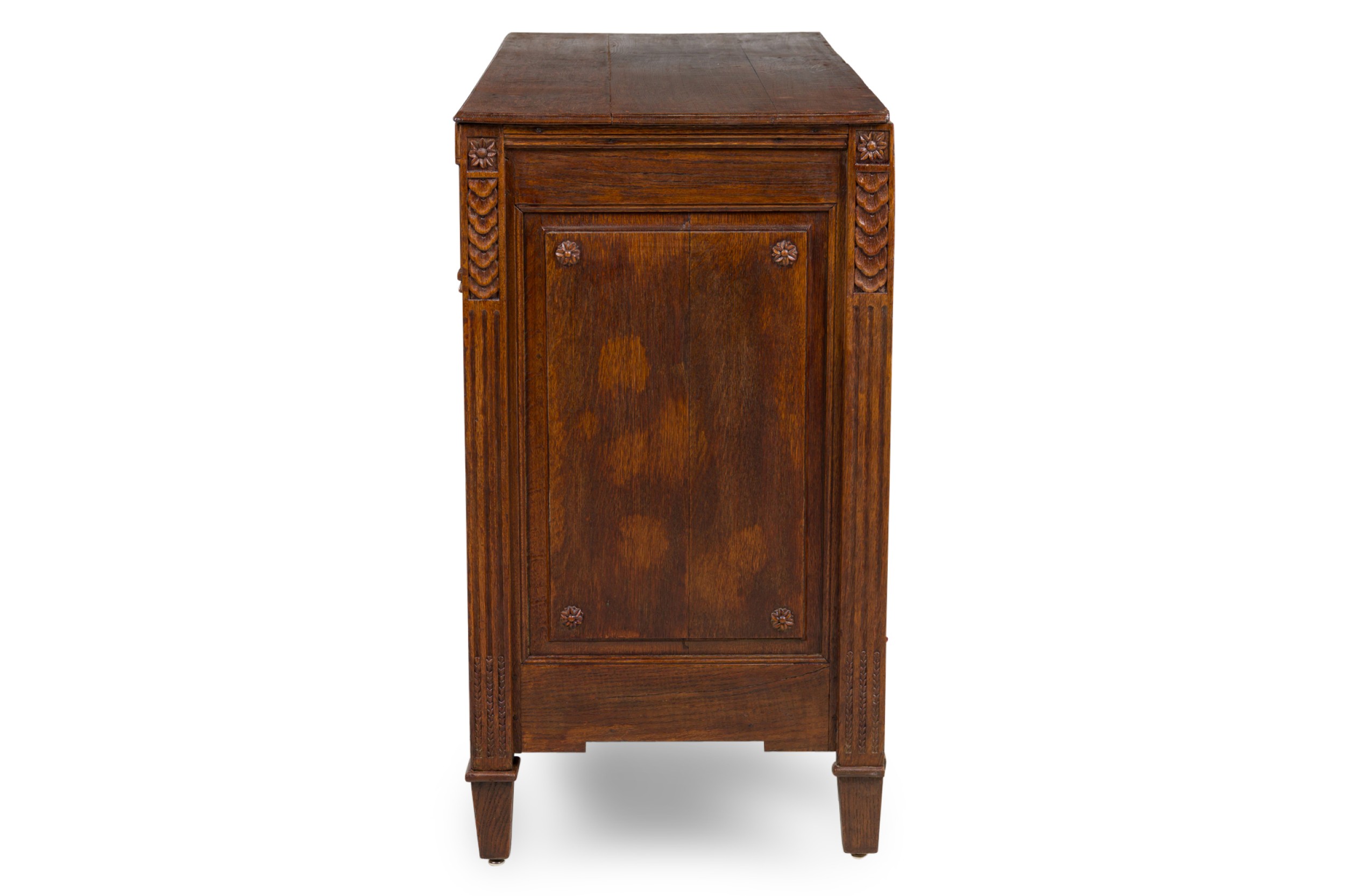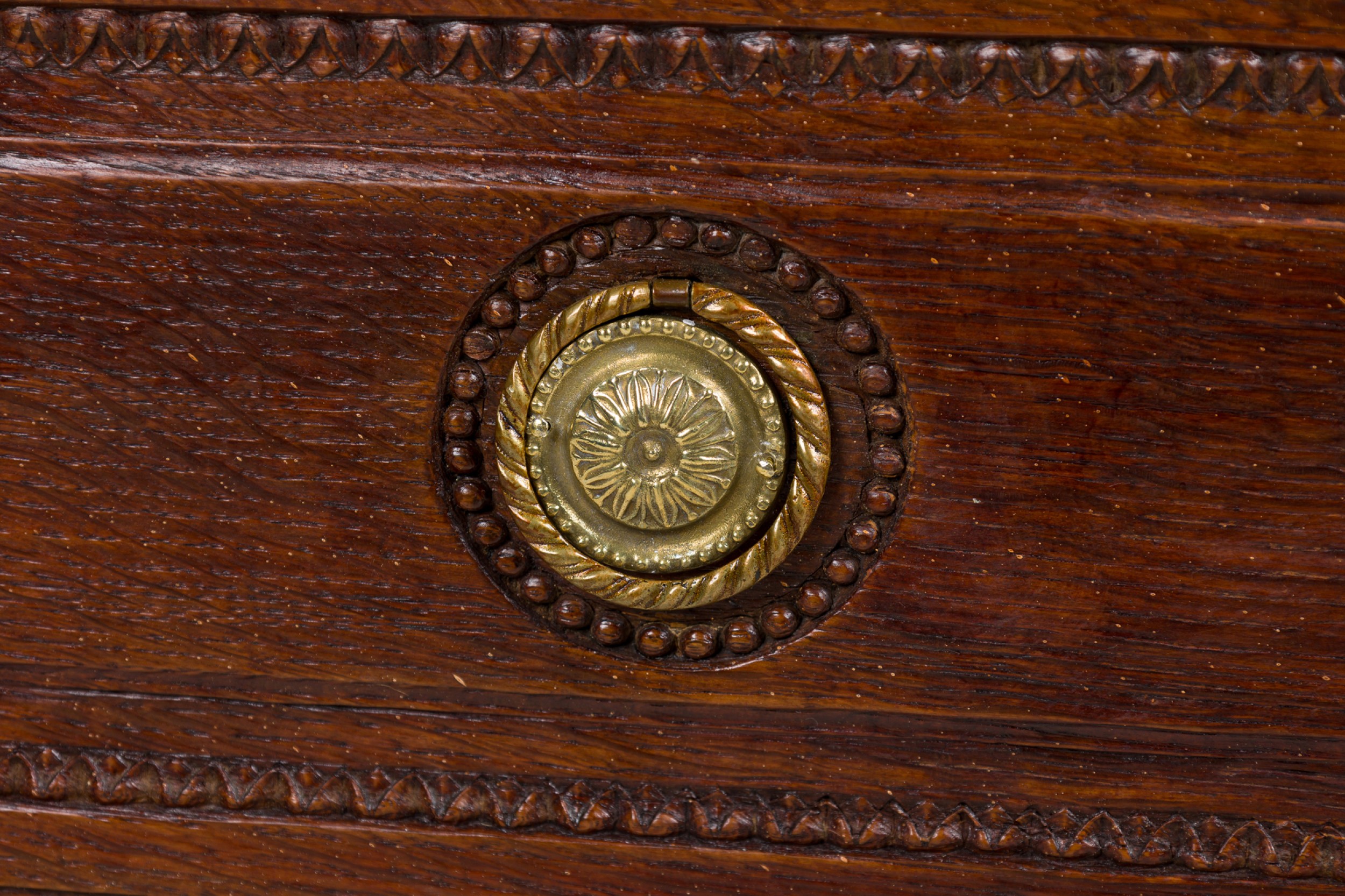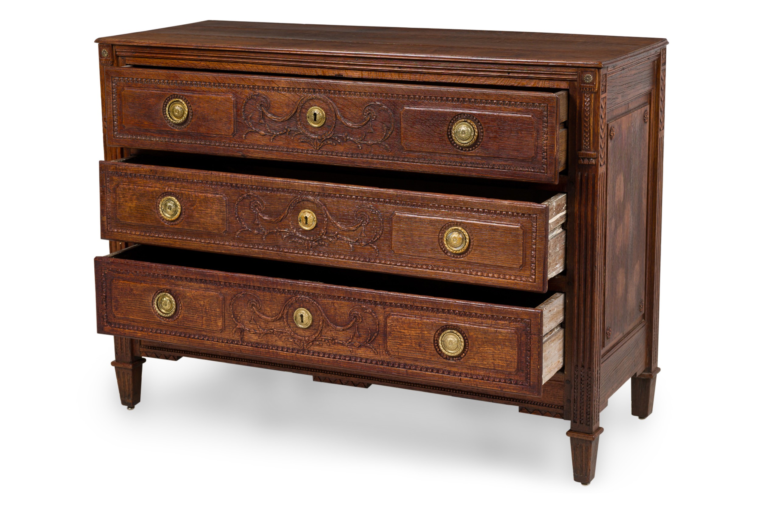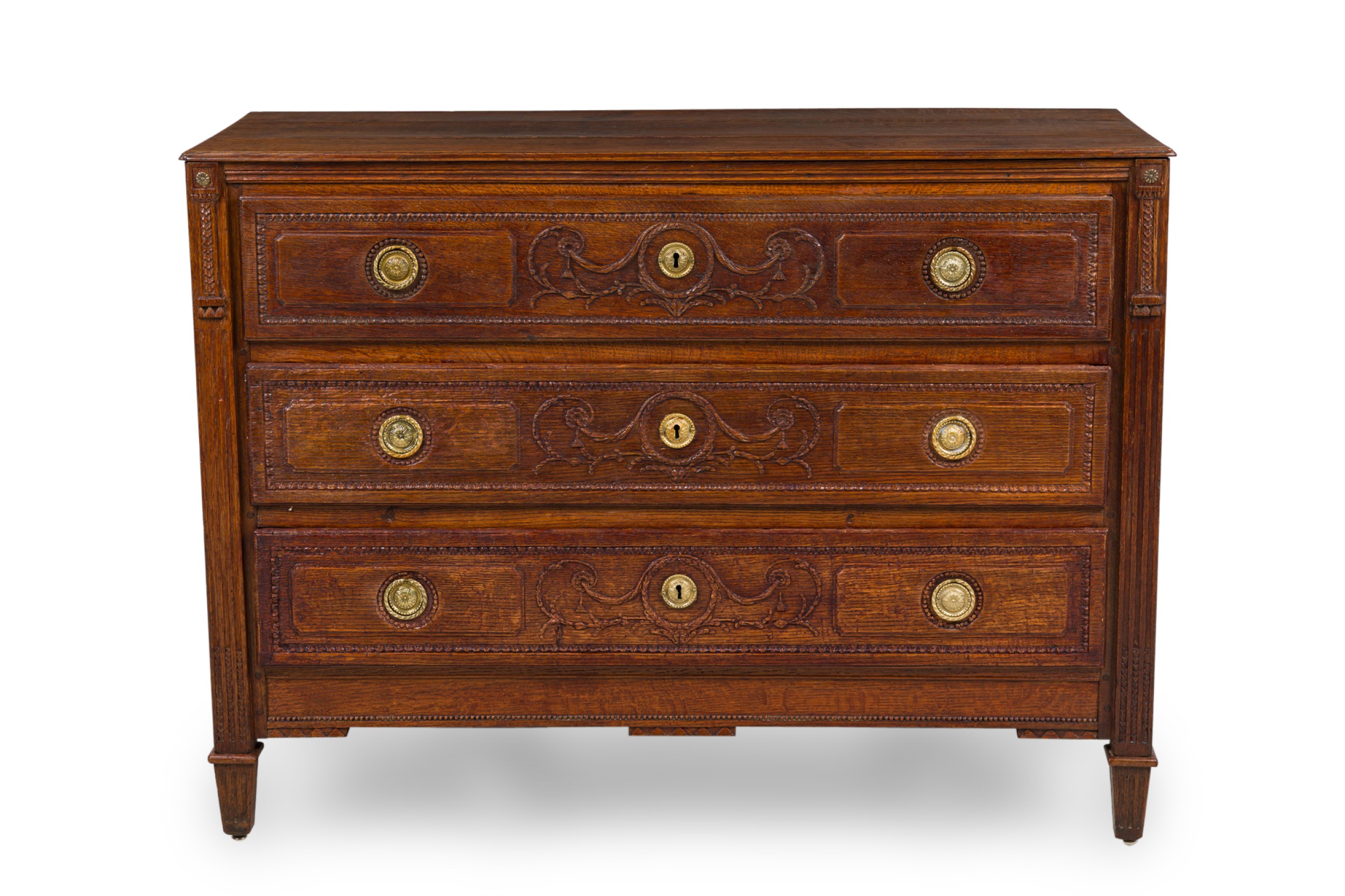 French Provincial (18th Century) dark stained oak chest with three drawers, each having carved wreath and border carved embellishments, two circular brass ring drawer pulls centering a brass keyhole, flanked by fluted carved column side with floral rosettes and resting on four square tapered legs..