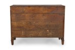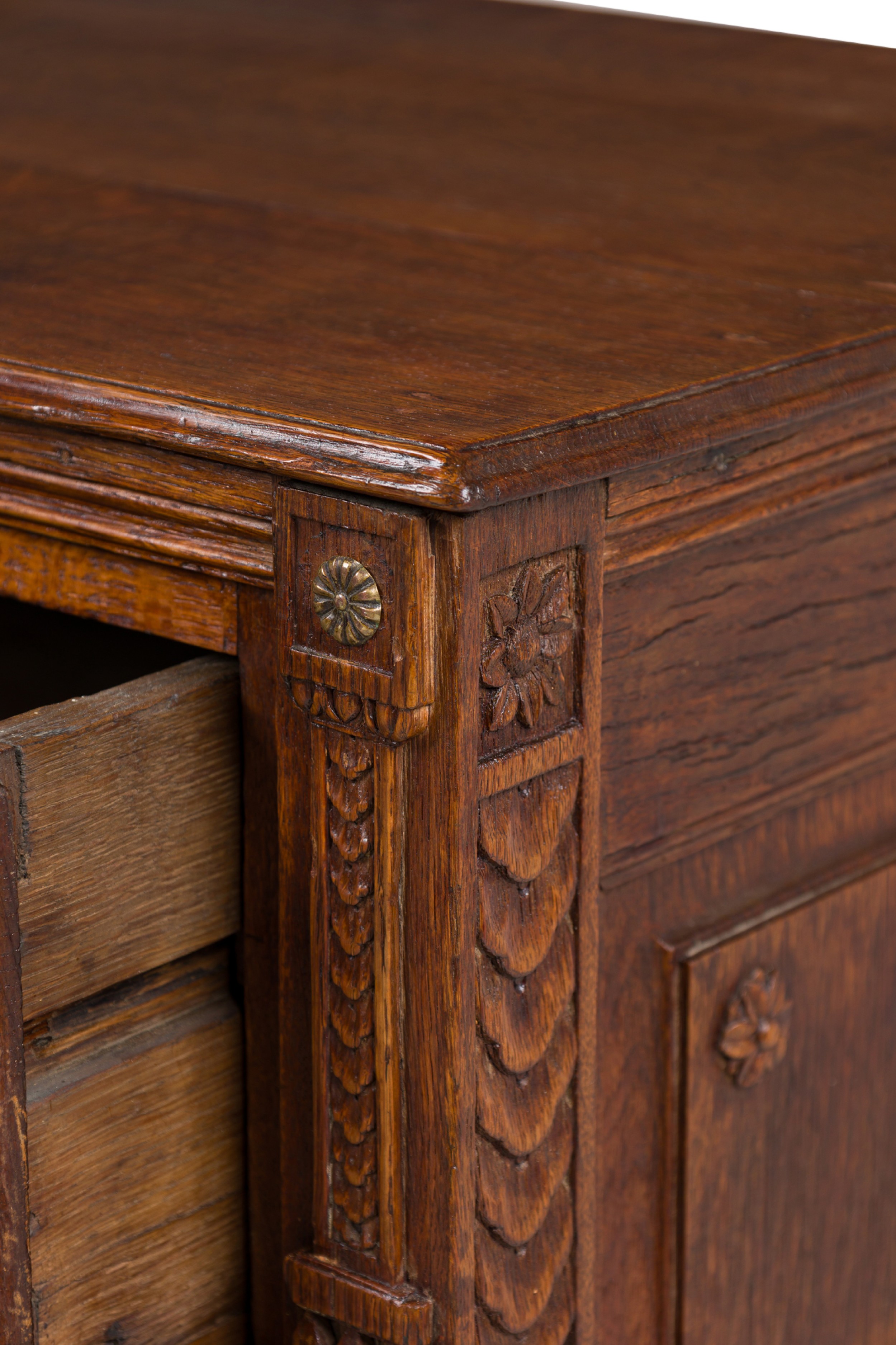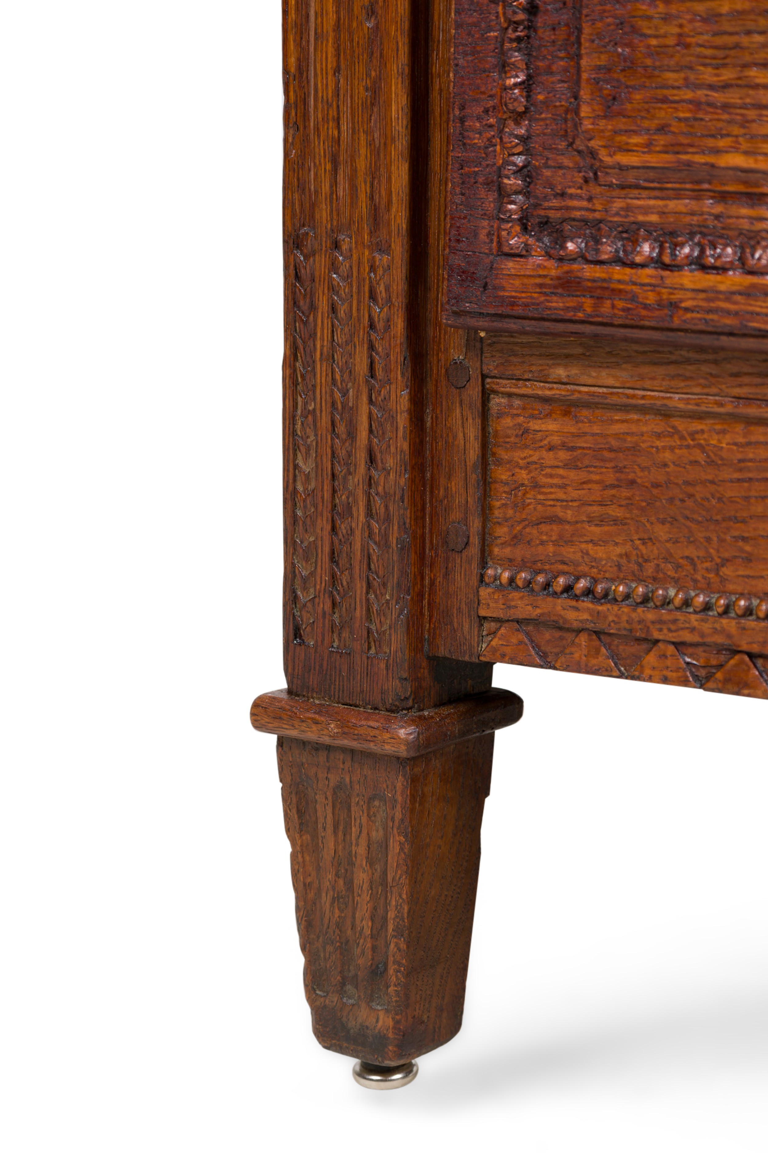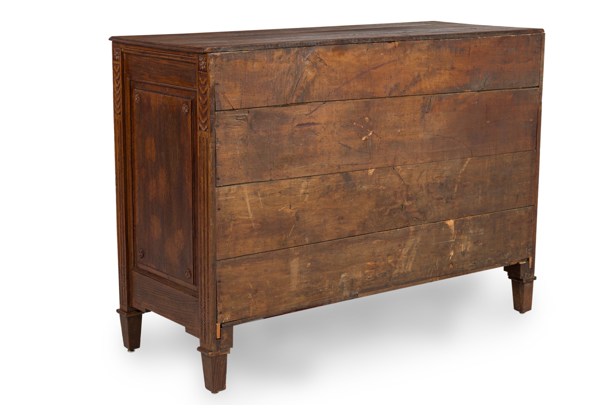 French Provincial (18th Century) dark stained oak chest with three drawers, each having carved wreath and border carved embellishments, two circular brass ring drawer pulls centering a brass keyhole, flanked by fluted carved column side with floral rosettes and resting on four square tapered legs..