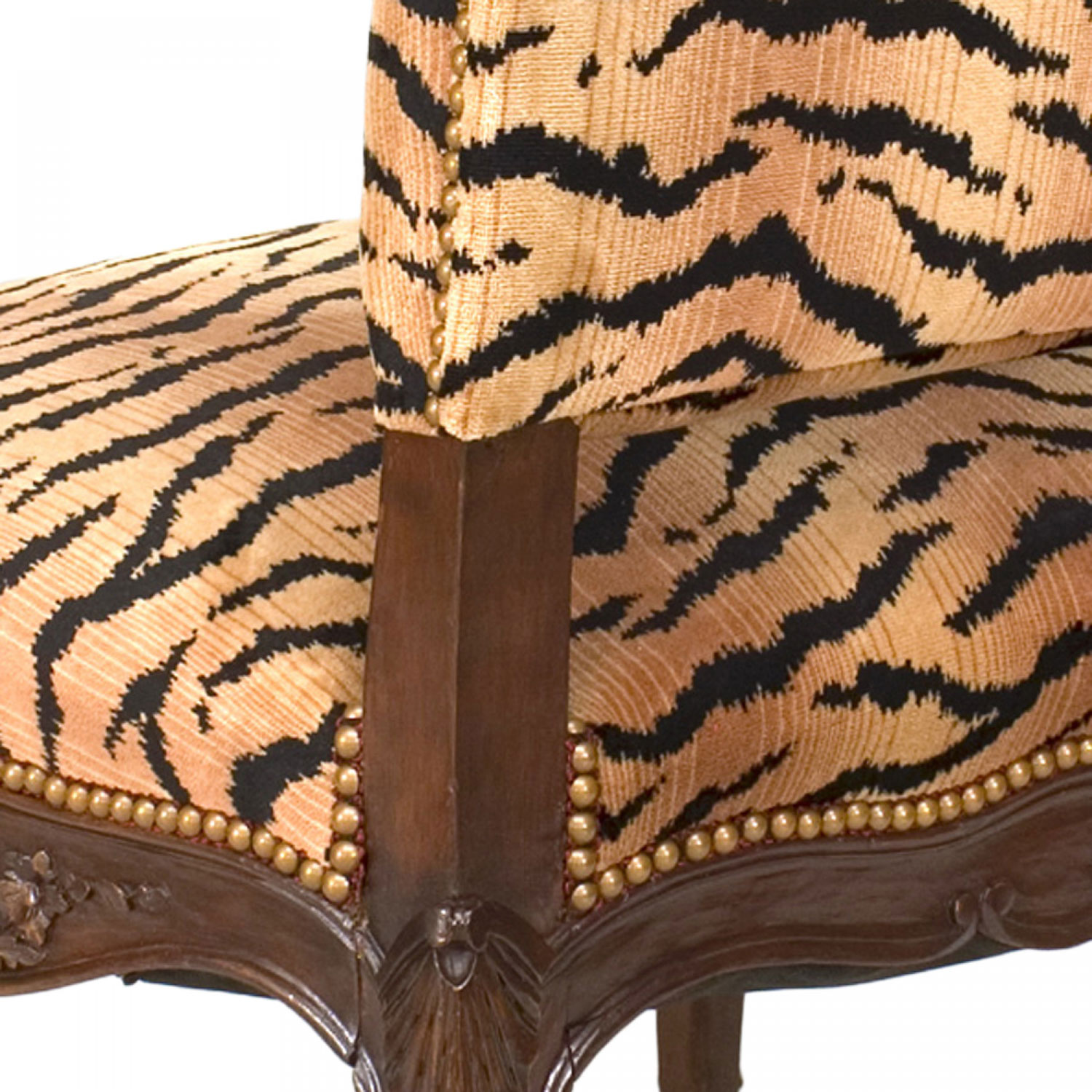 French Regence style (19th/20th Century) carved walnut open arm chair with faux tiger upholstered seat and back.