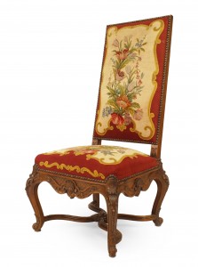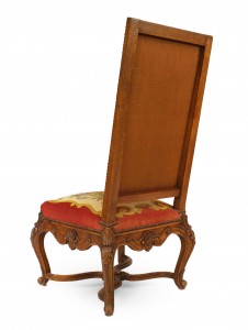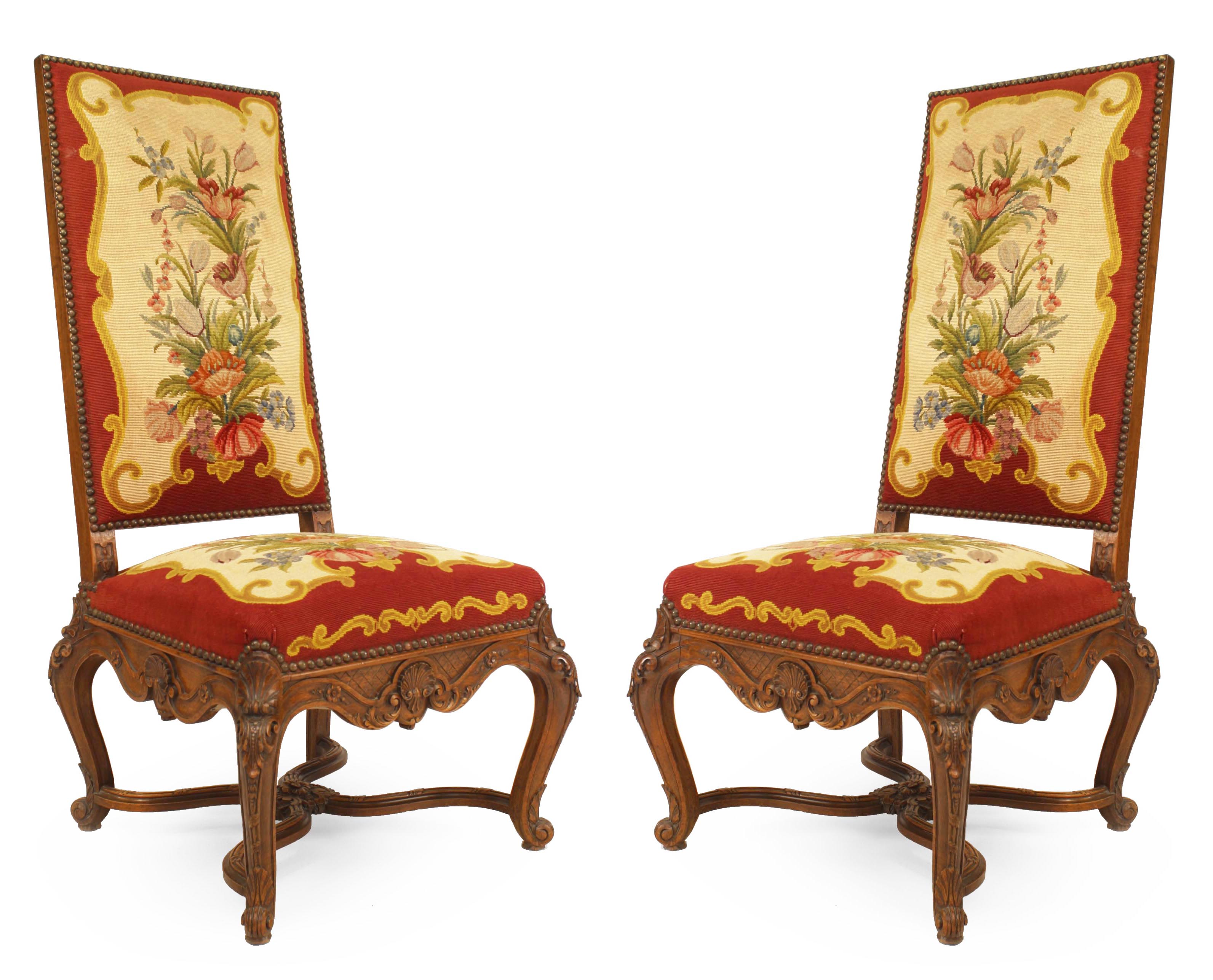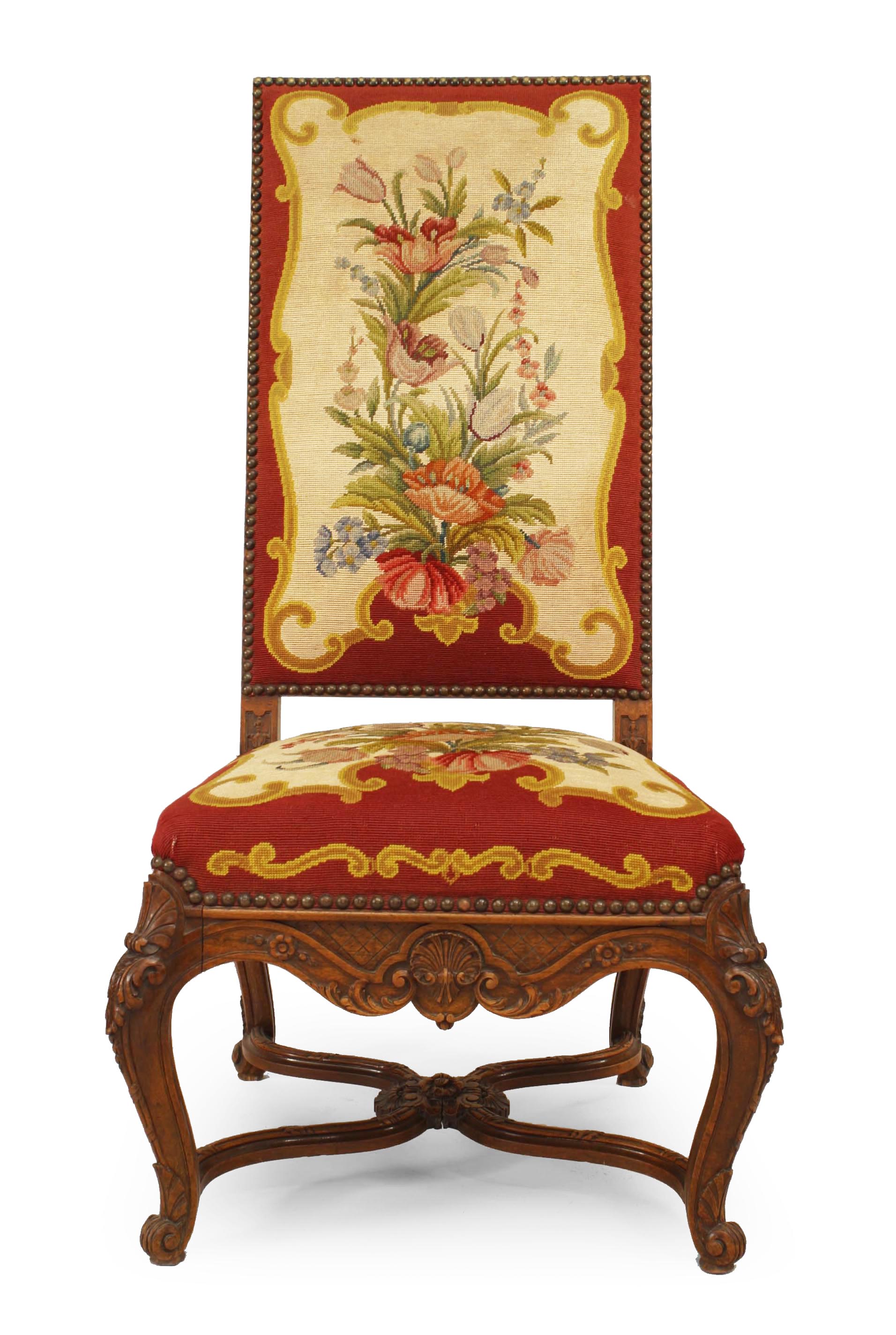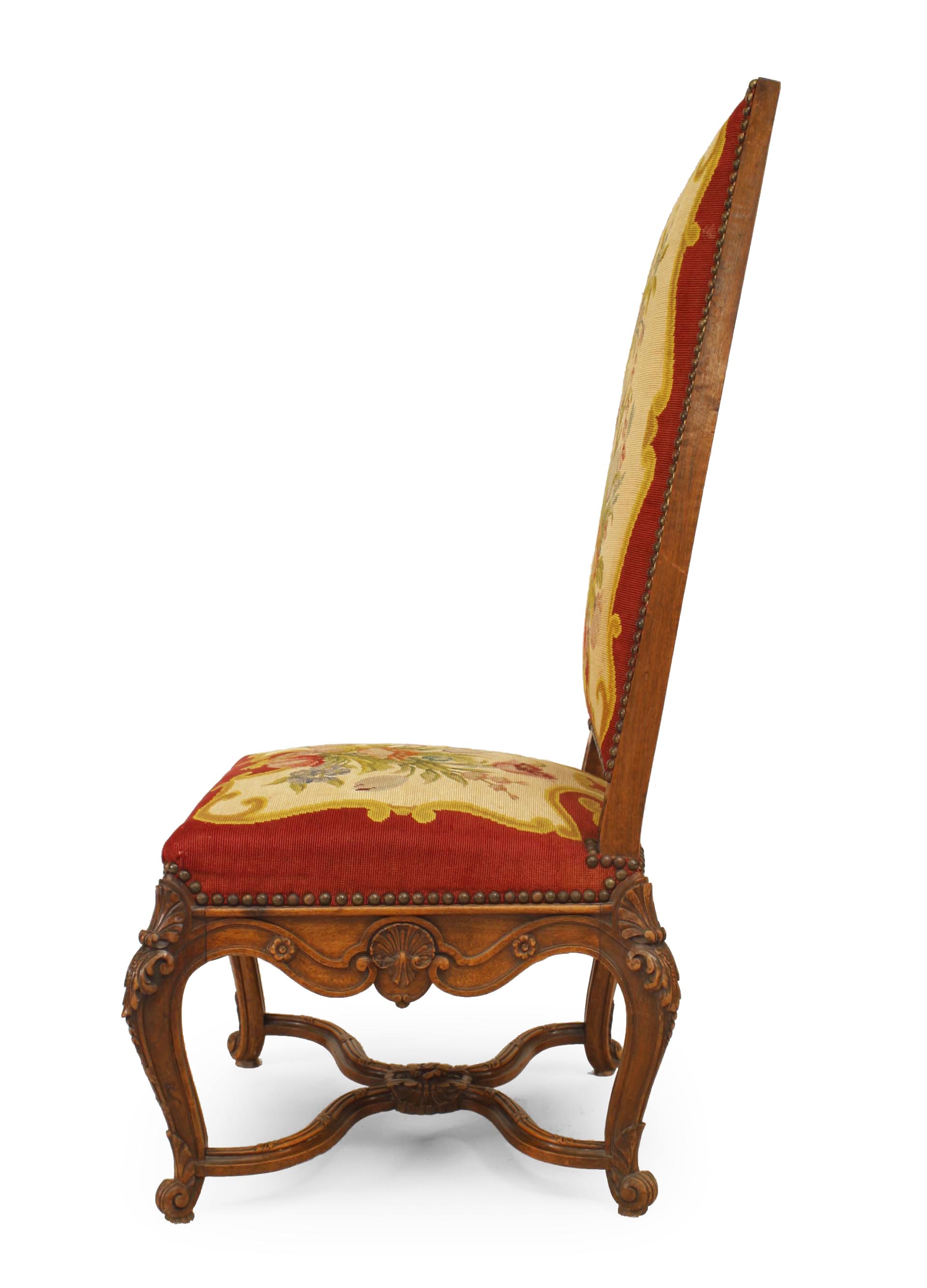 SET of 4 French Regence style (19th Cent) walnut high back side chairs with carved stretcher and upholstered red floral Aubusson seat and back..