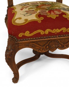 SET of 4 French Regence style (19th Cent) walnut high back side chairs with carved stretcher and upholstered red floral Aubusson seat and back.