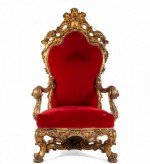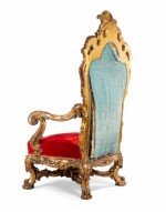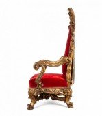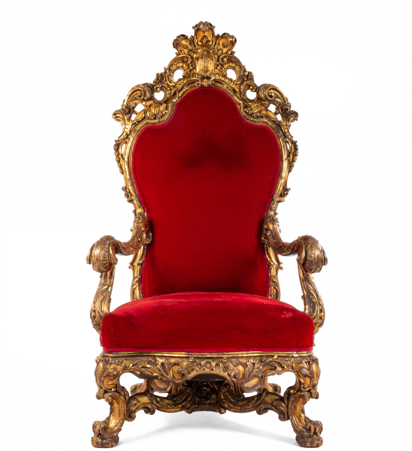 French Regence style (19th Cent) gilt throne chair with carved back crest and stretcher with red velvet upholstery