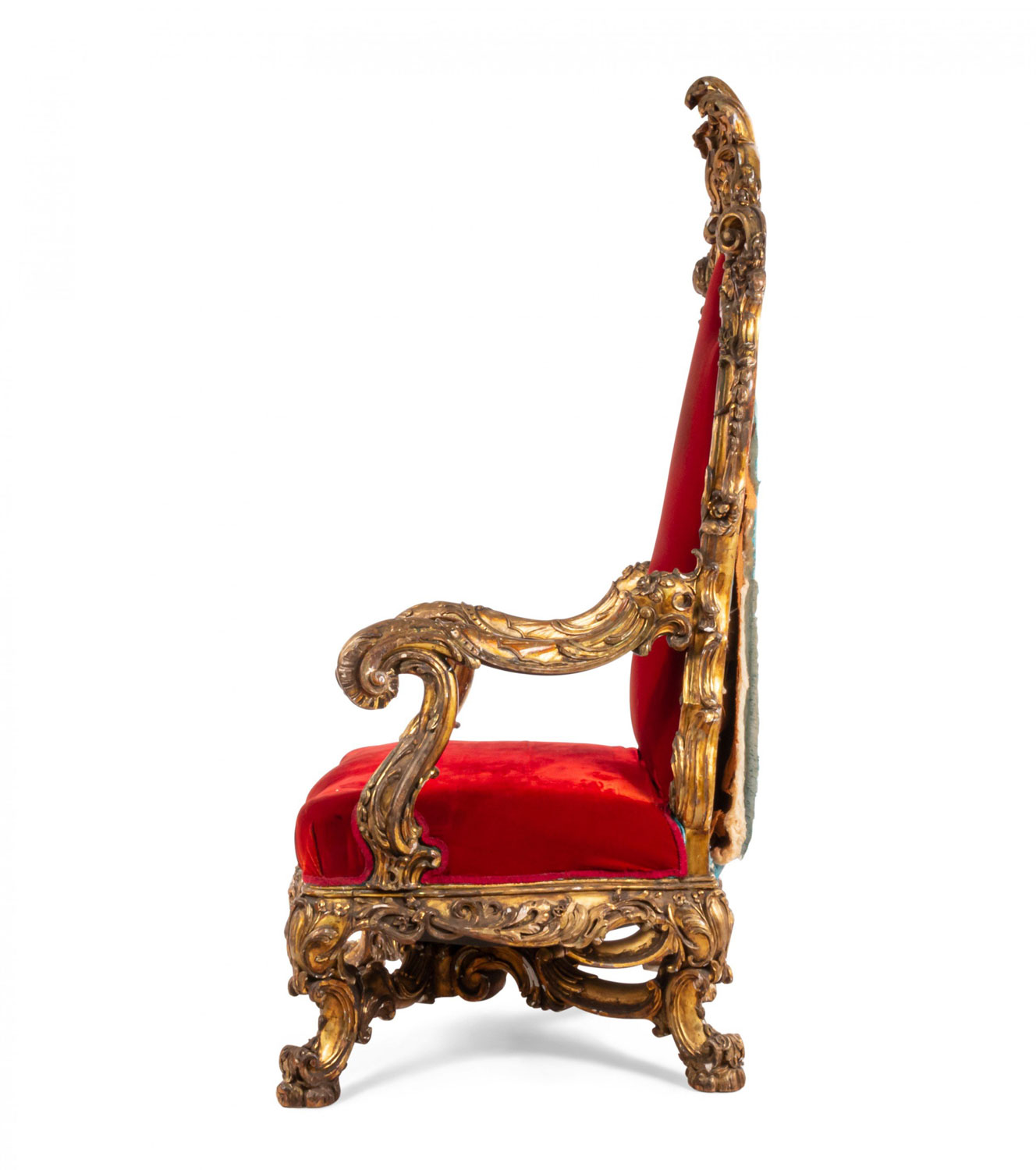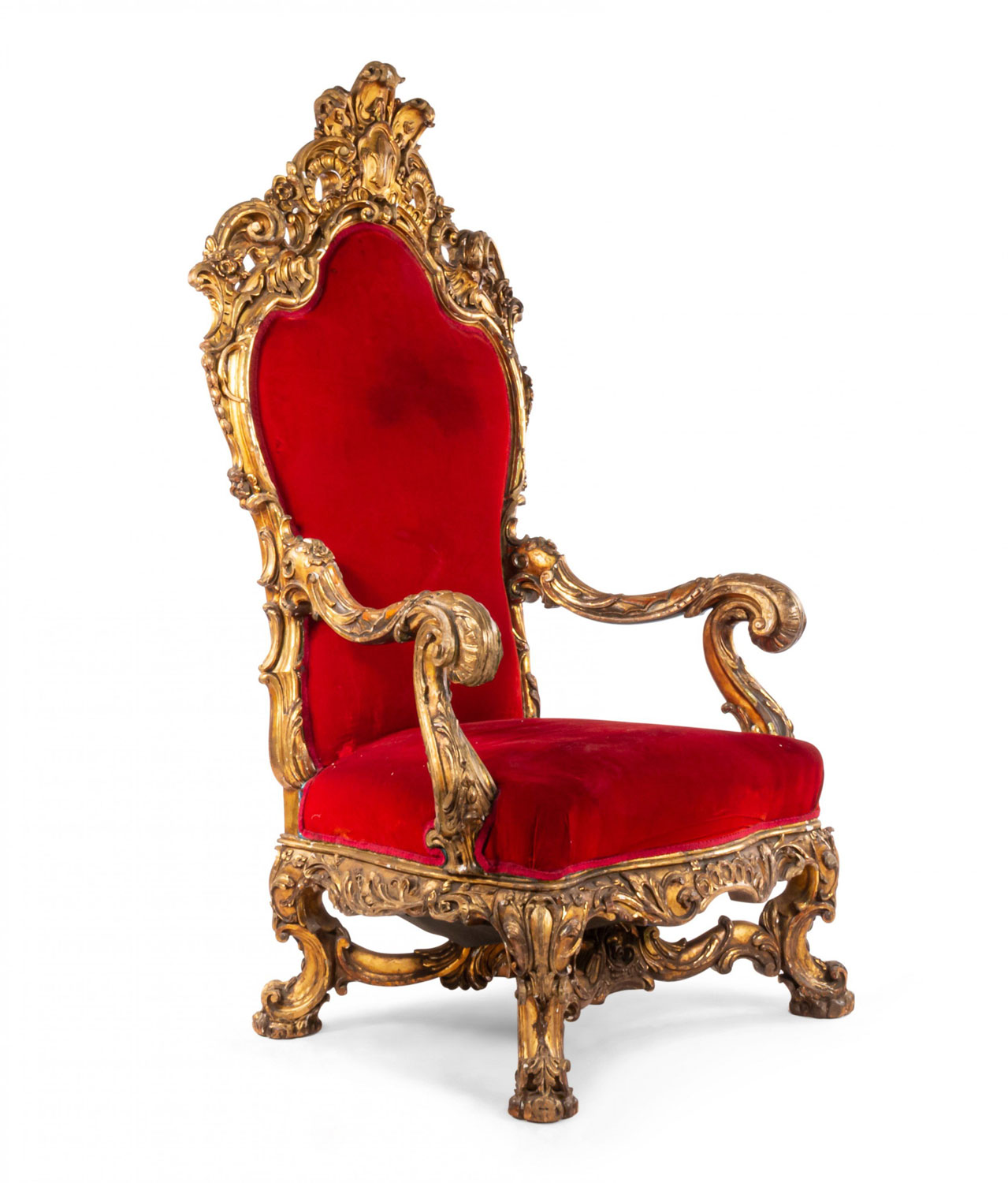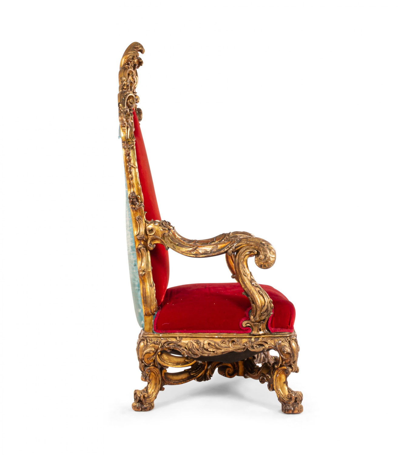 French Regence style (19th Cent) gilt throne chair with carved back crest and stretcher with red velvet upholstery.