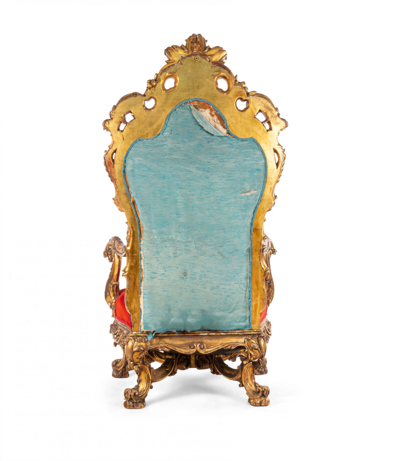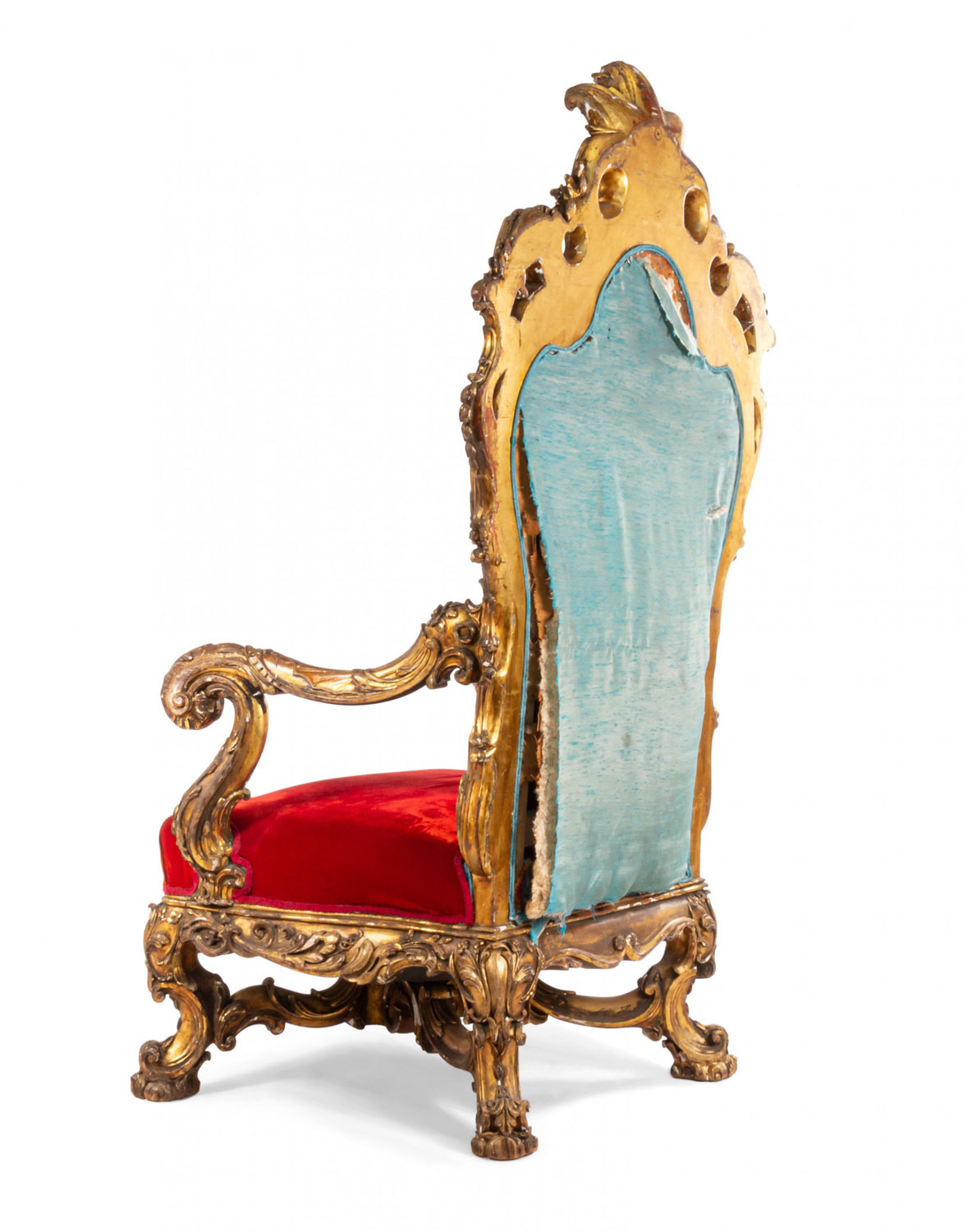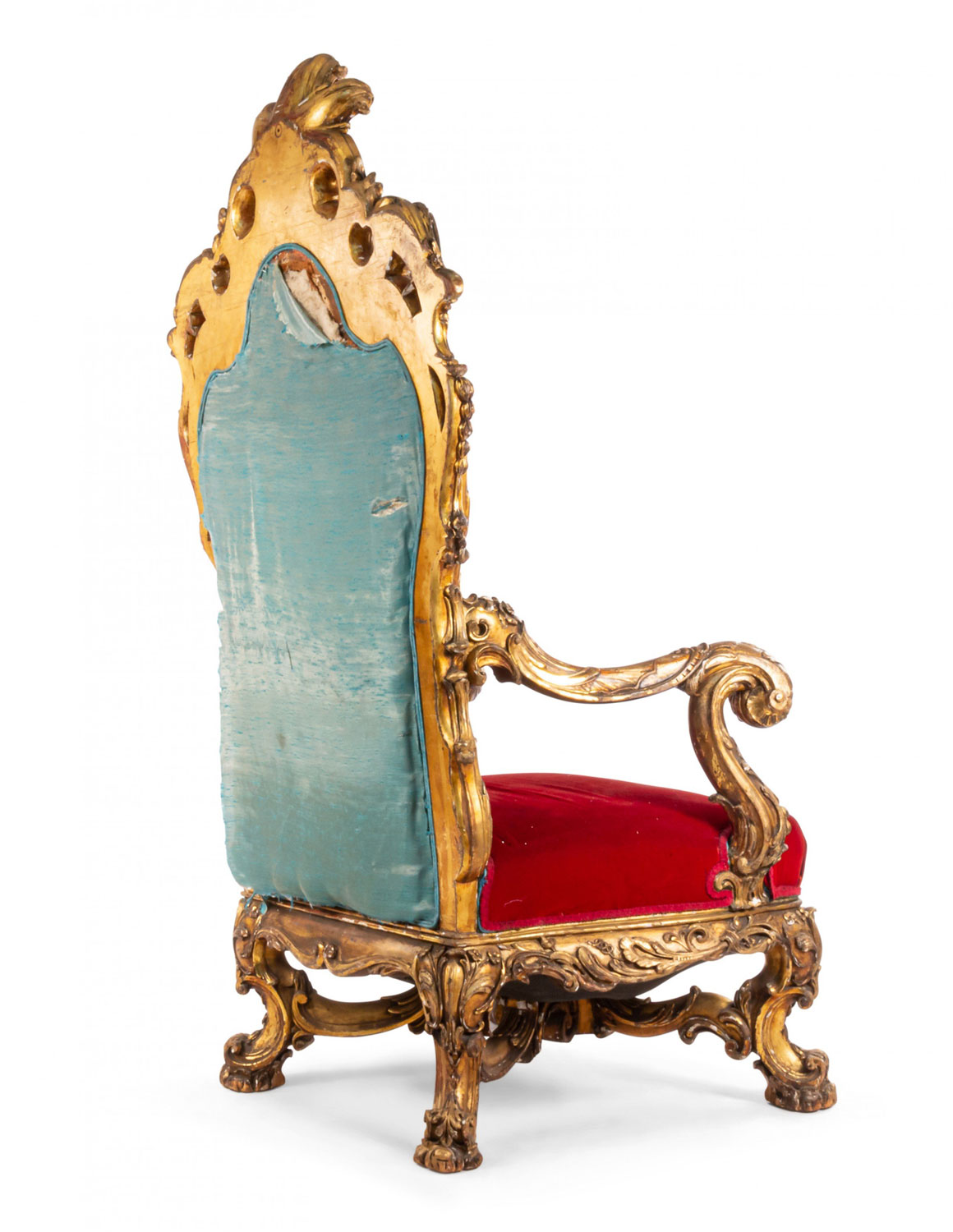 French Regence style (19th Cent) gilt throne chair with carved back crest and stretcher with red velvet upholstery.