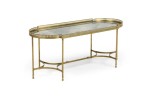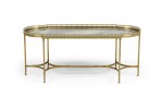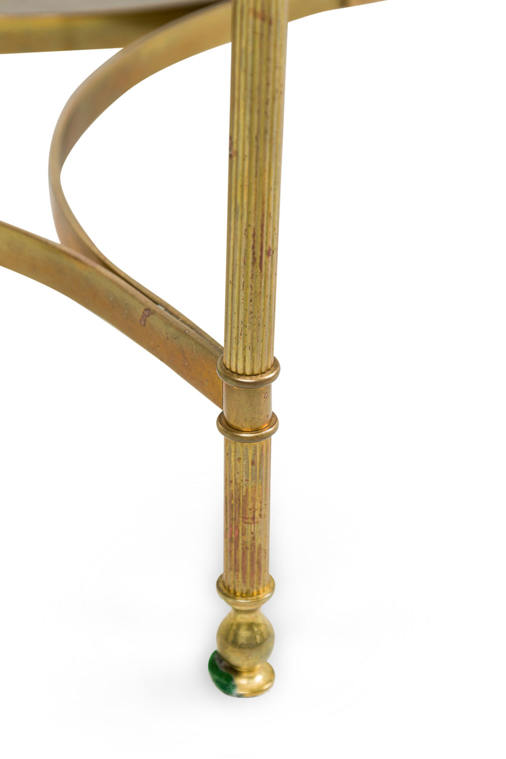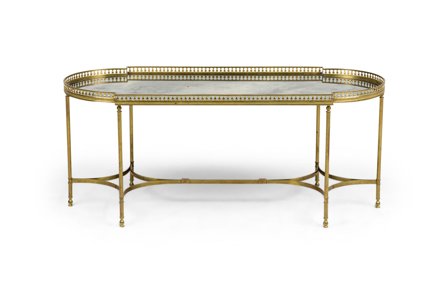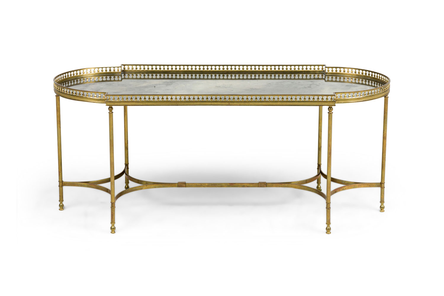 French Hollywood Regency style smoked glass oval shaped coffee table with a brass gallery rail surrounding a smoked glass top resting on a brass base with fluted legs and double diamond shaped stretcher