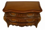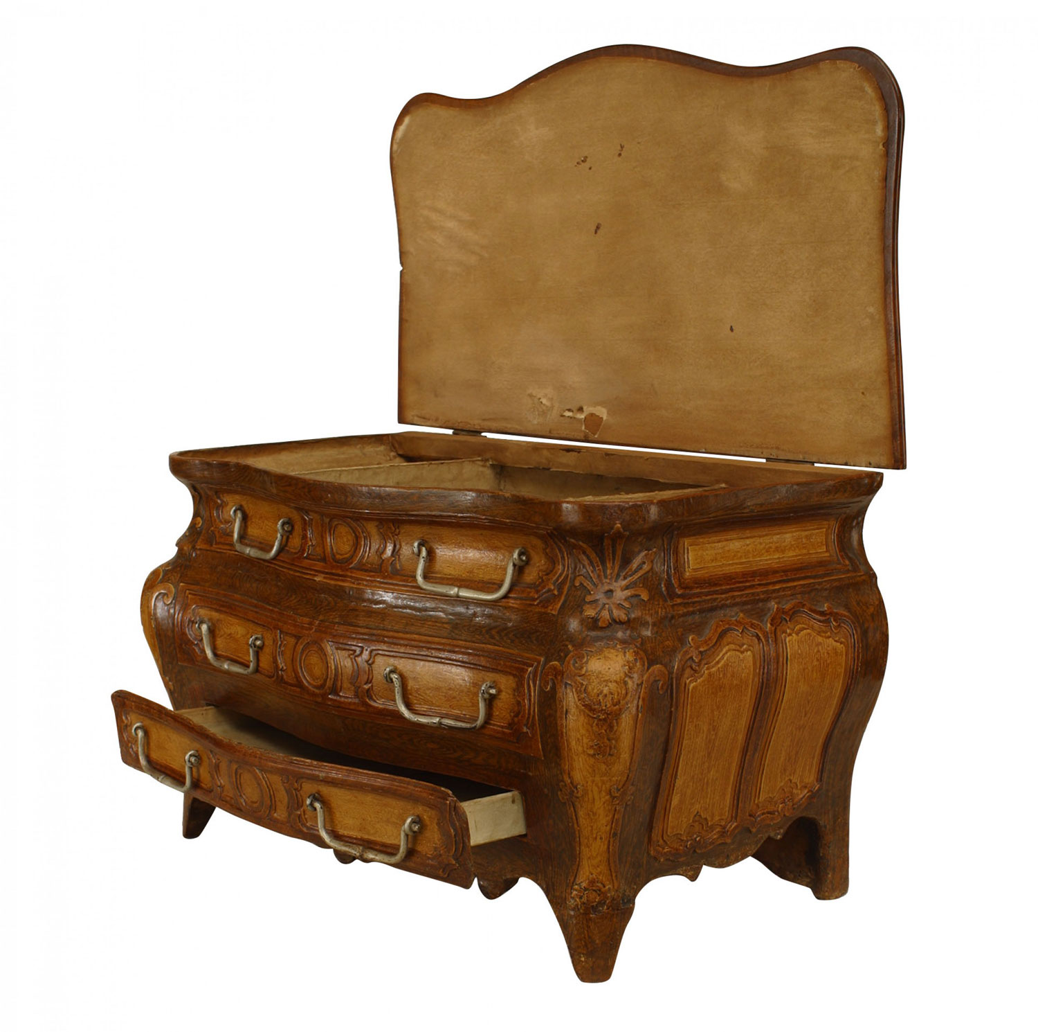 French Regency style (1st qtr 19th Cent) faux bois mahogany miniature bombe commode form box with a hinged top and 2 faux and 1 long drawer.