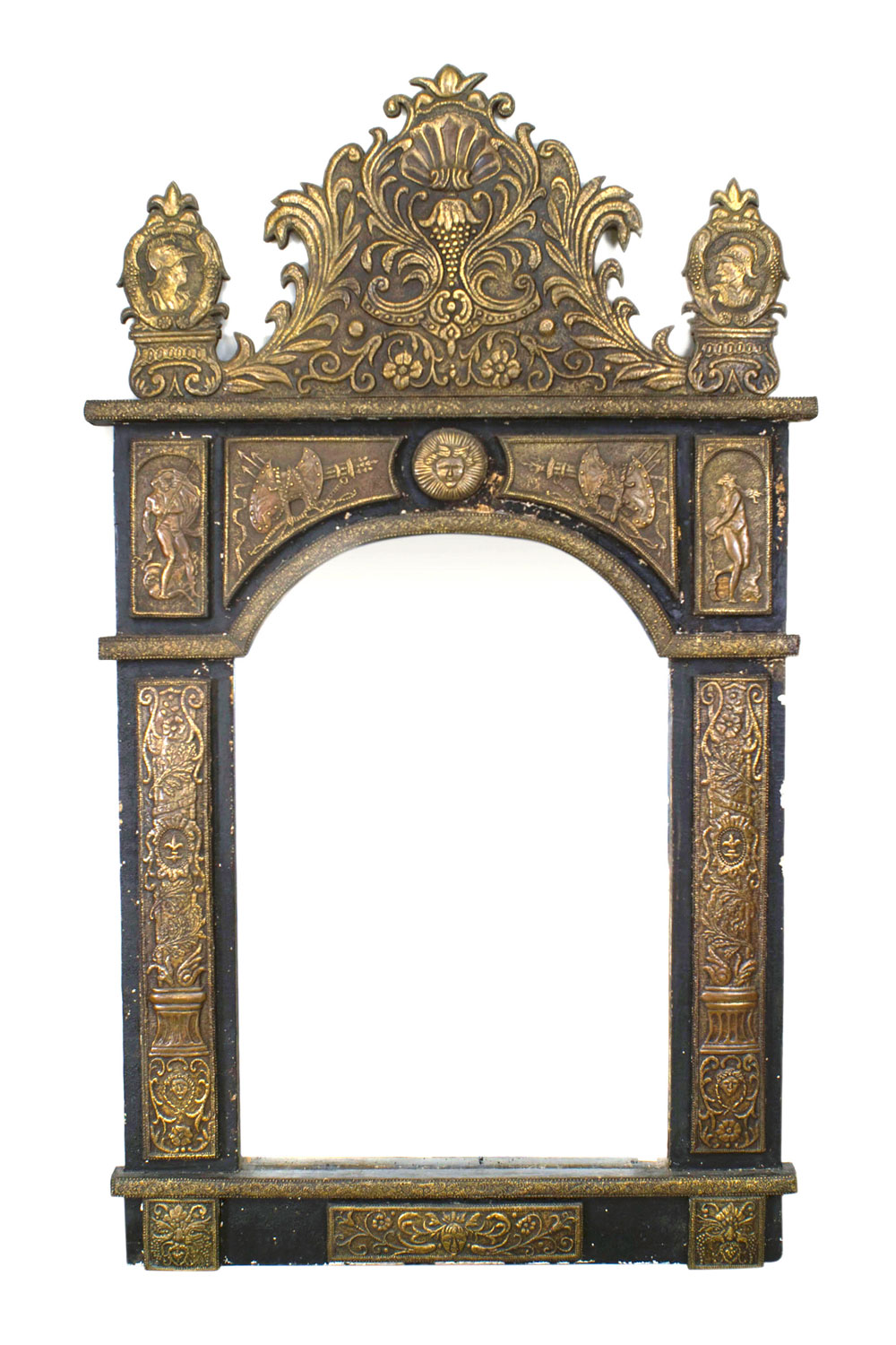 French Renaissance-style (19th Century) brass embossed repose wall mirror in an ebonized frame with Renaissance-style figures and motifs, an arch form mirror, and a pediment top..