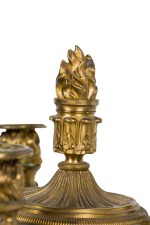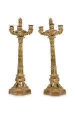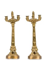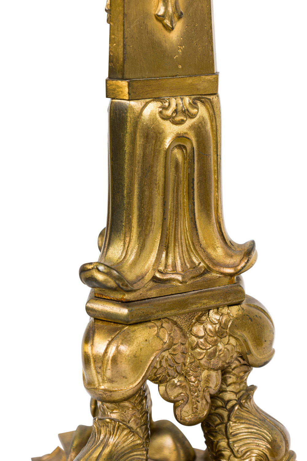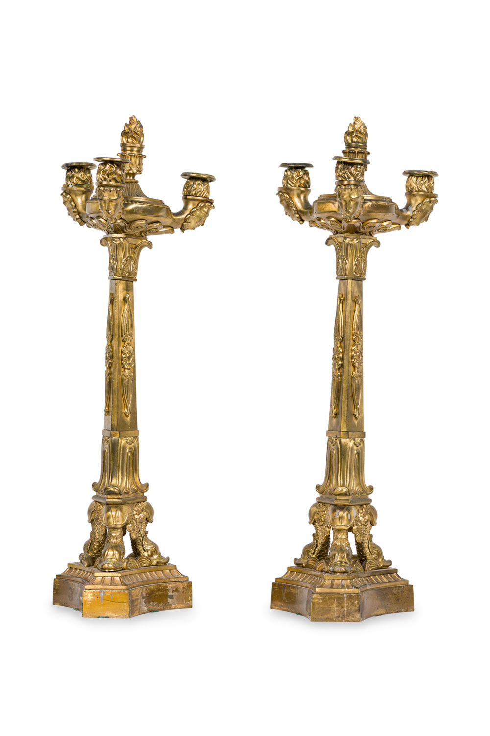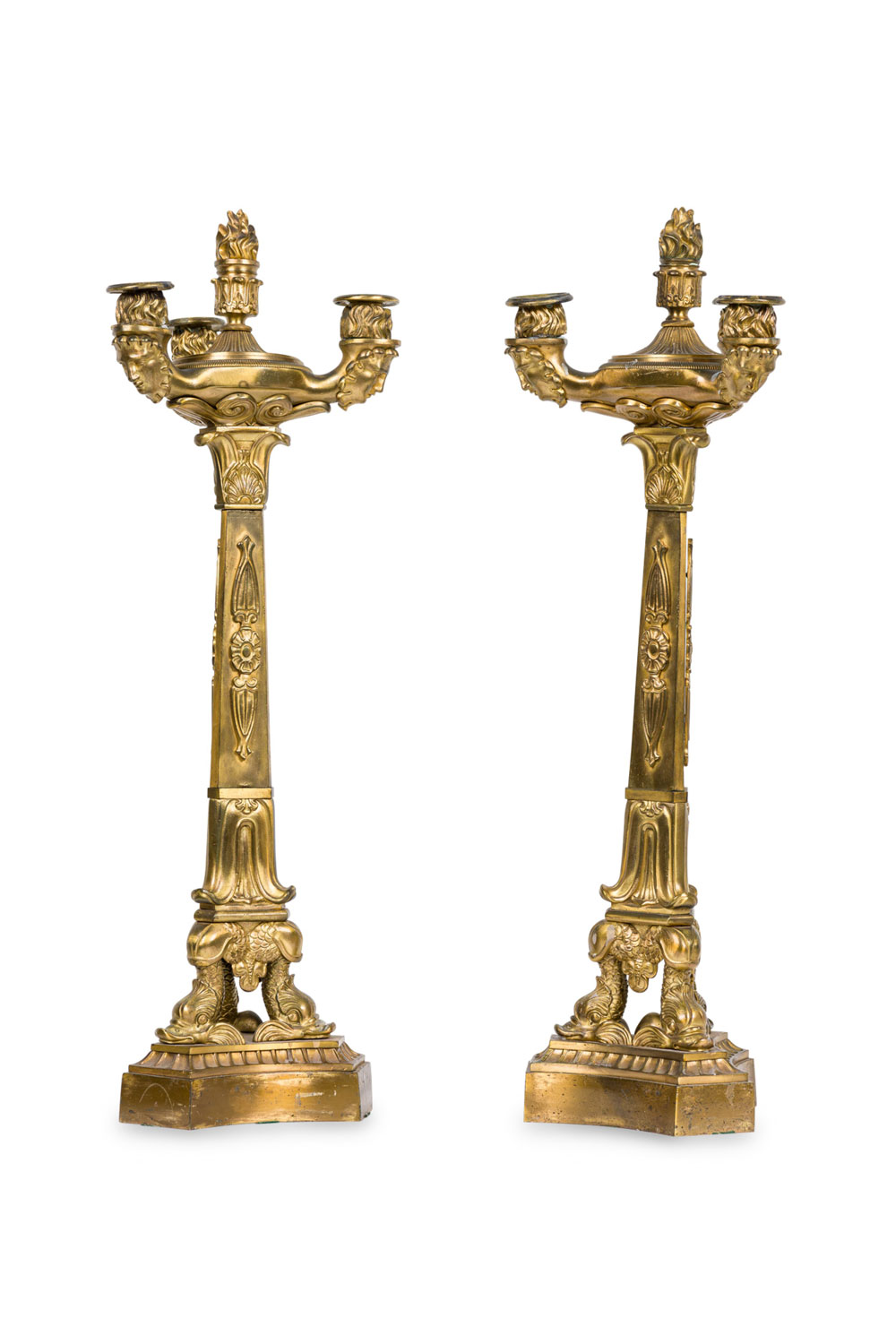 PAIR of French Restoration (1st Half 19th Century) gilt bronze three-light candelabras with a flame finial top, resting on 3 dolphin legs over a triangular base. (PRICED AS PAIR)