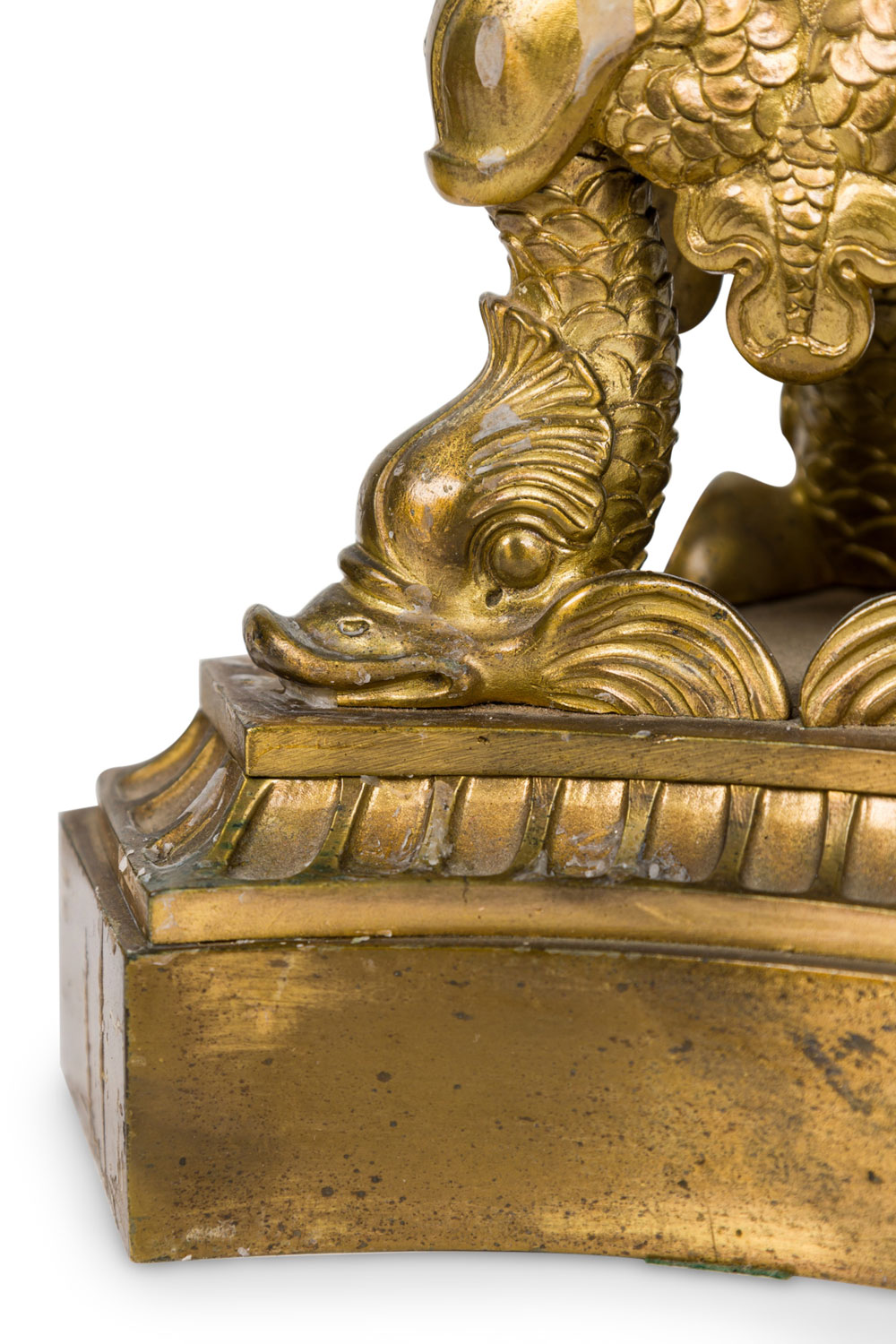 PAIR of French Restoration (1st Half 19th Century) gilt bronze three-light candelabras with a flame finial top, resting on 3 dolphin legs over a triangular base. (PRICED AS PAIR).
