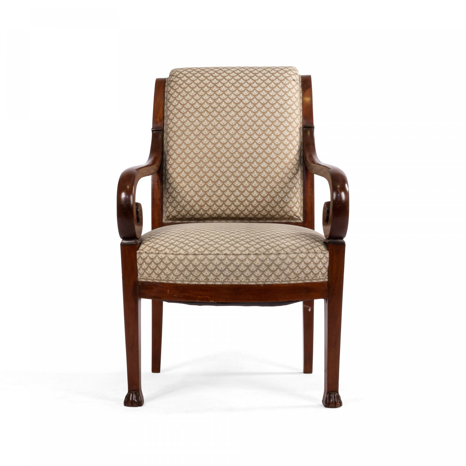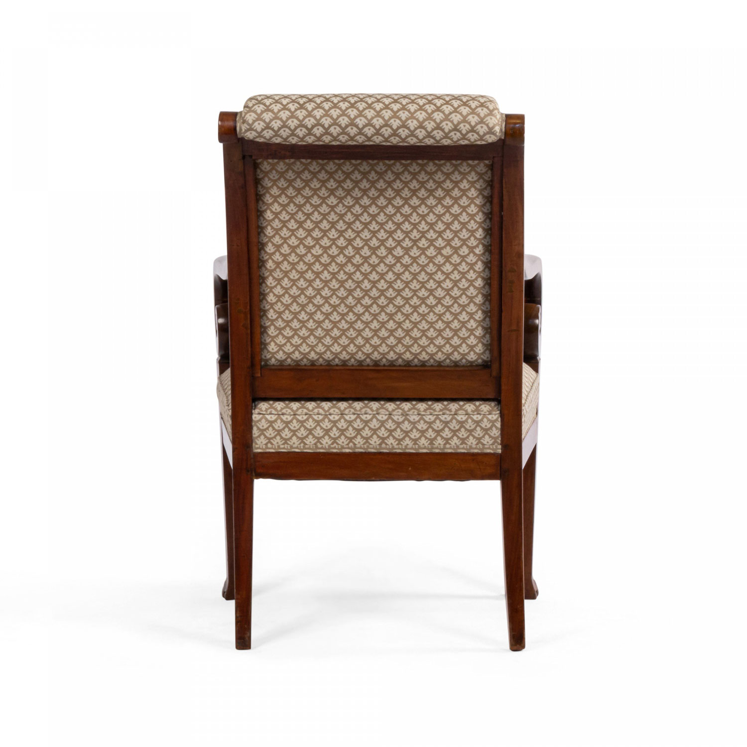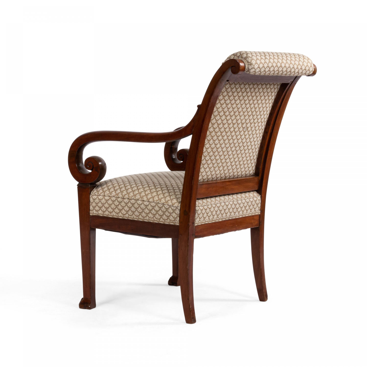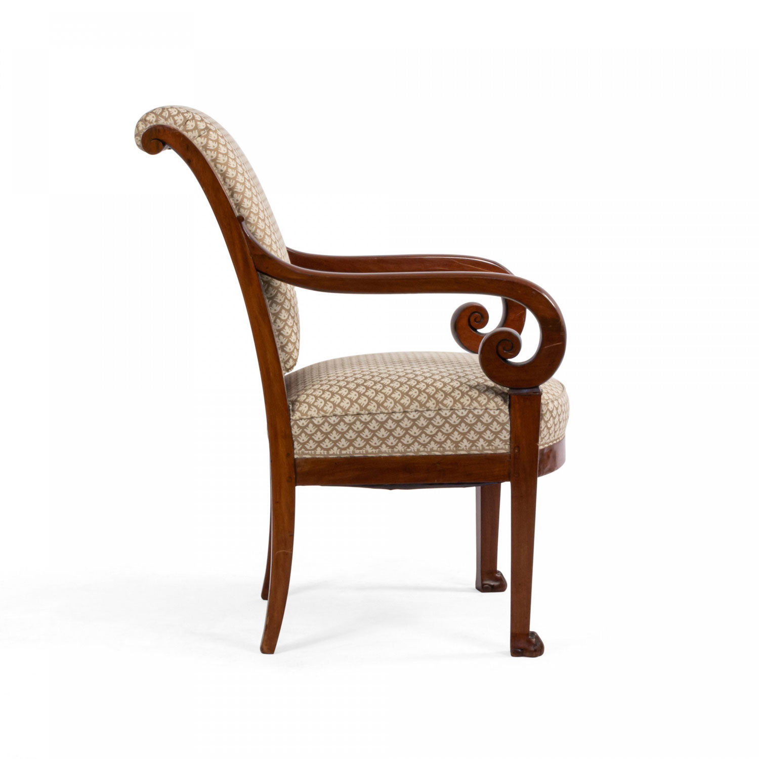 PAIR of French Restoration (19th Cent) mahogany roll arm Armchairs with upholstered seat and back