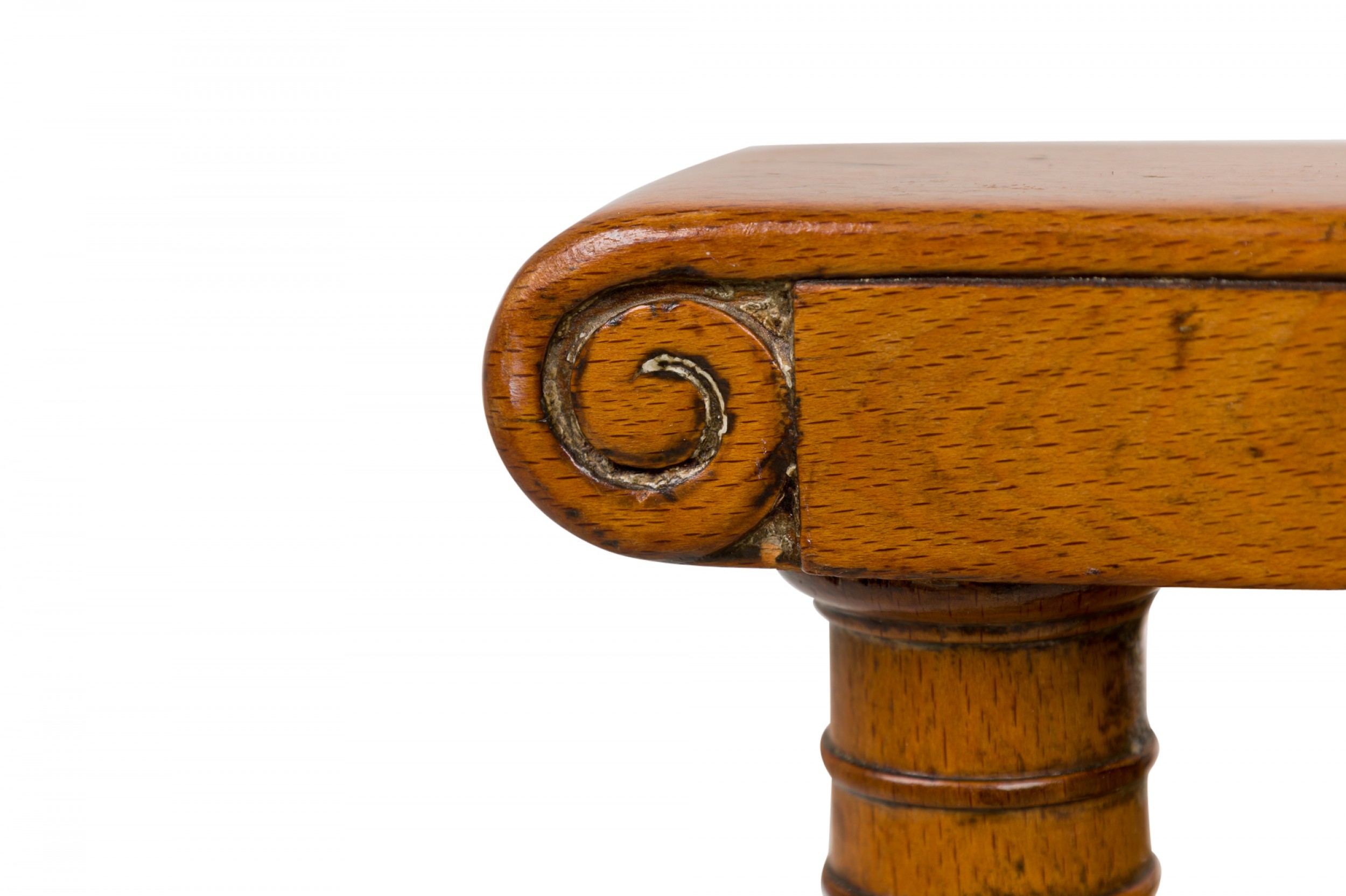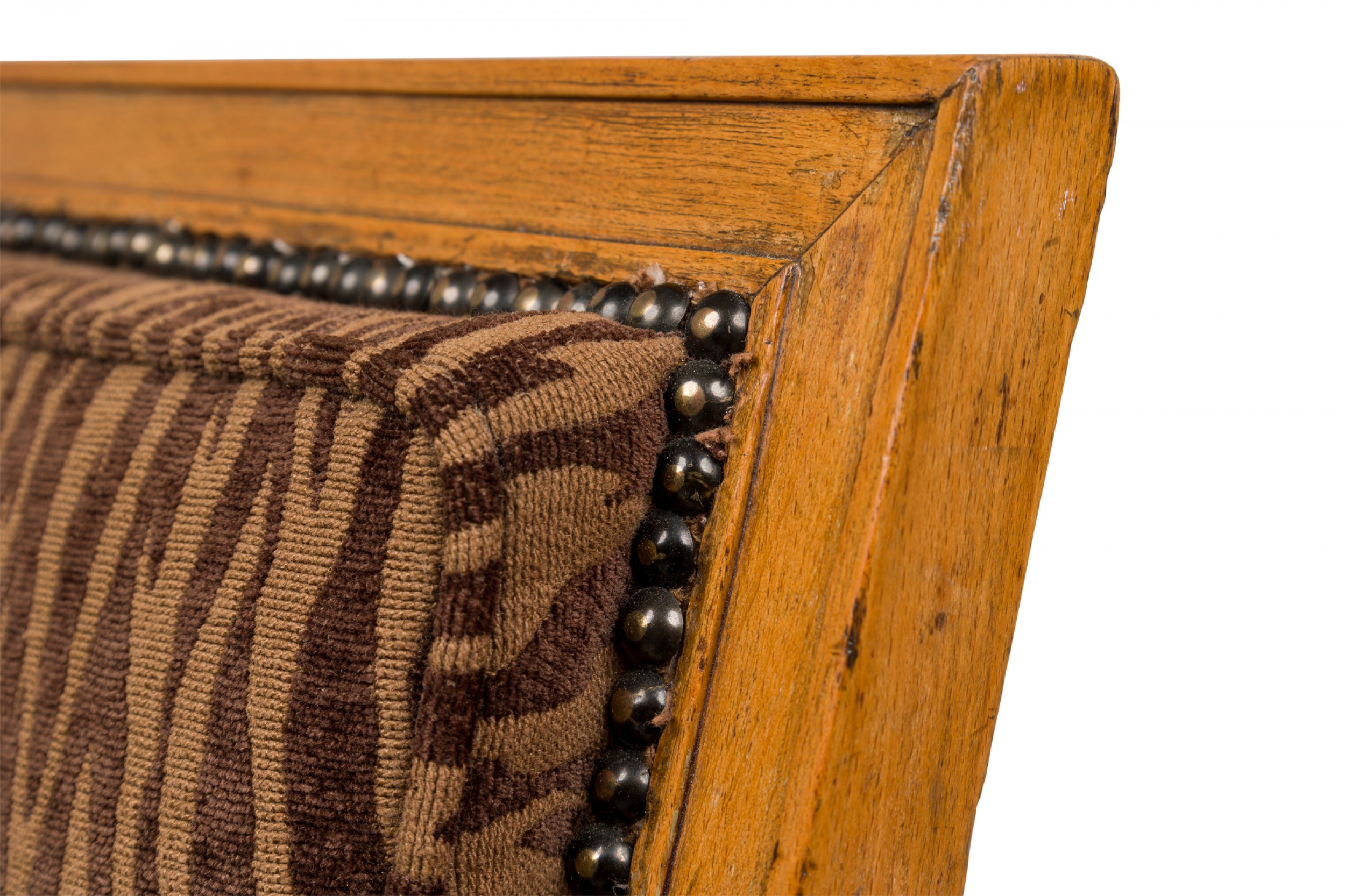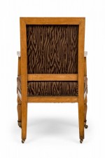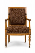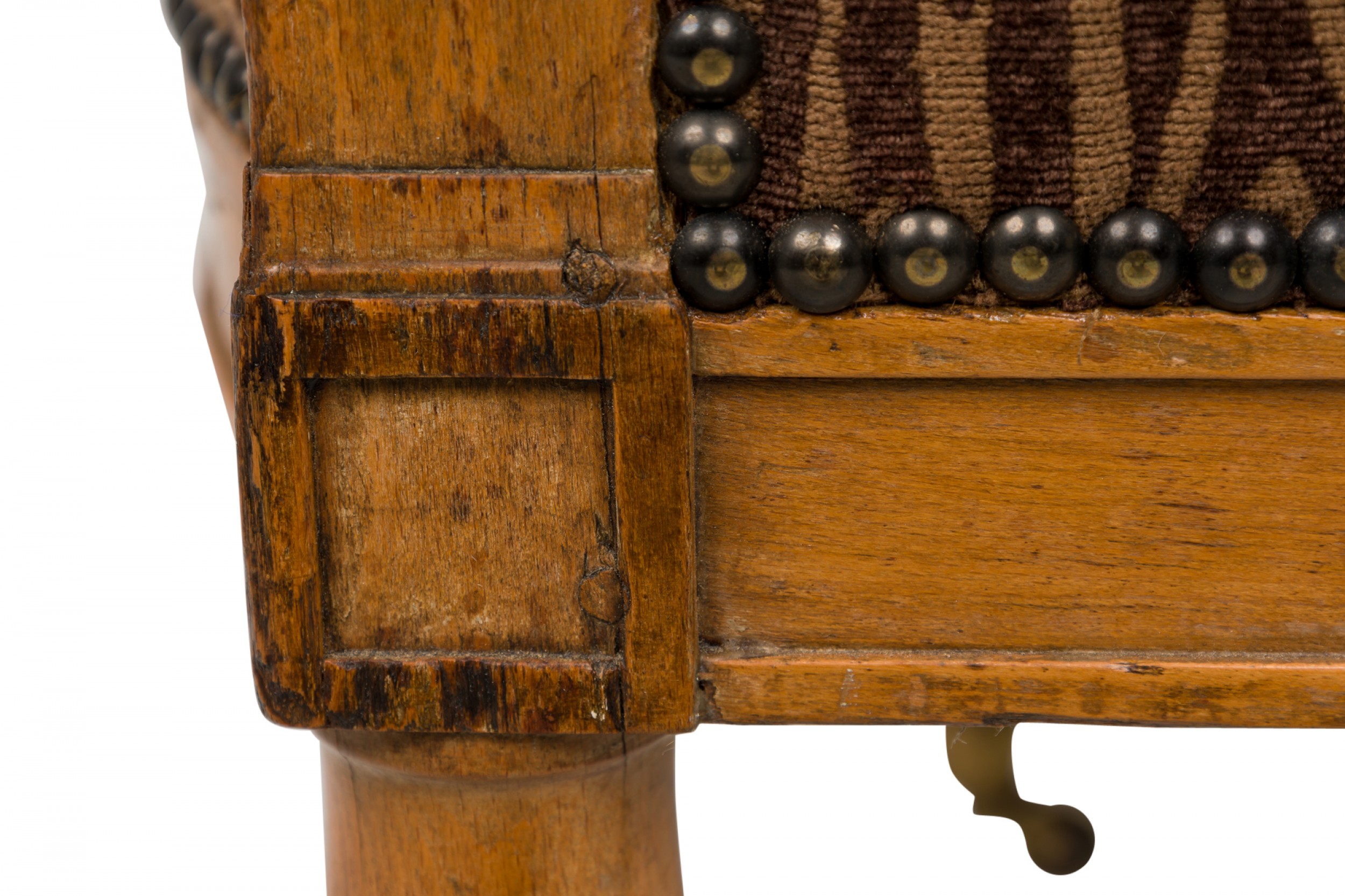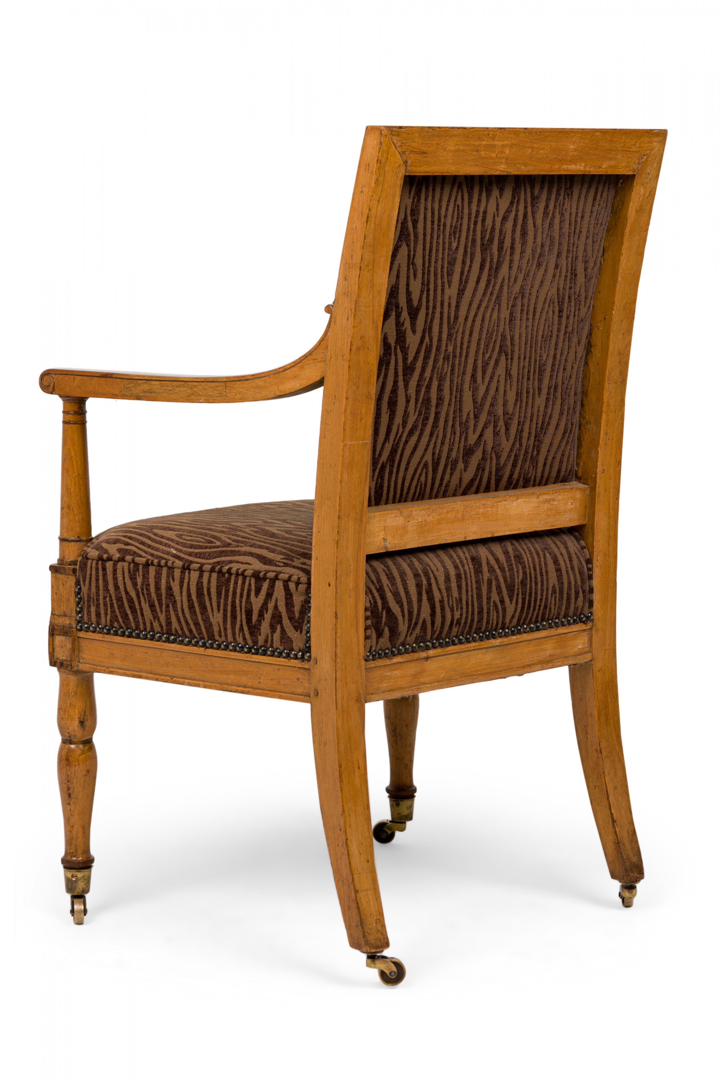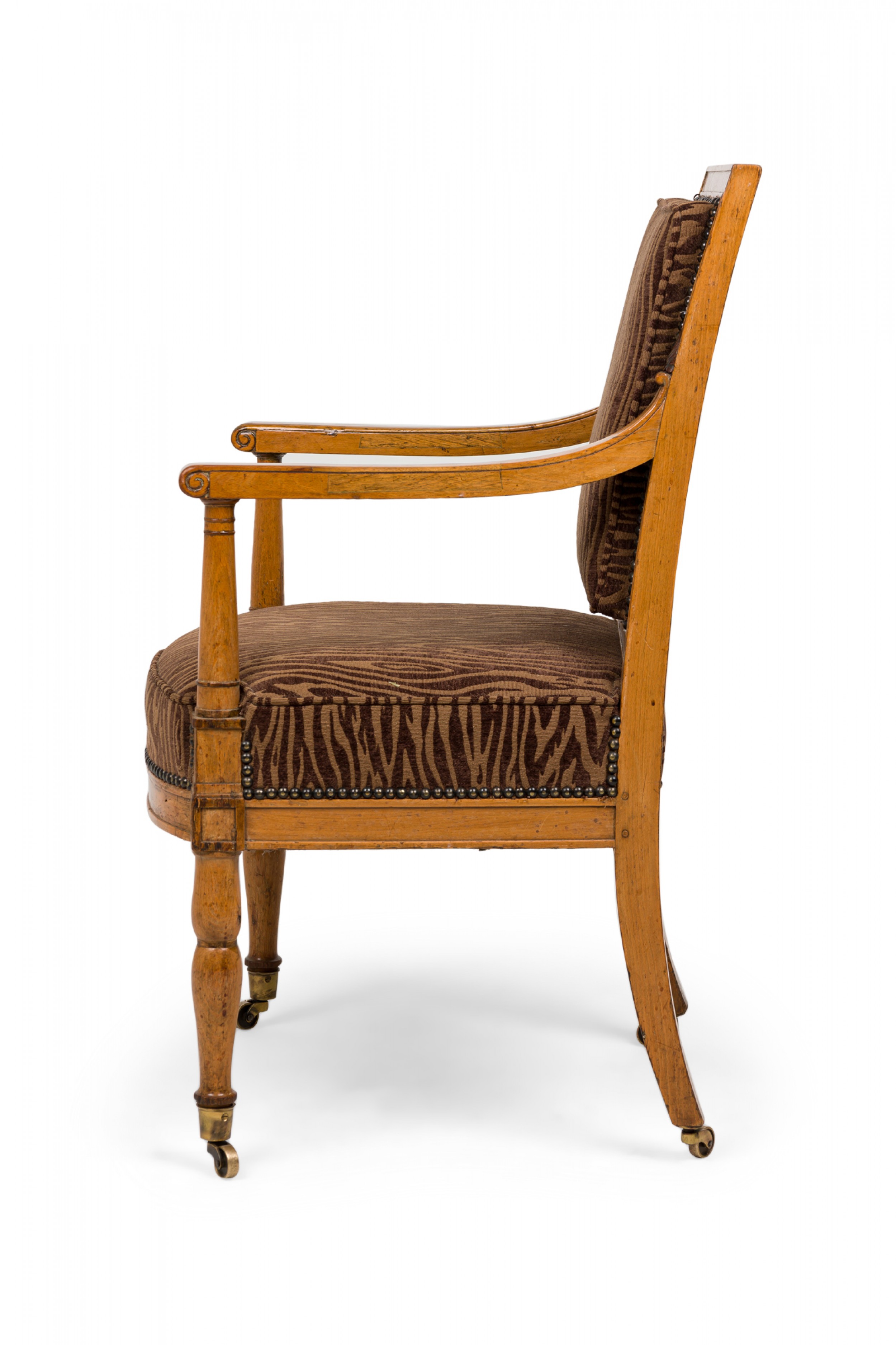 French Restoration (early 19th Century) walnut armchair upholstered in a neutral tone animal print with slightly sloped raised back cushion secured by prominent nailhead trim, the scroll arms accentuated by applied metal leaf embellishments at the elbows, sabre back legs and turned tapered front legs on casters. (signed, JACOB).