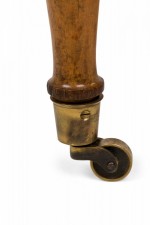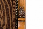French Restoration (early 19th Century) walnut armchair upholstered in a neutral tone animal print with slightly sloped raised back cushion secured by prominent nailhead trim, the scroll arms accentuated by applied metal leaf embellishments at the elbows, sabre back legs and turned tapered front legs on casters. (signed, JACOB)