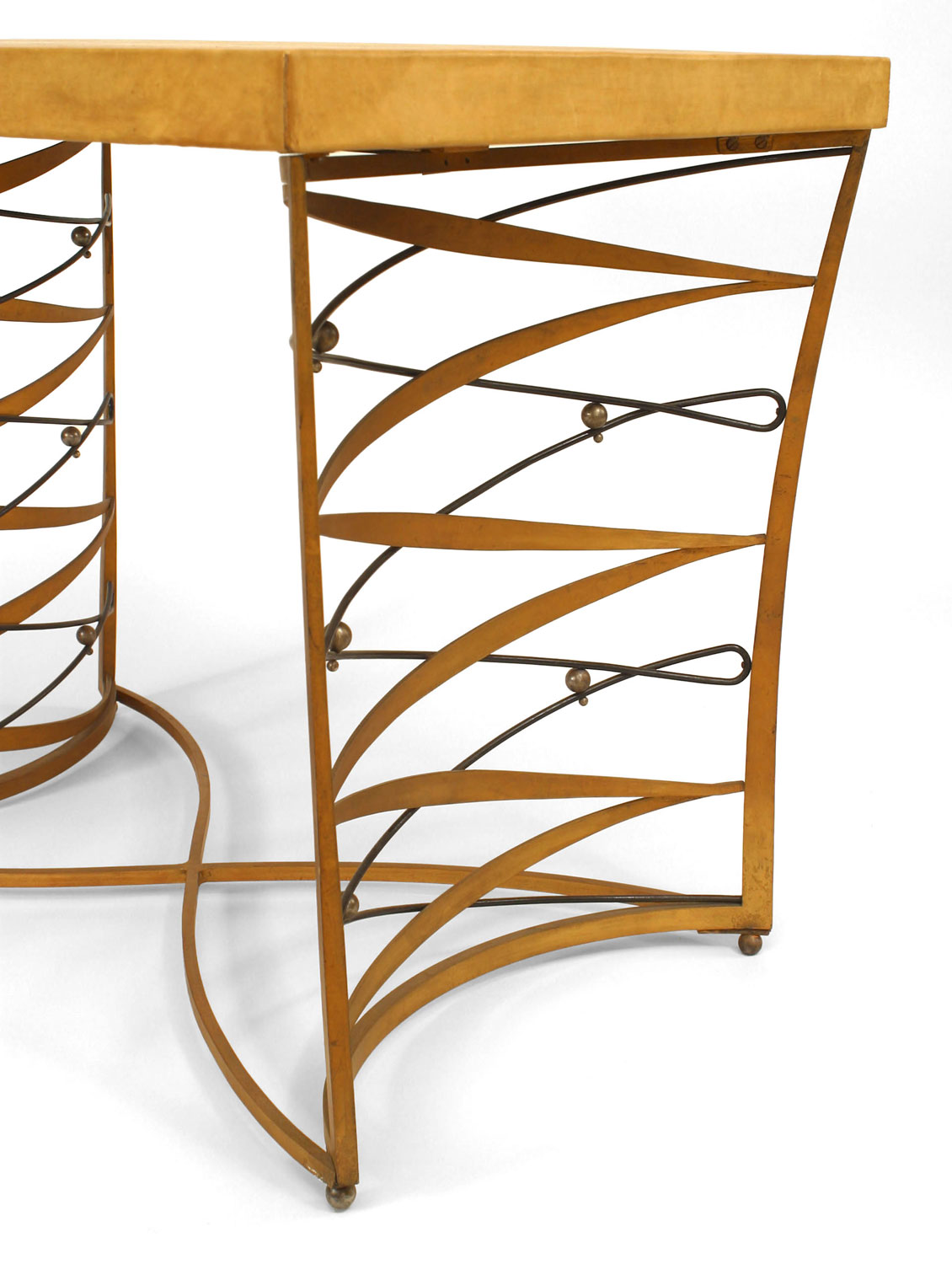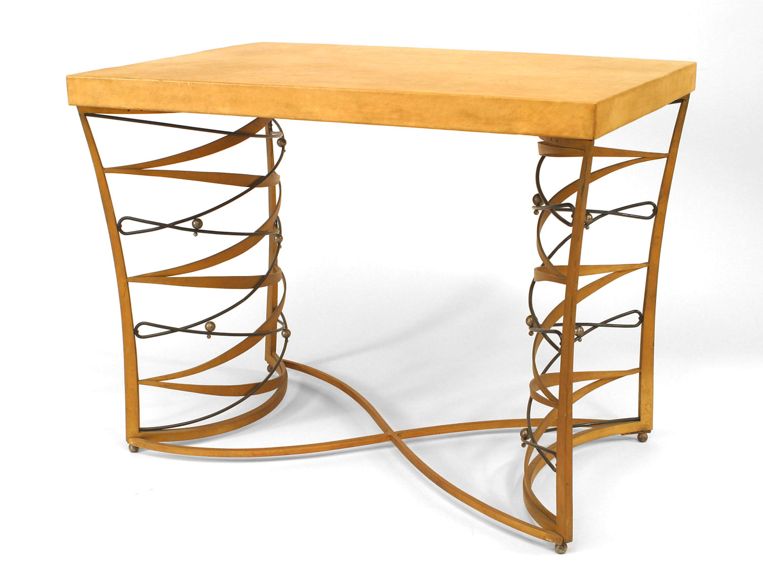 French (circa 1937) gold & black painted metal & parchment top center table with concave interlocking scroll trestle sides joined by a stretcher. (signed: MAURICE DUFRENE)