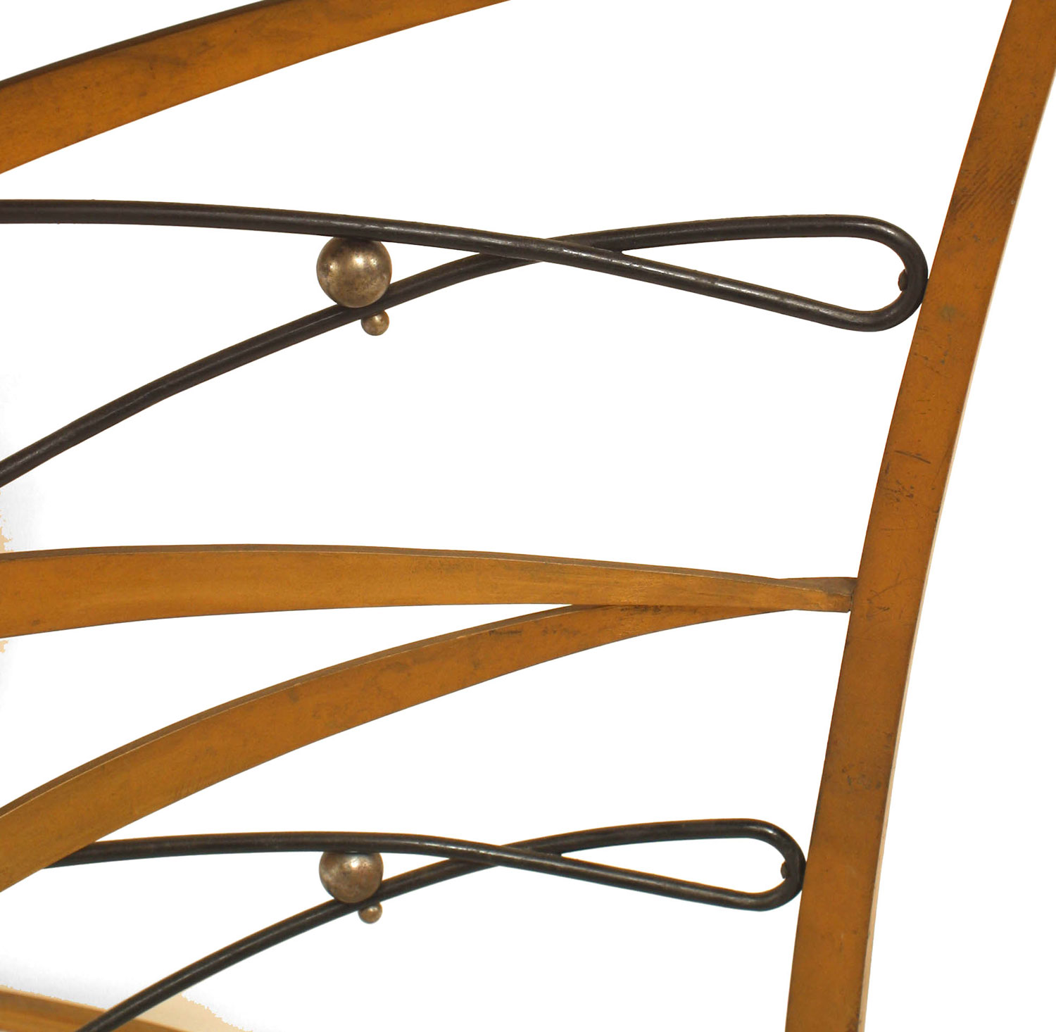 French (circa 1937) gold & black painted metal & parchment top center table with concave interlocking scroll trestle sides joined by a stretcher. (signed: MAURICE DUFRENE).