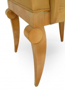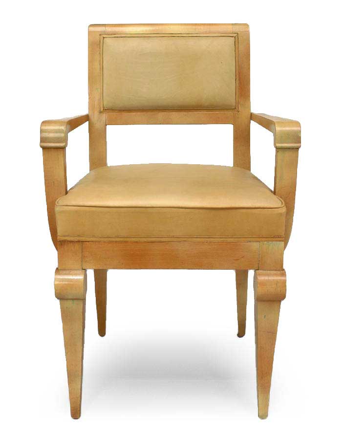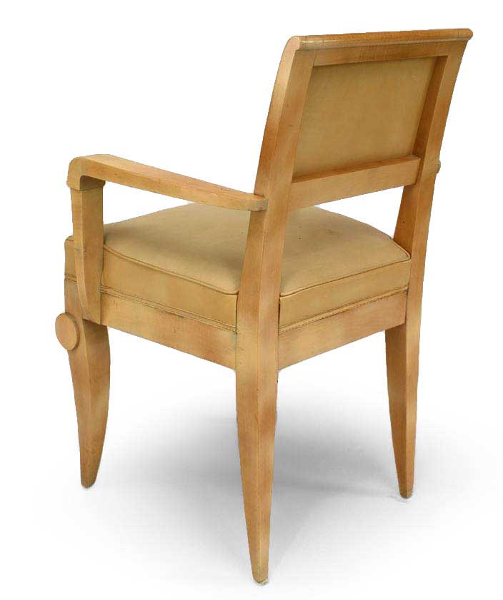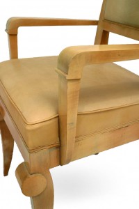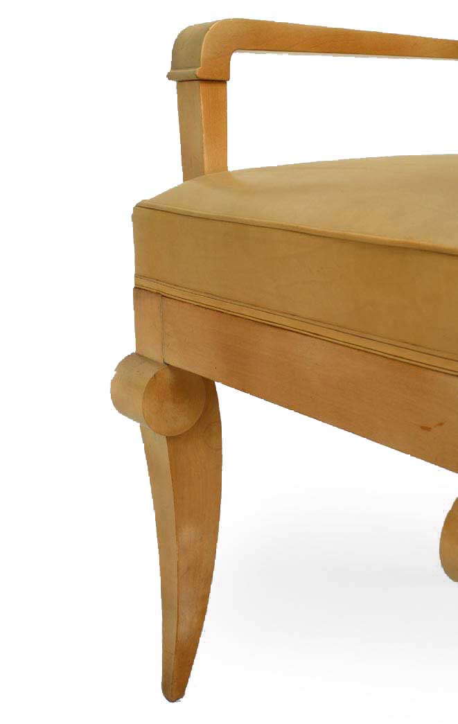 PAIR of French Mid-Century (1940s) sycamore armchairs with scroll legs and beige leather seats and backs. (attributed to ANDRE ARBUS) (PRICED AS PAIR)