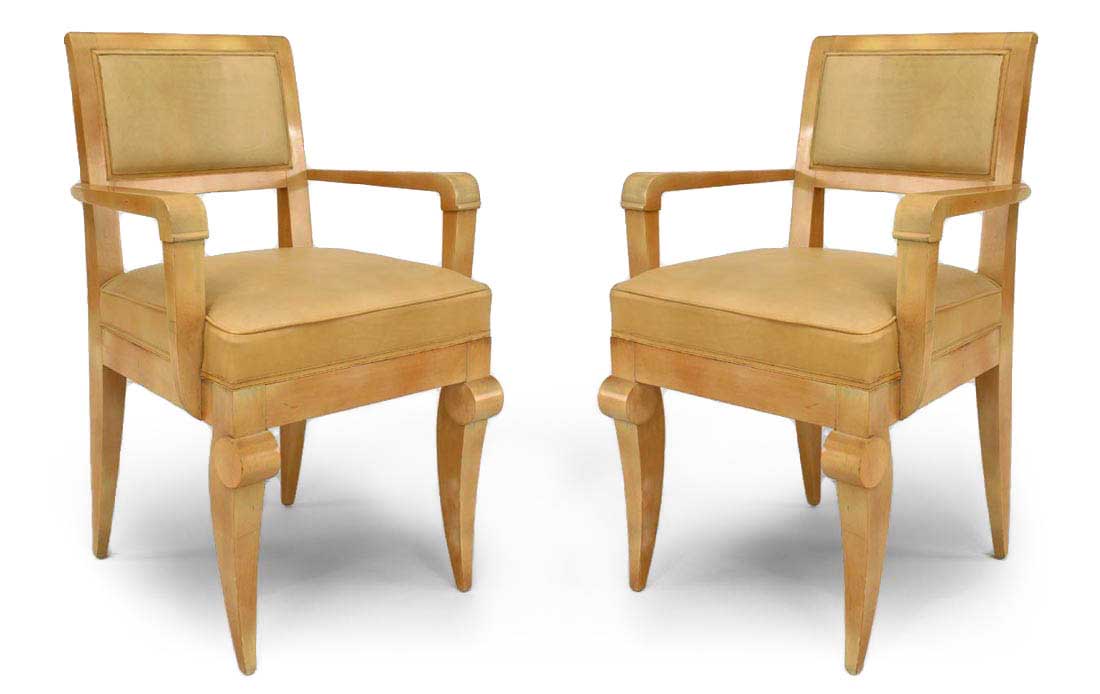PAIR of French Mid-Century (1940s) sycamore armchairs with scroll legs and beige leather seats and backs. (attributed to ANDRE ARBUS) (PRICED AS PAIR).