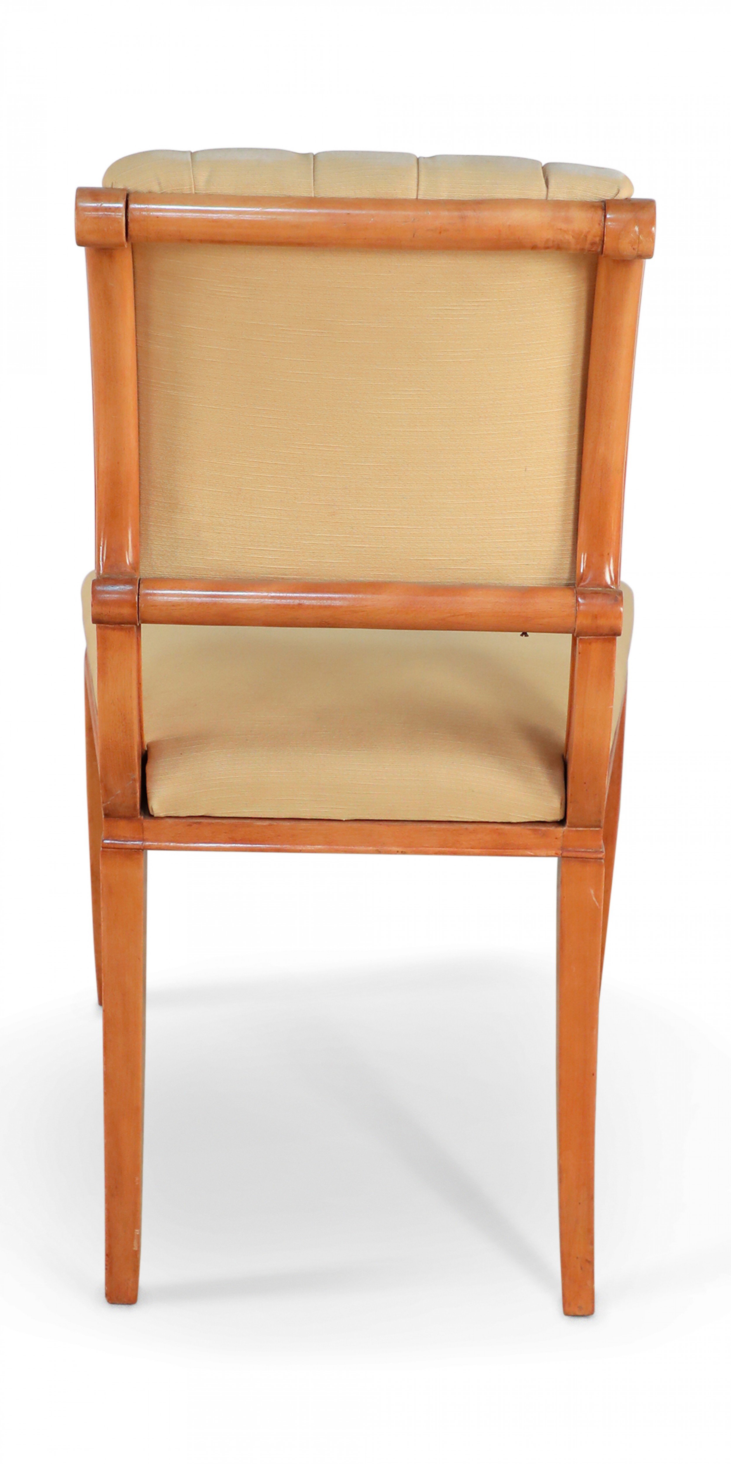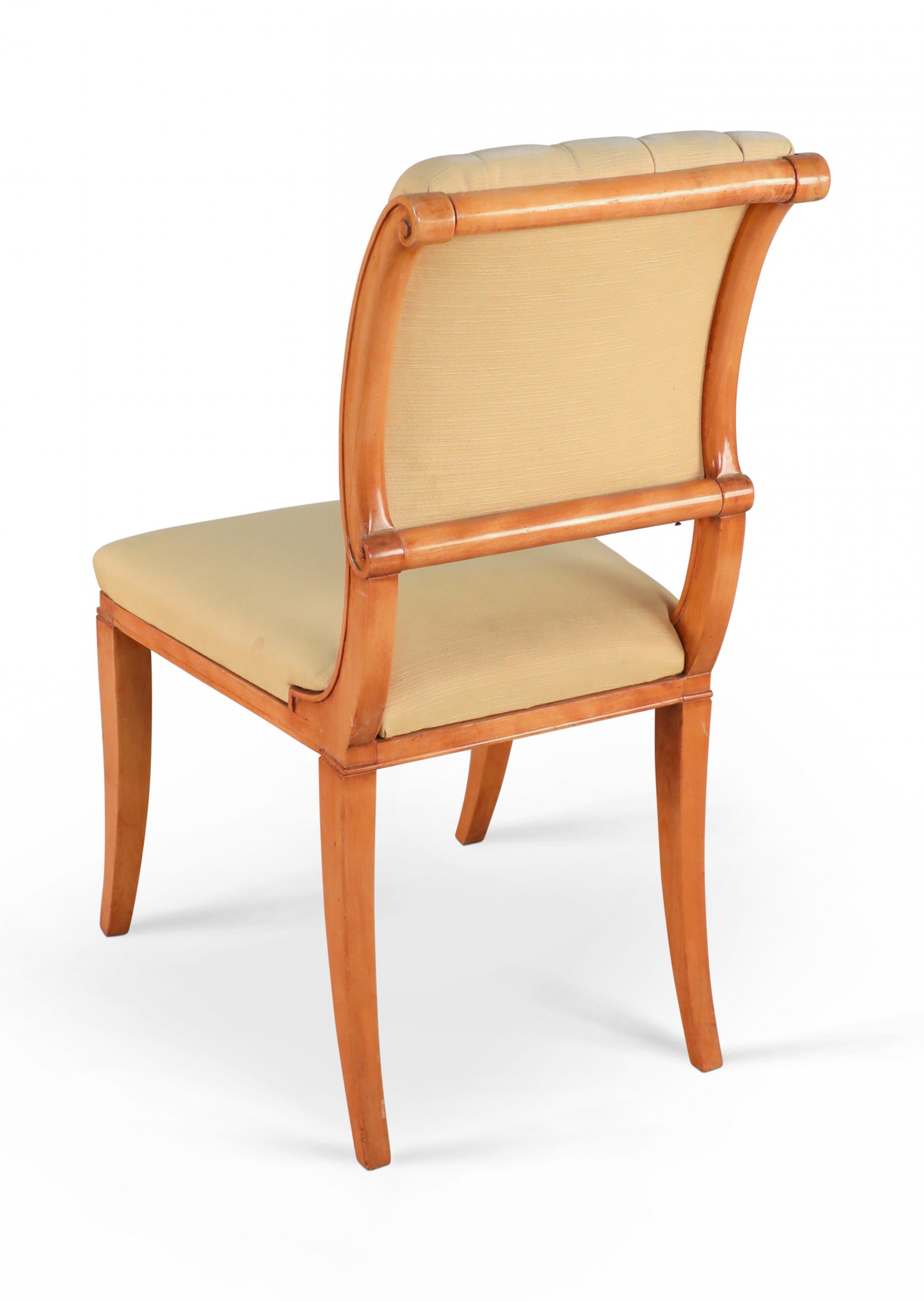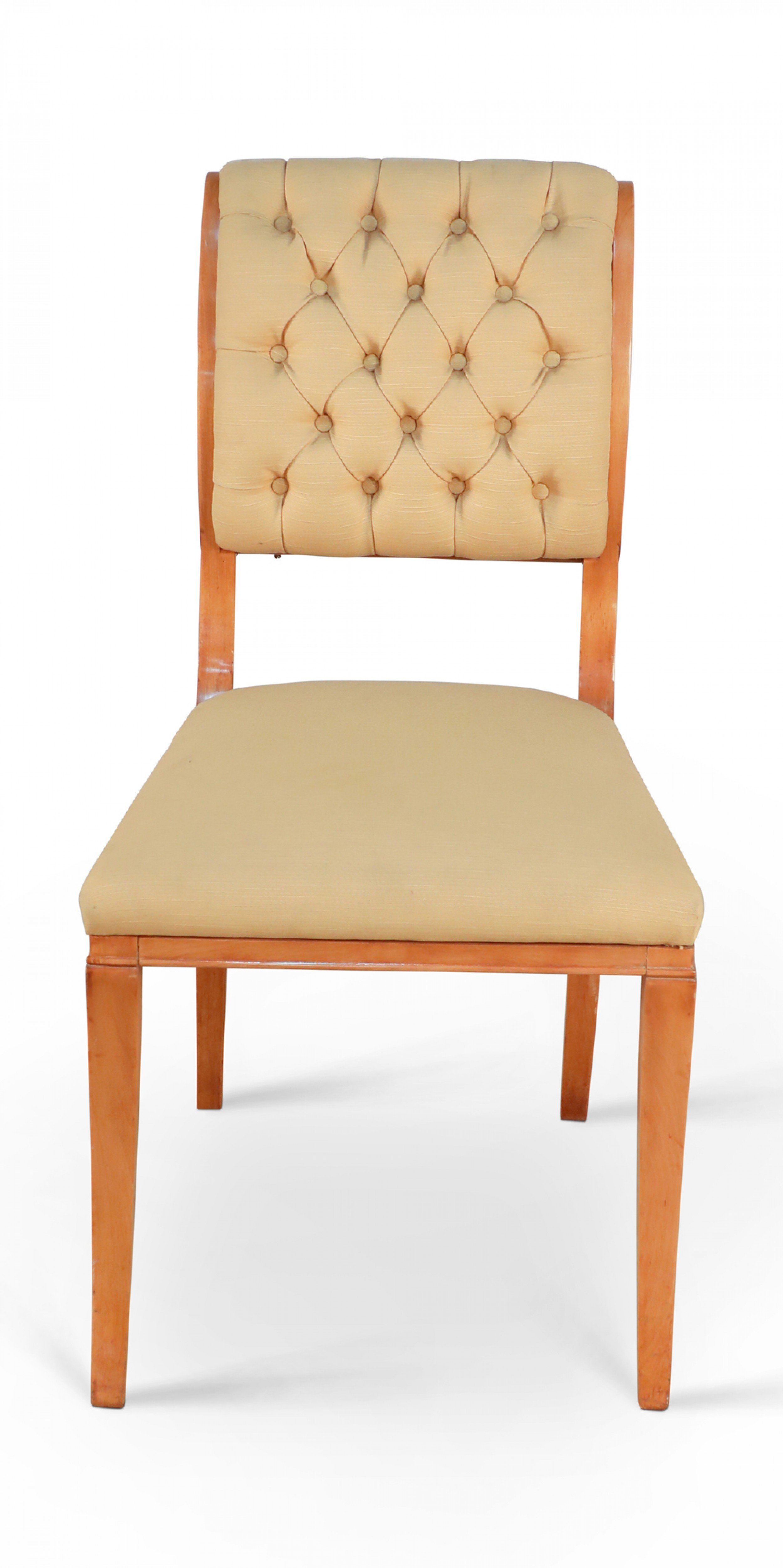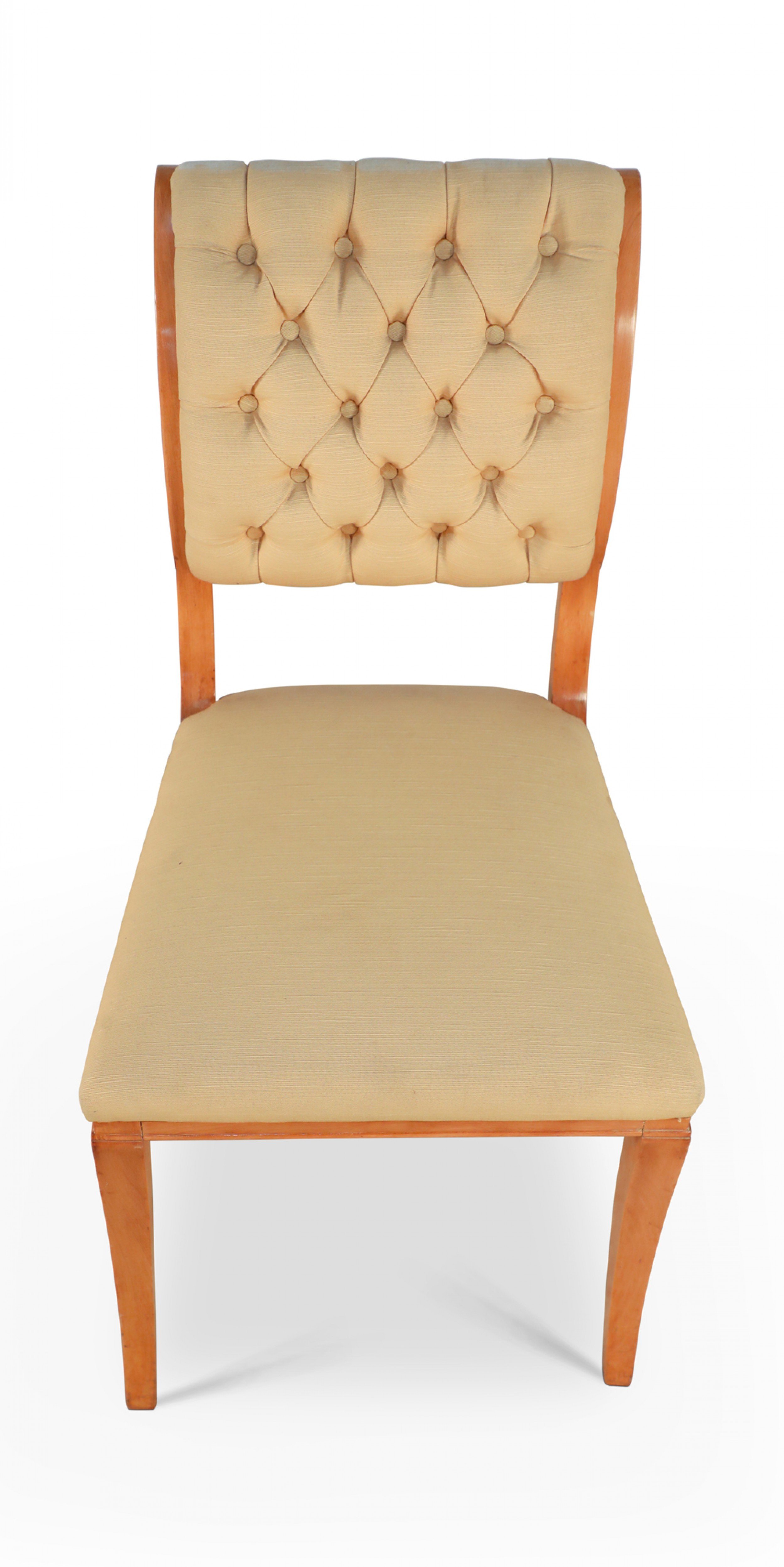 SET of 6 French 1940s sycamore side chairs with scrolled back upholstered in tufted beige silk on saber legs. (att: ANDRE ARBUS)