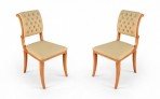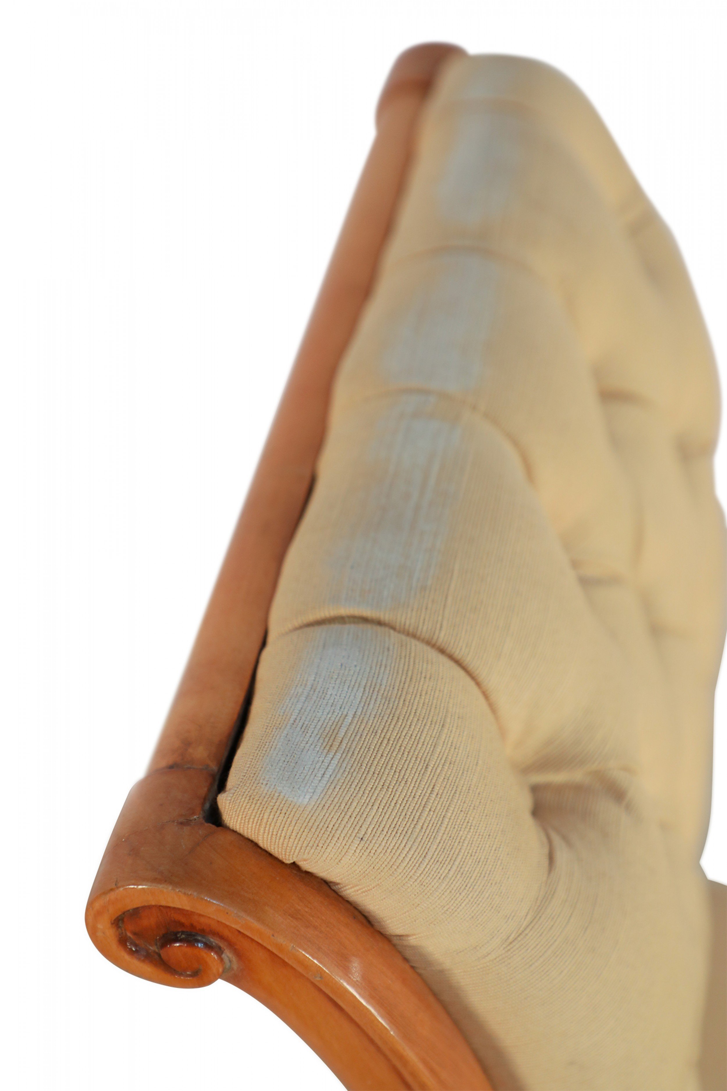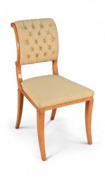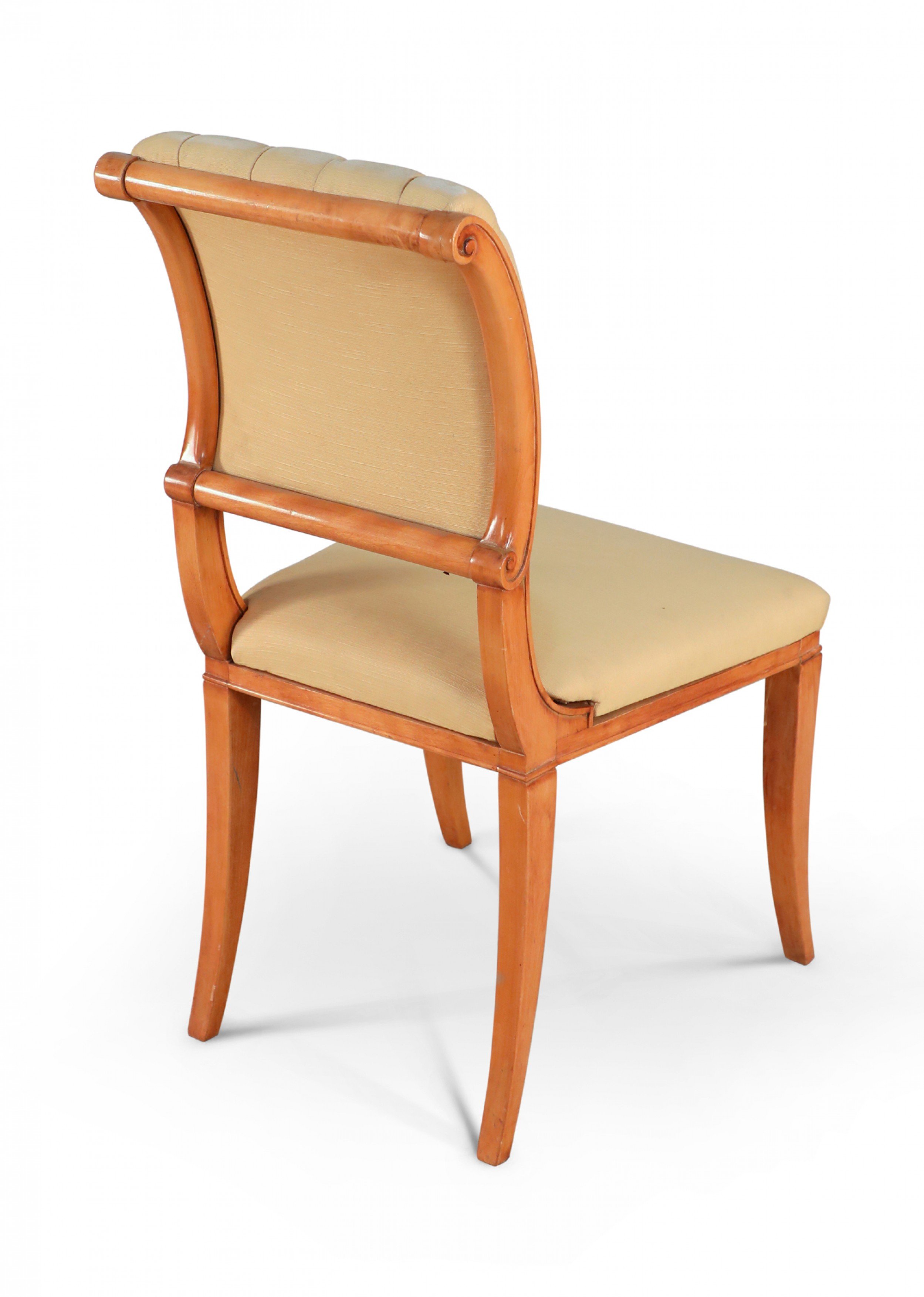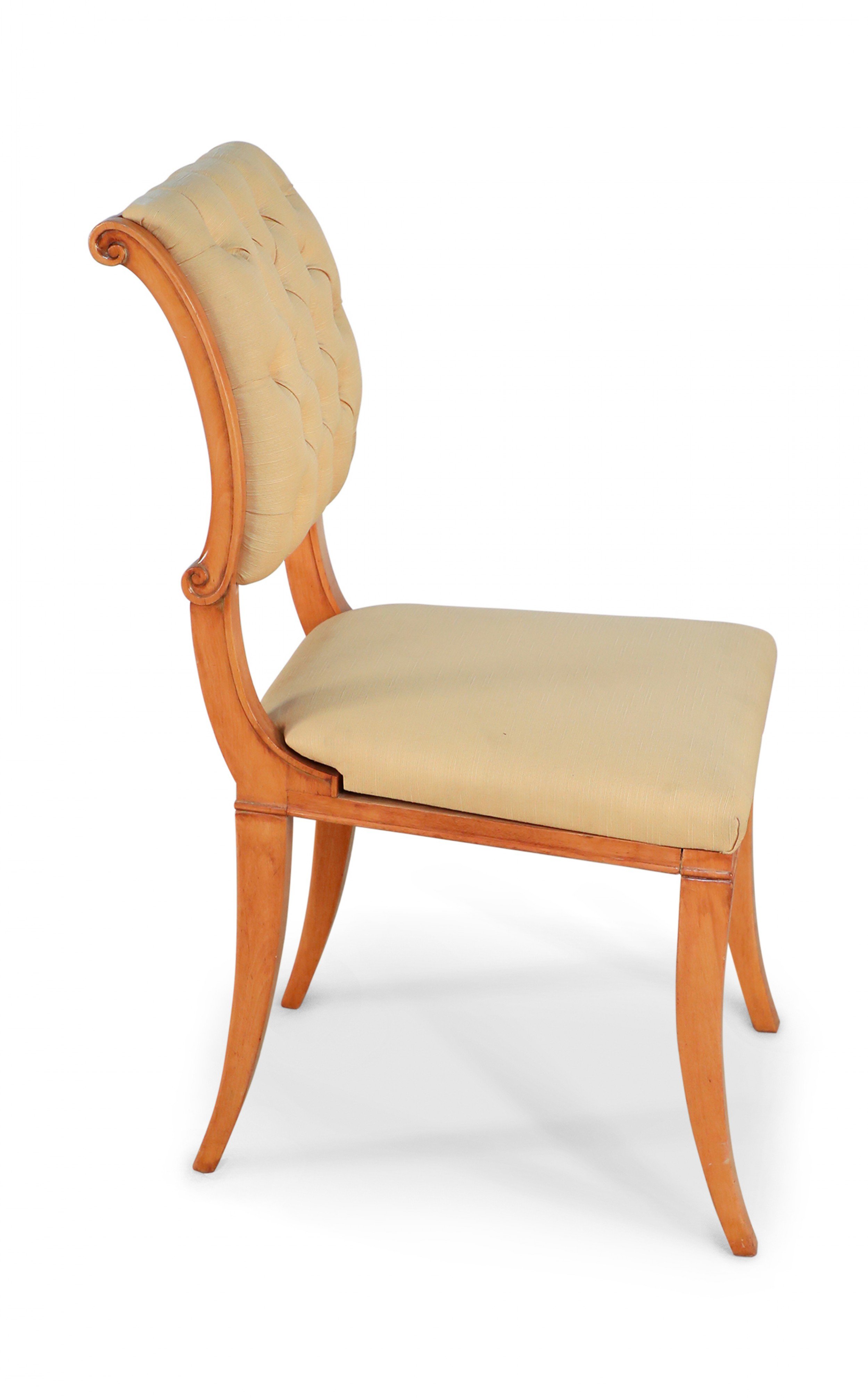 SET of 6 French 1940s sycamore side chairs with scrolled back upholstered in tufted beige silk on saber legs. (att: ANDRE ARBUS)