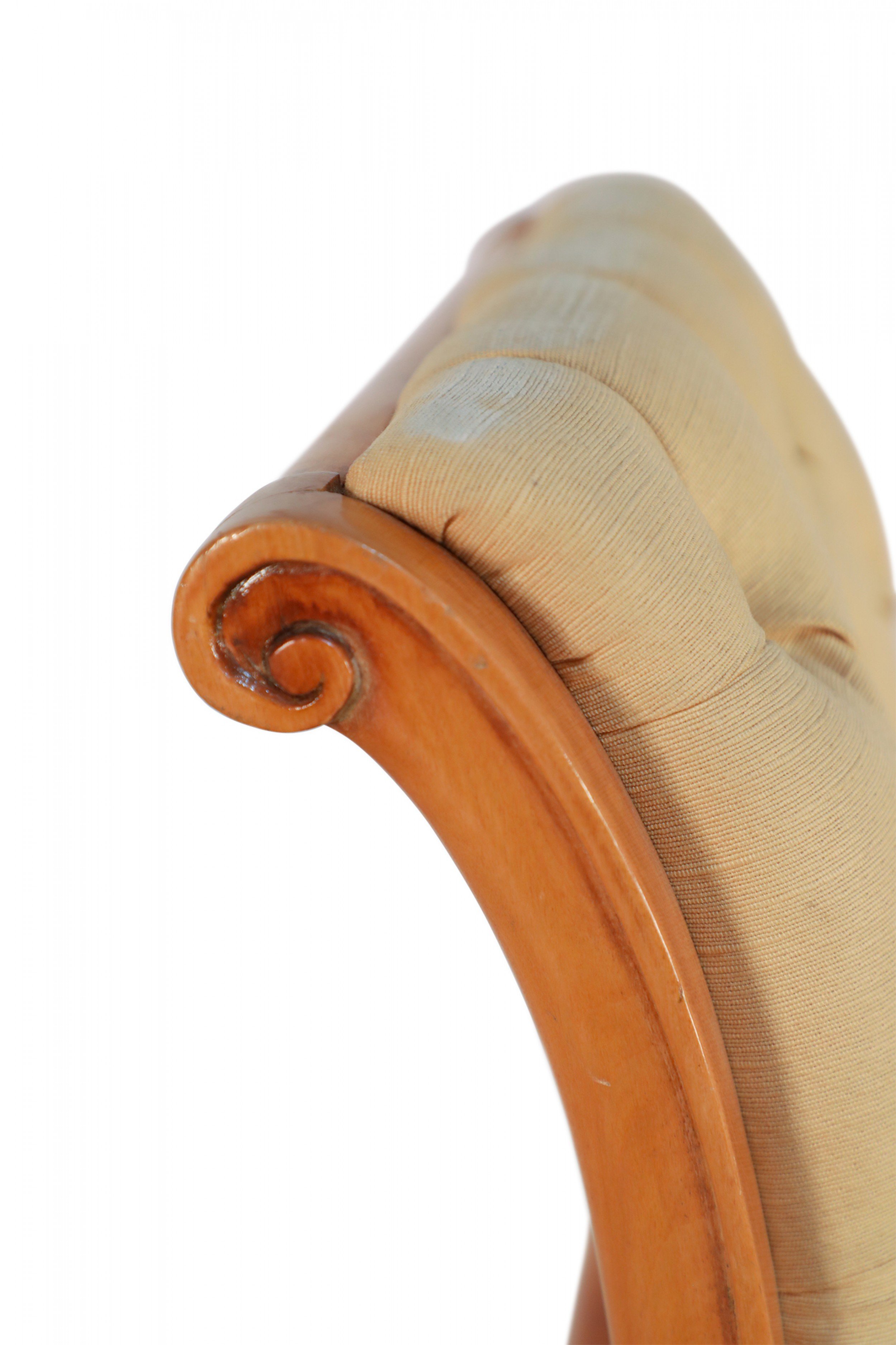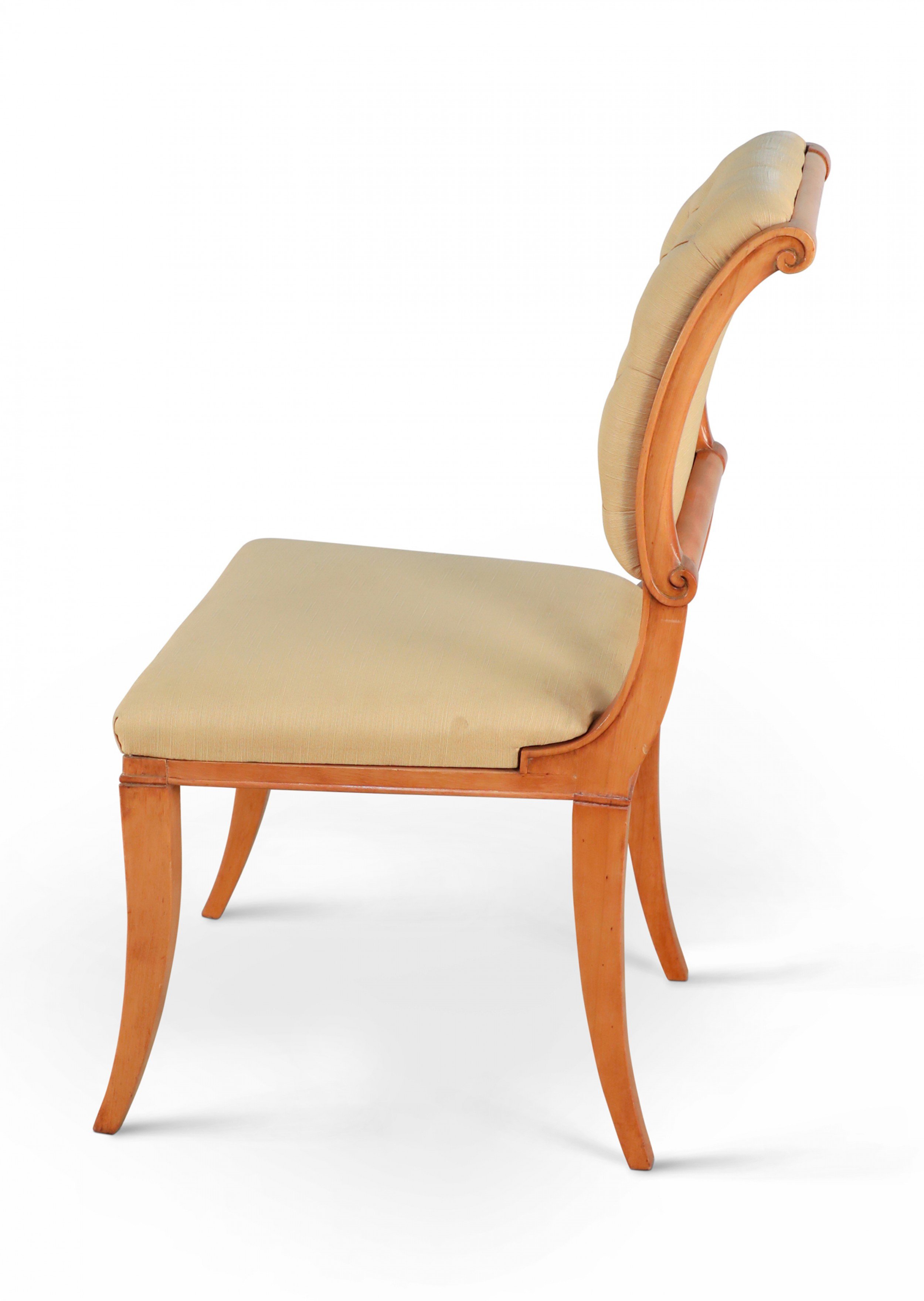 SET of 6 French 1940s sycamore side chairs with scrolled back upholstered in tufted beige silk on saber legs. (att: ANDRE ARBUS).
