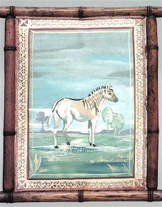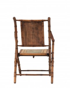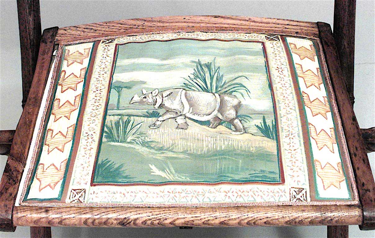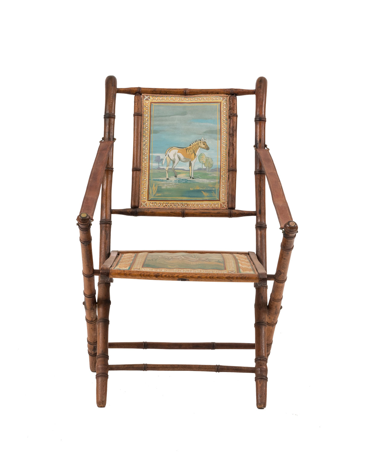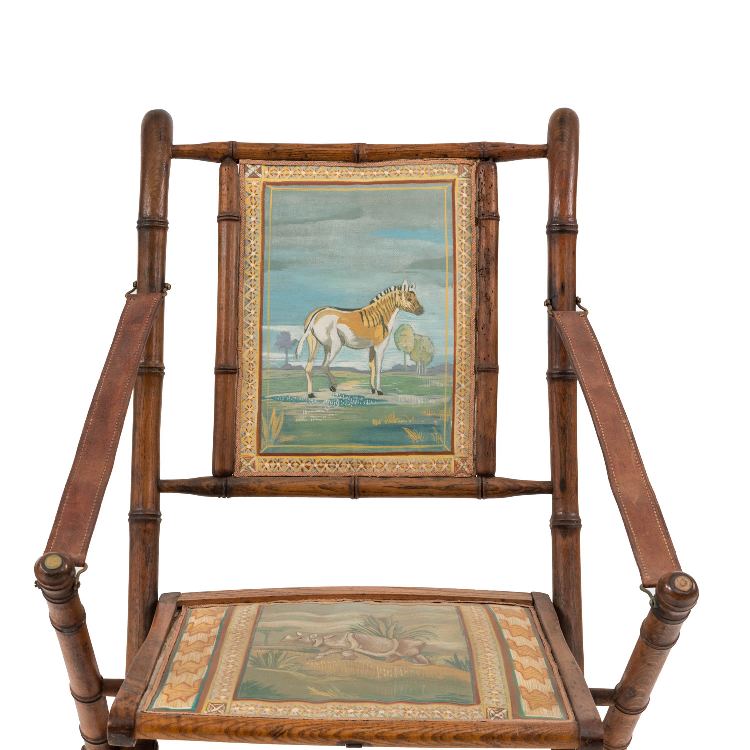 French Victorian oak faux bamboo campaign design folding arm chair having modern painted seat & back panels with animals and leather arm straps.