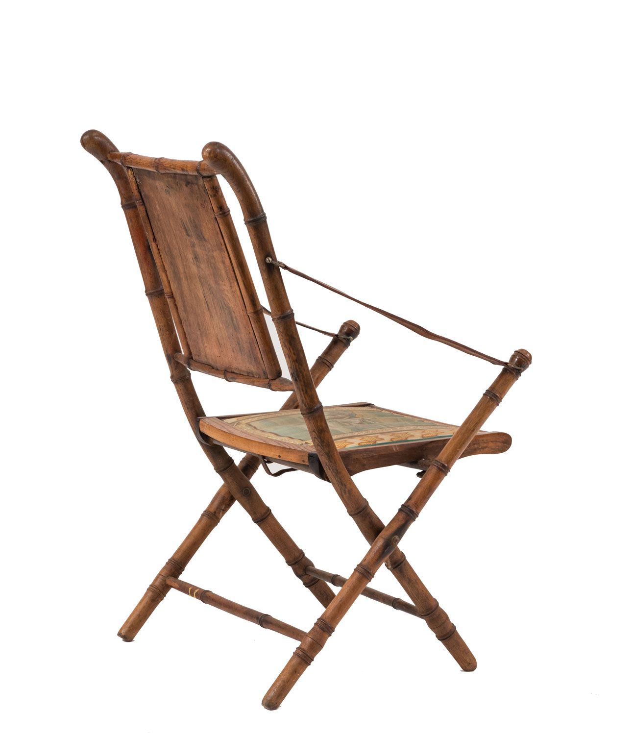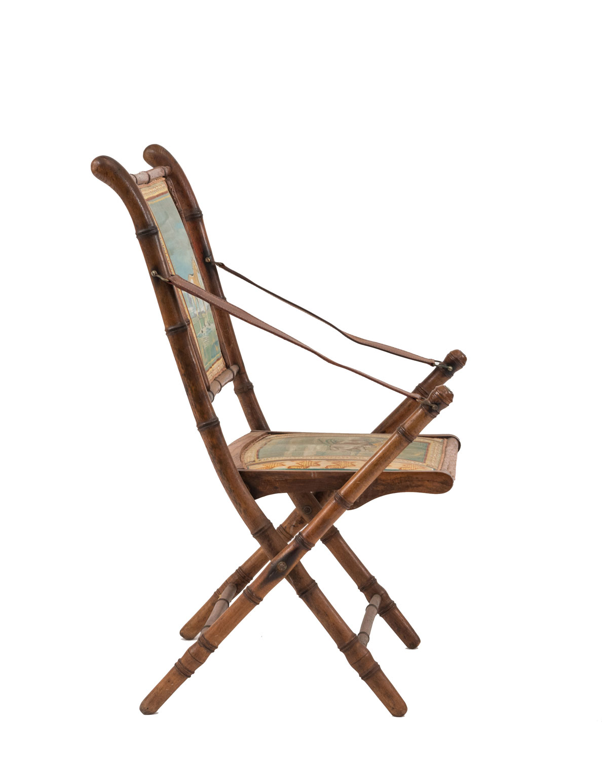 French Victorian oak faux bamboo campaign design folding arm chair having modern painted seat & back panels with animals and leather arm straps..