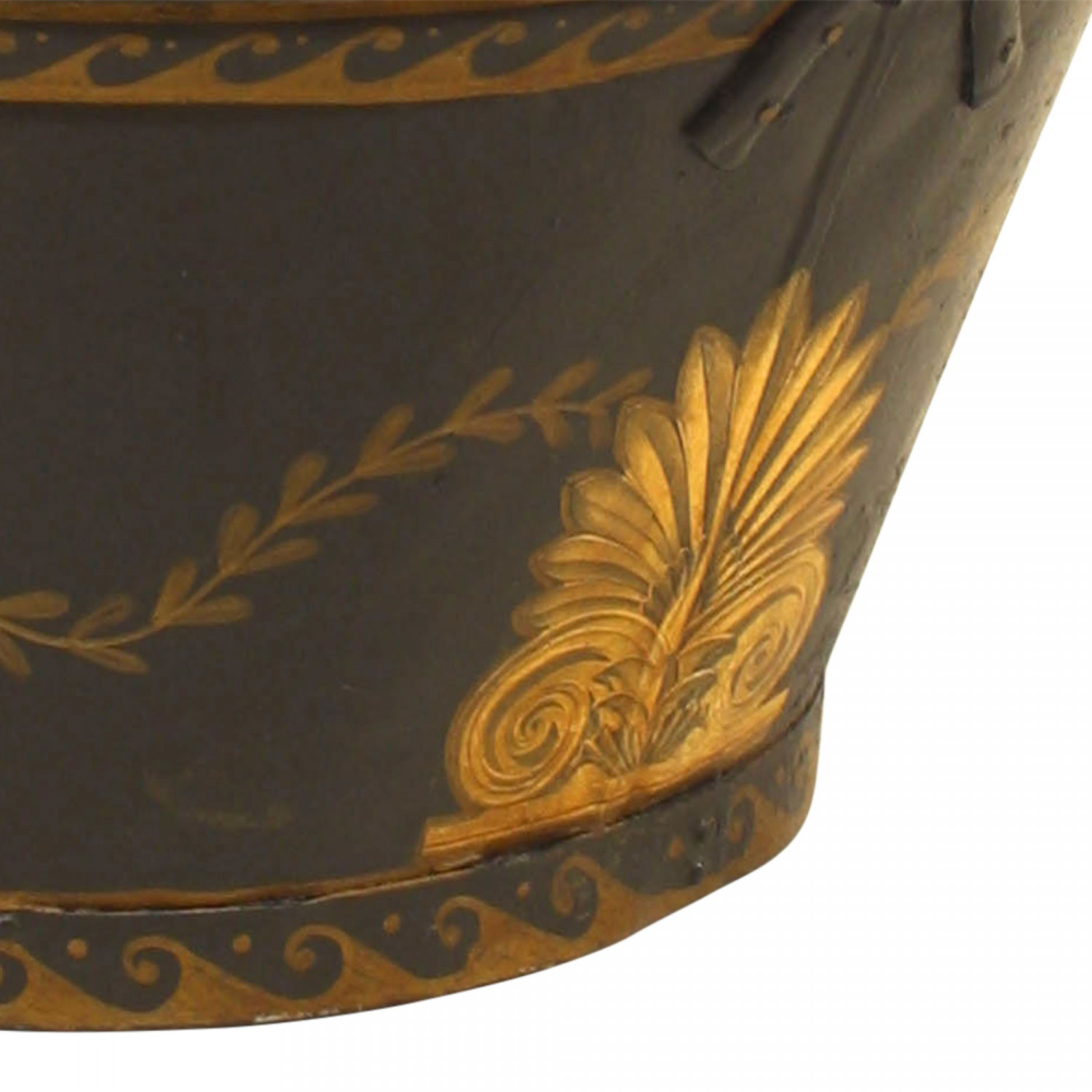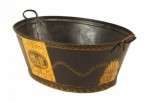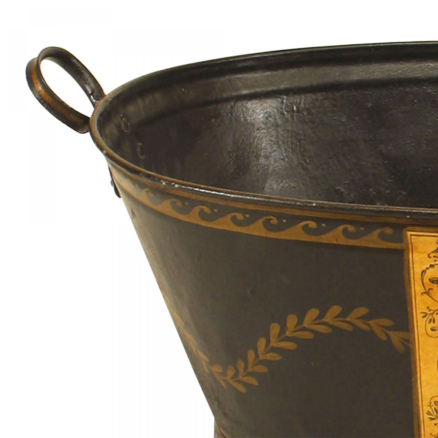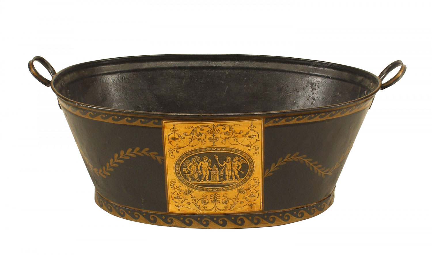 French Victorian black tole oval planter with side handles and decorated with gilt trim.