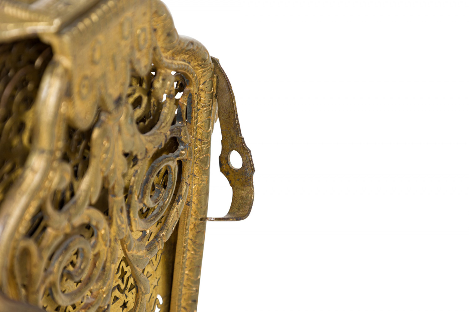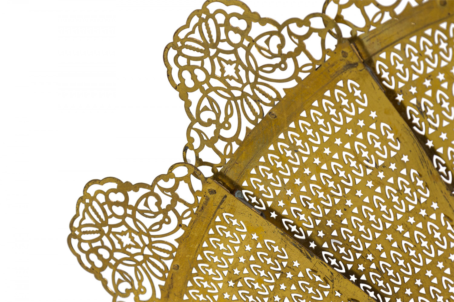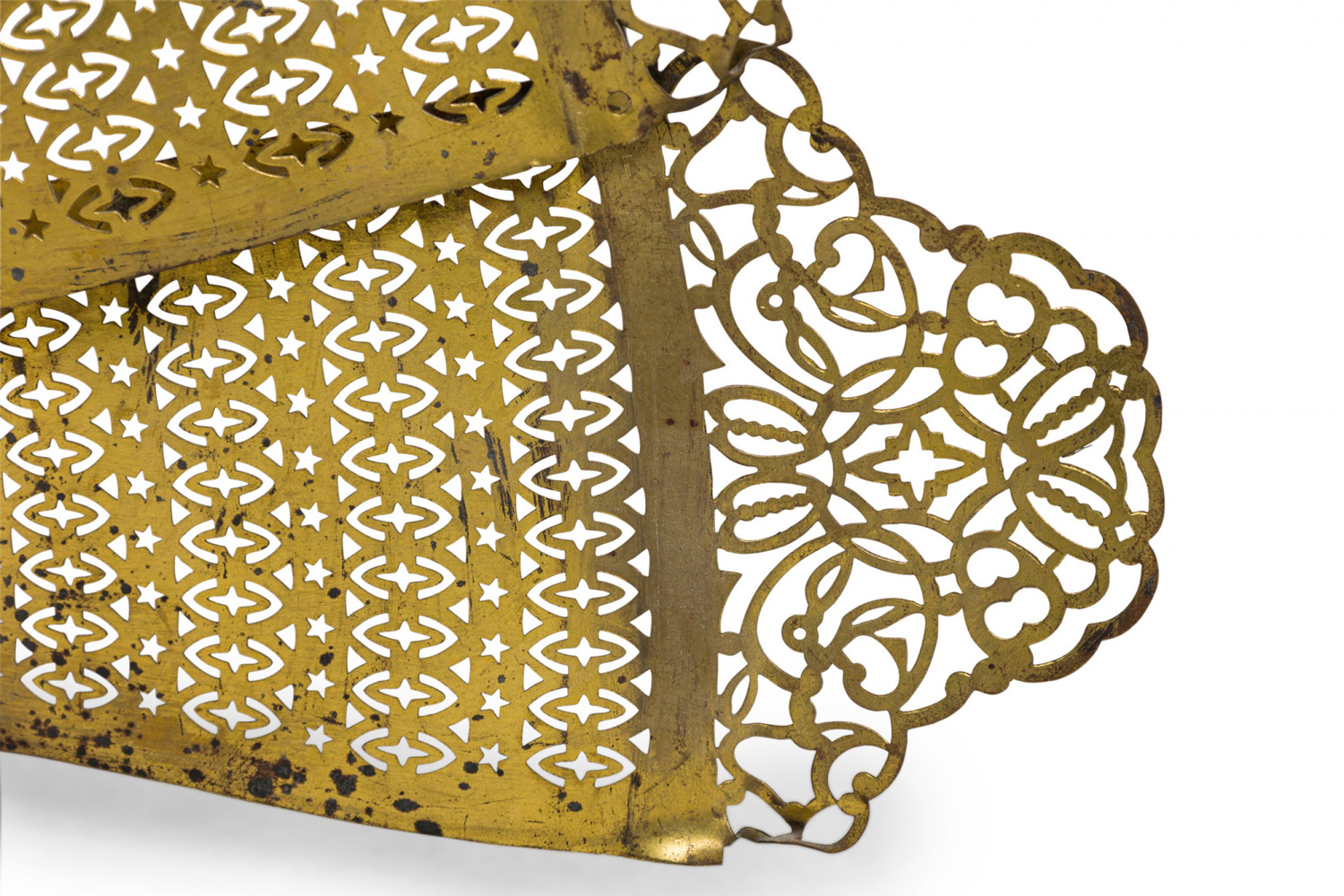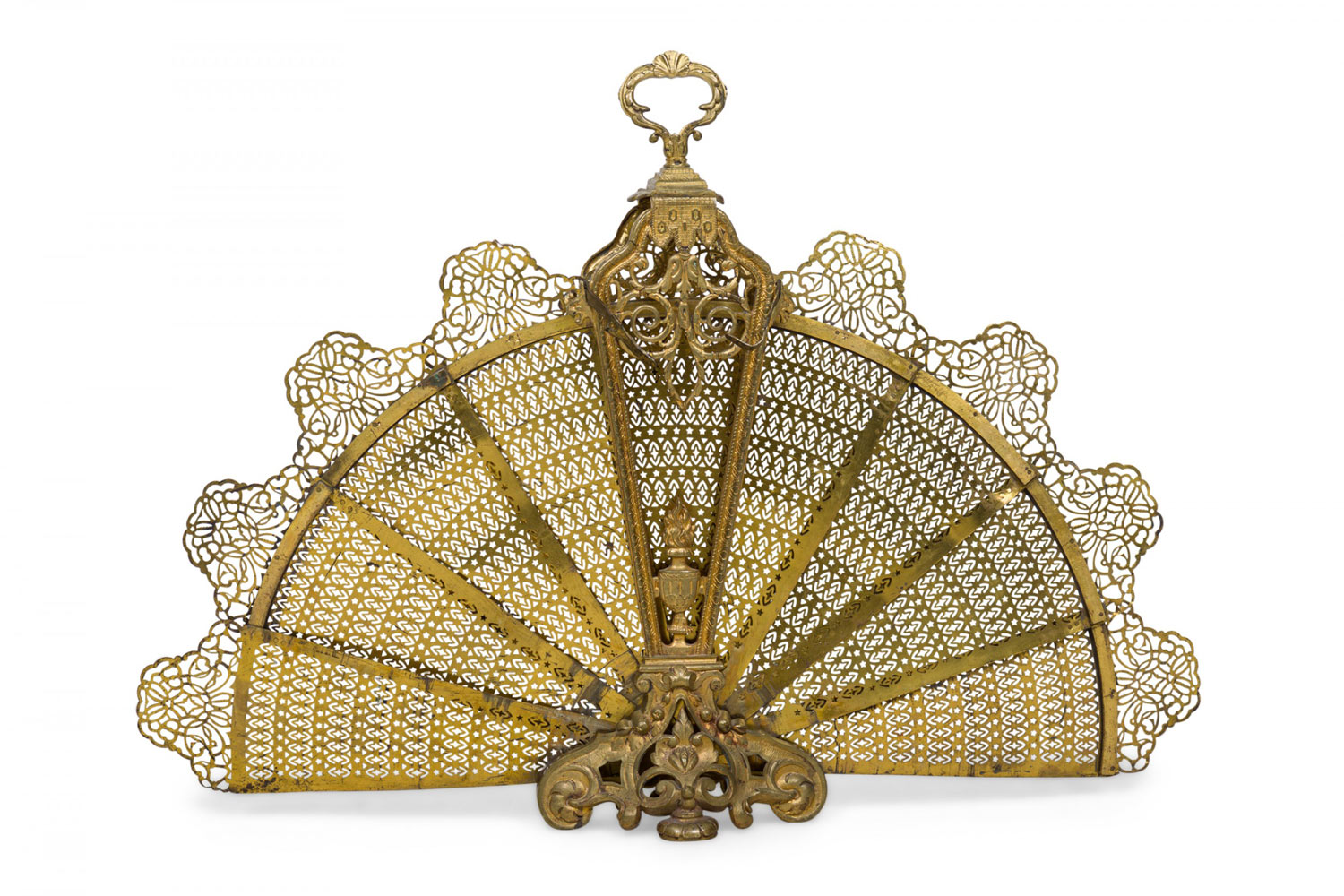 French Victorian brass filigree folding fireplace fan design fire screen with handle top..
