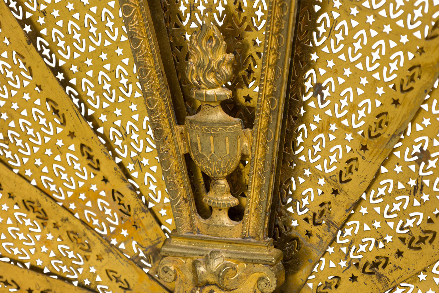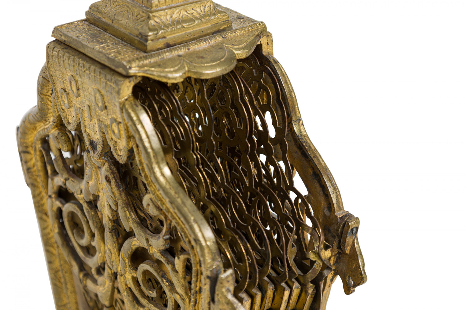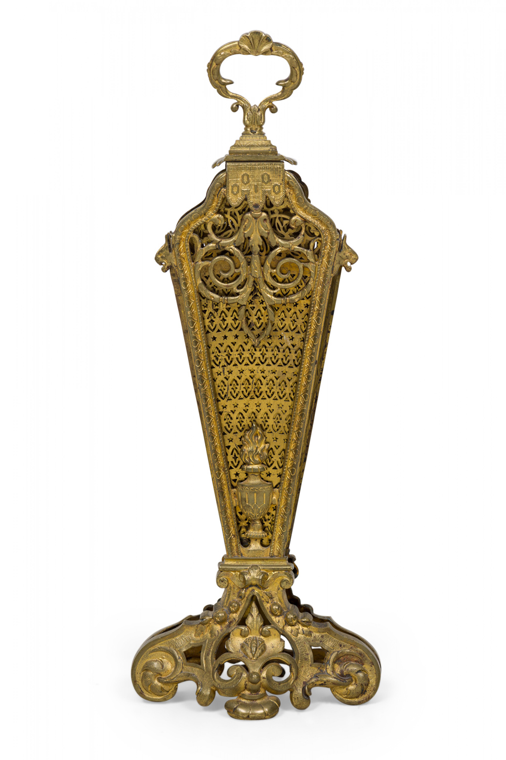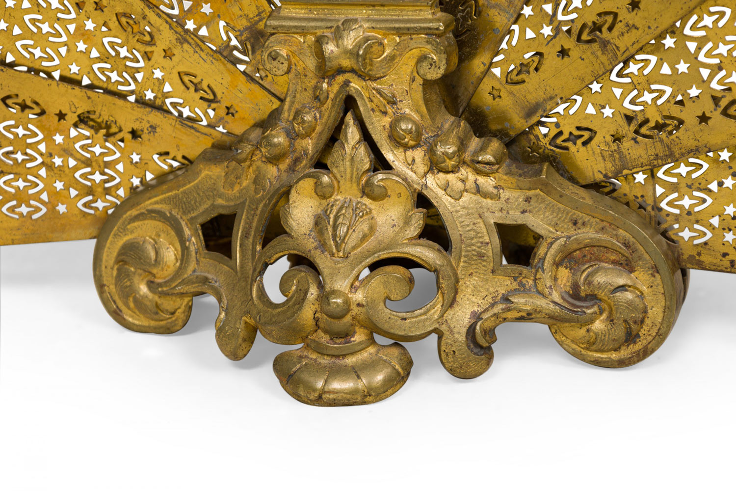 French Victorian brass filigree folding fireplace fan design fire screen with handle top..