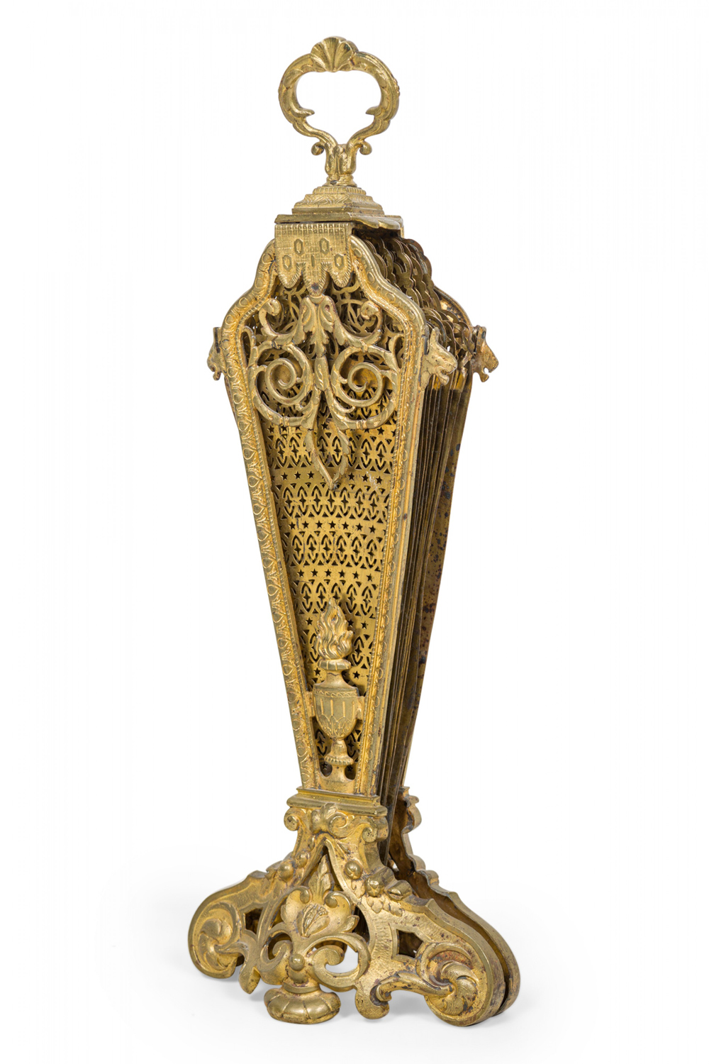 French Victorian brass filigree folding fireplace fan design fire screen with handle top.