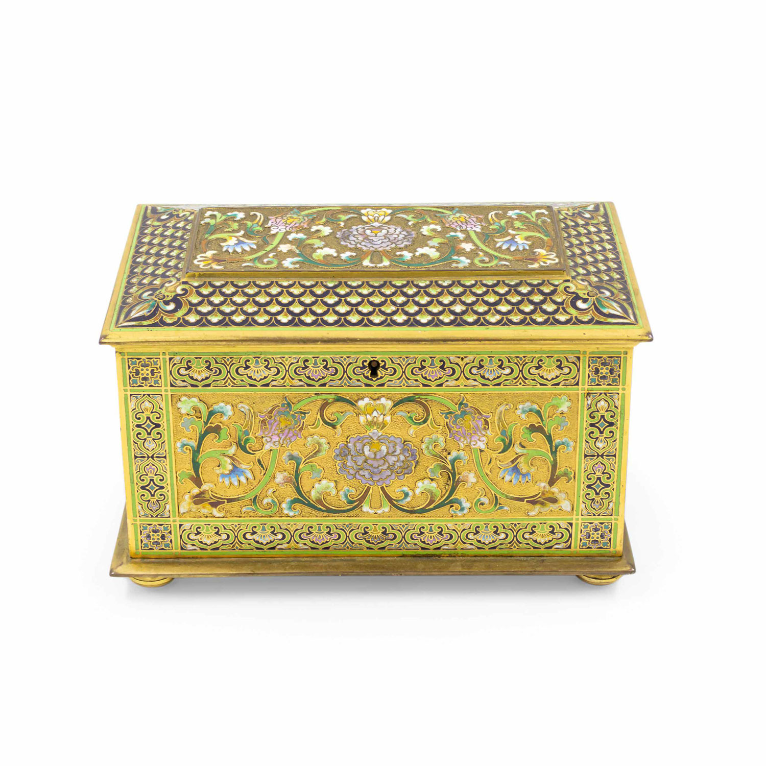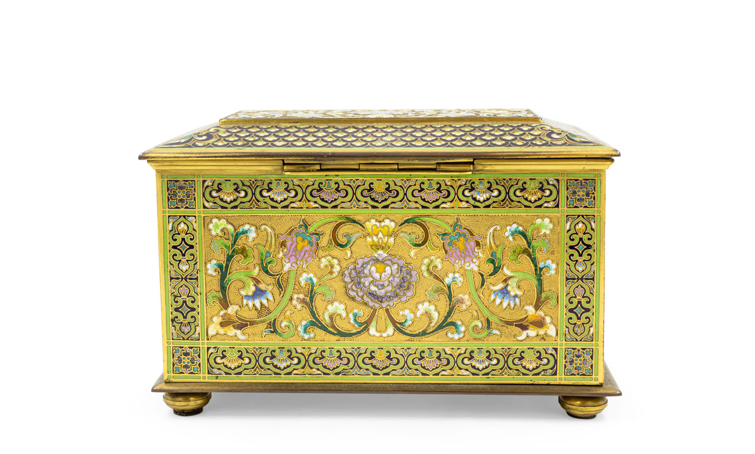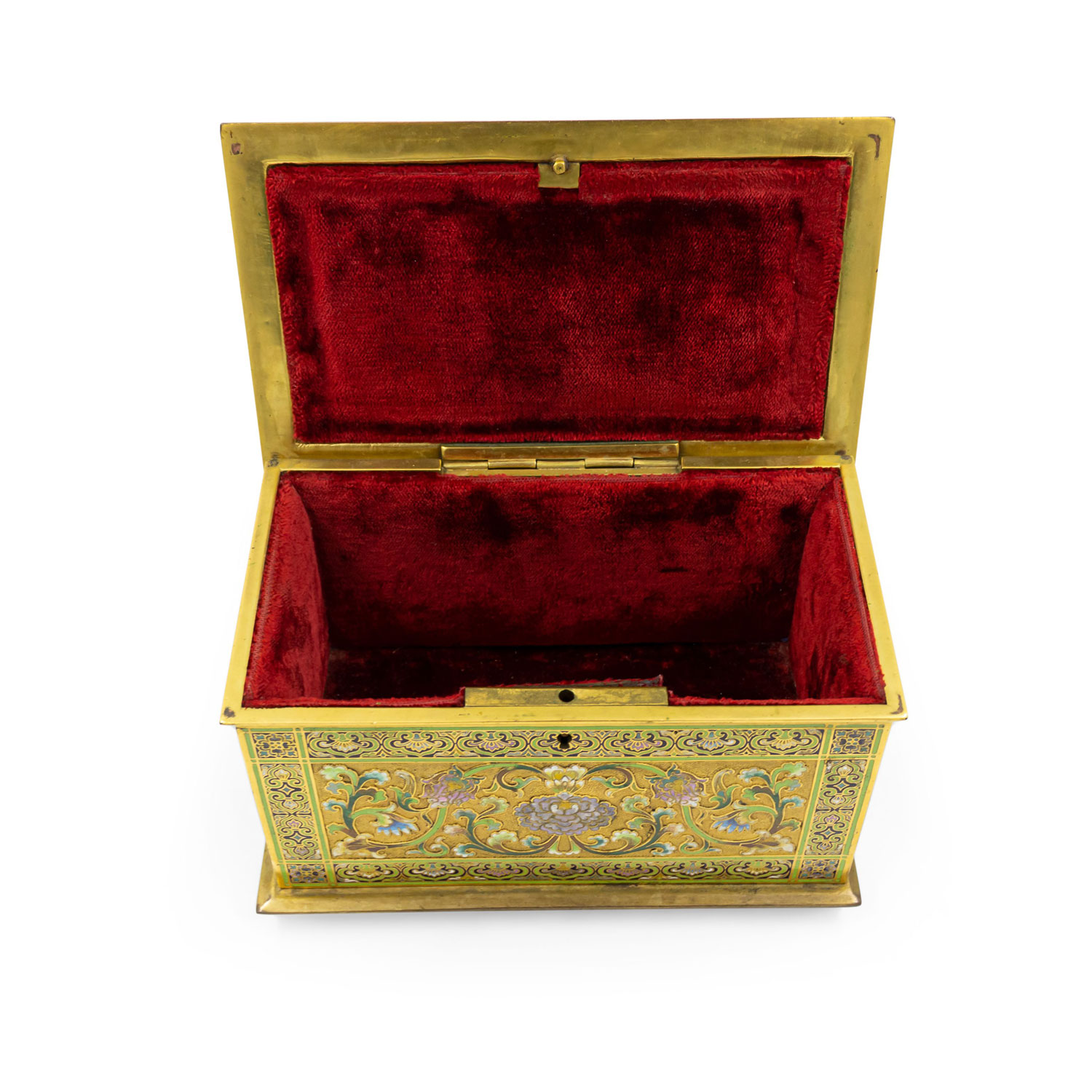 French Victorian bronze and multicolored enamel cloisonne box with floral and scroll design with red velvet interior
