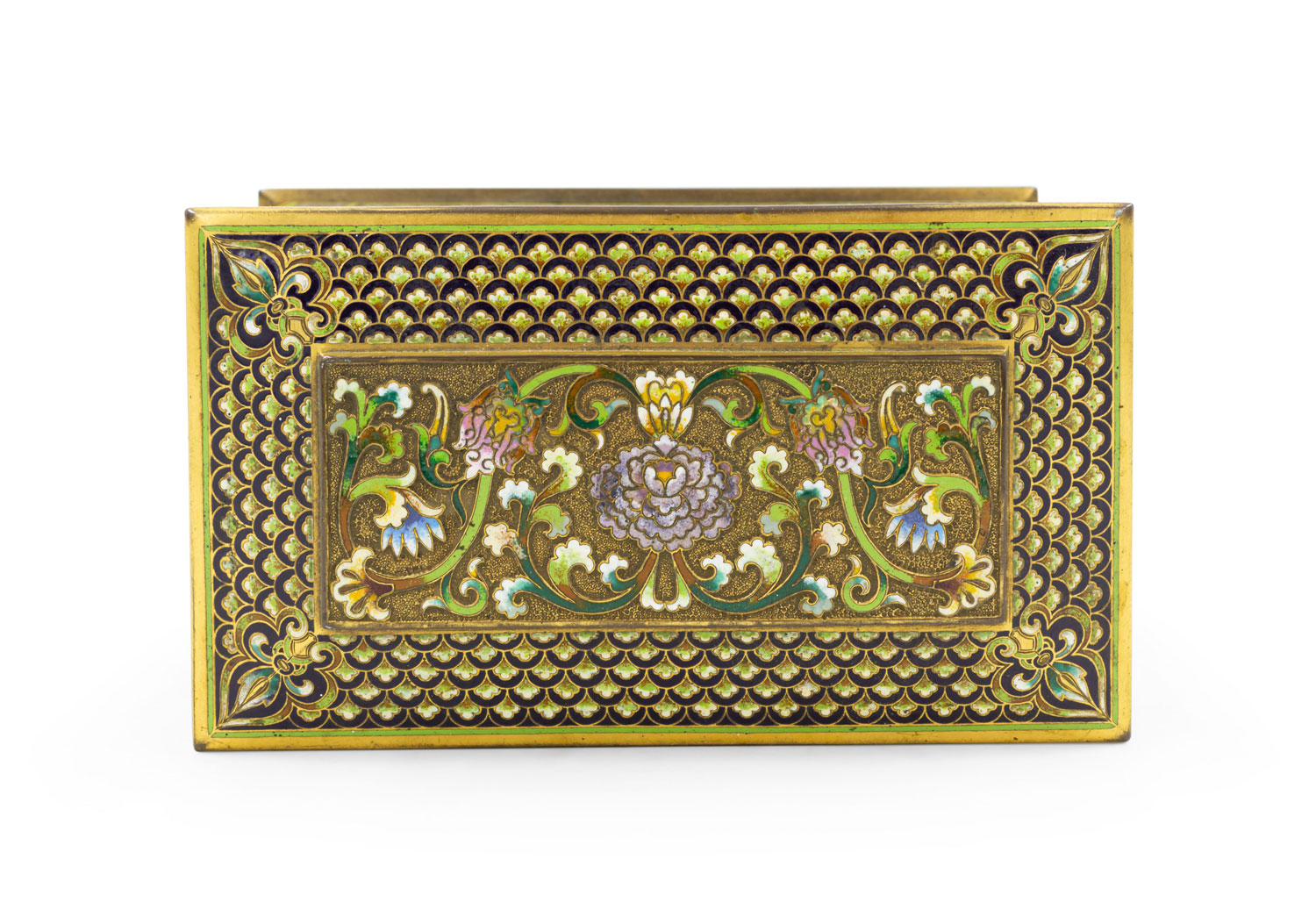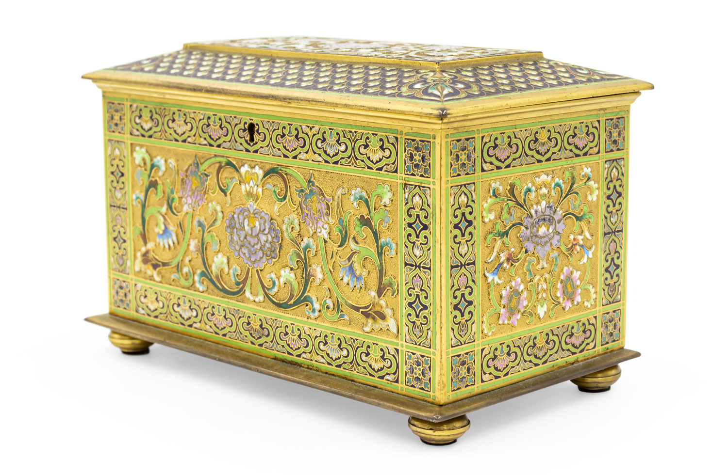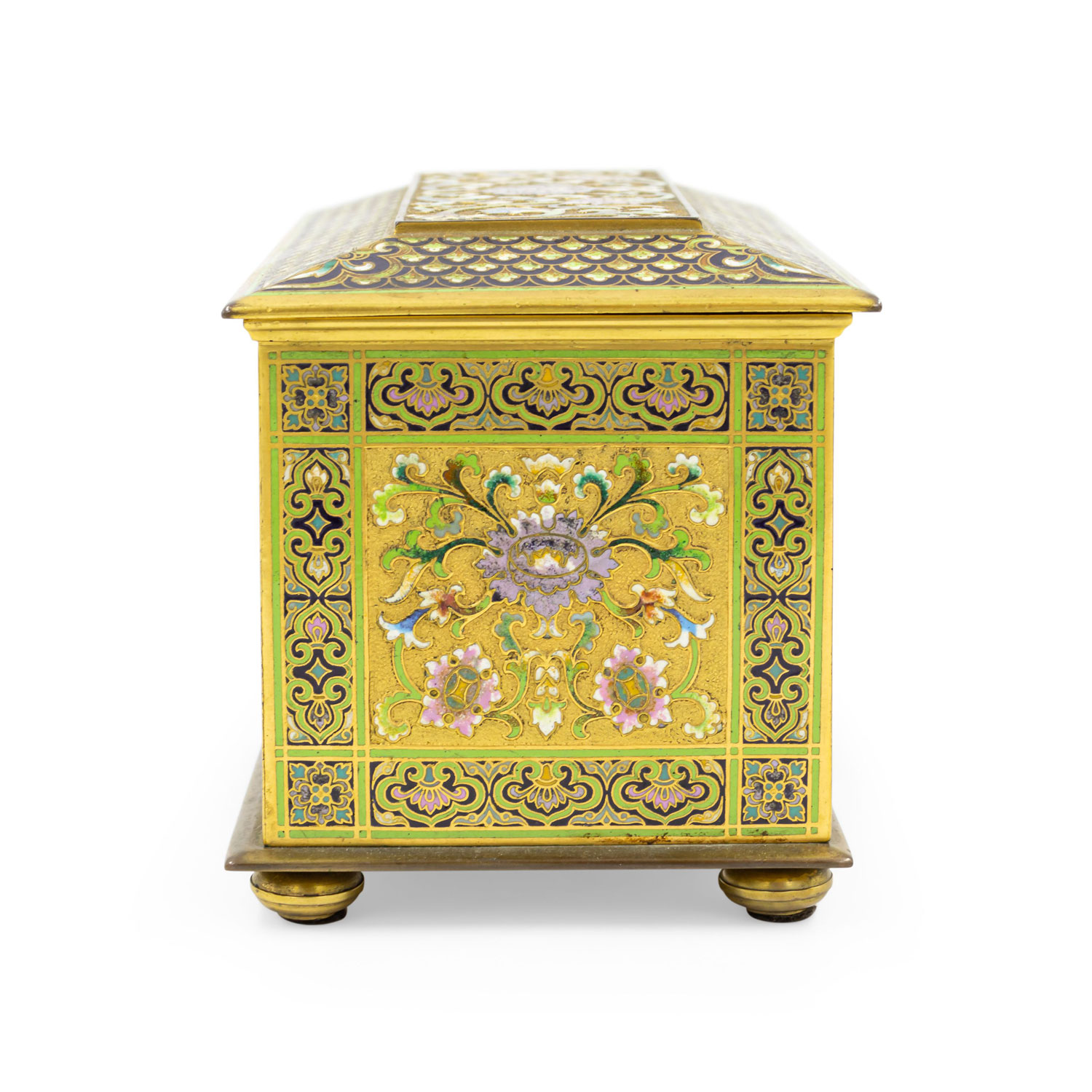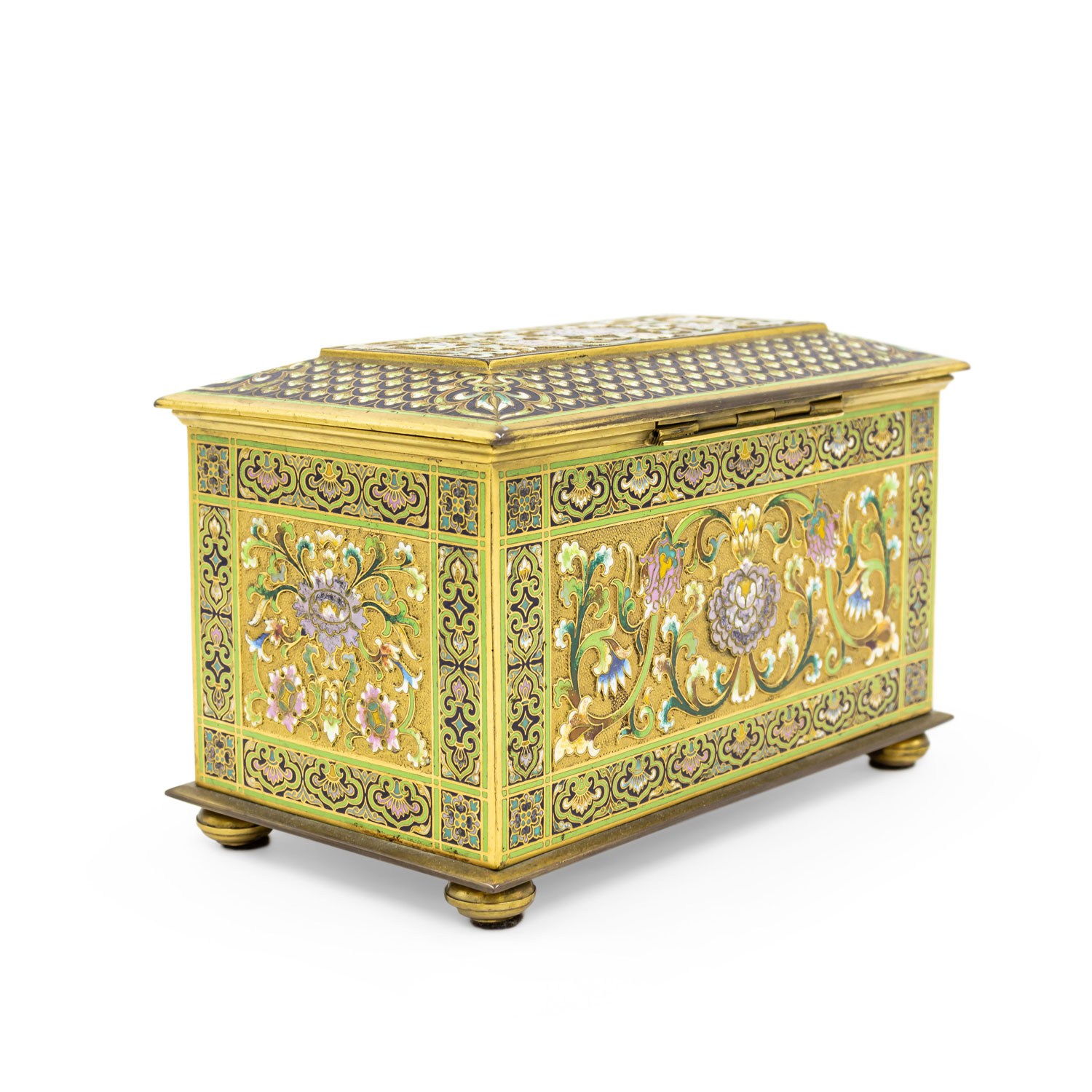 French Victorian bronze and multicolored enamel cloisonne box with floral and scroll design with red velvet interior