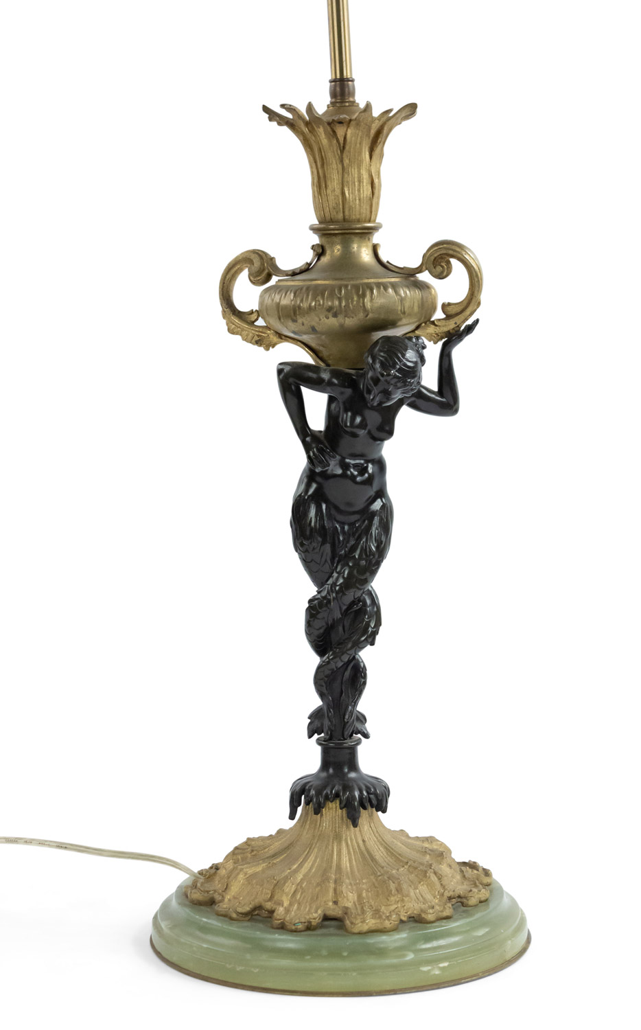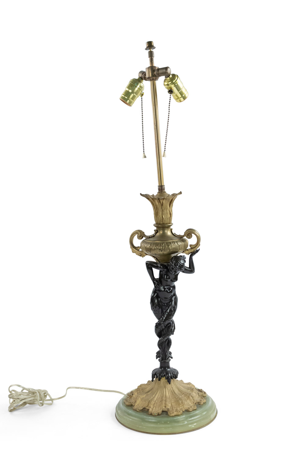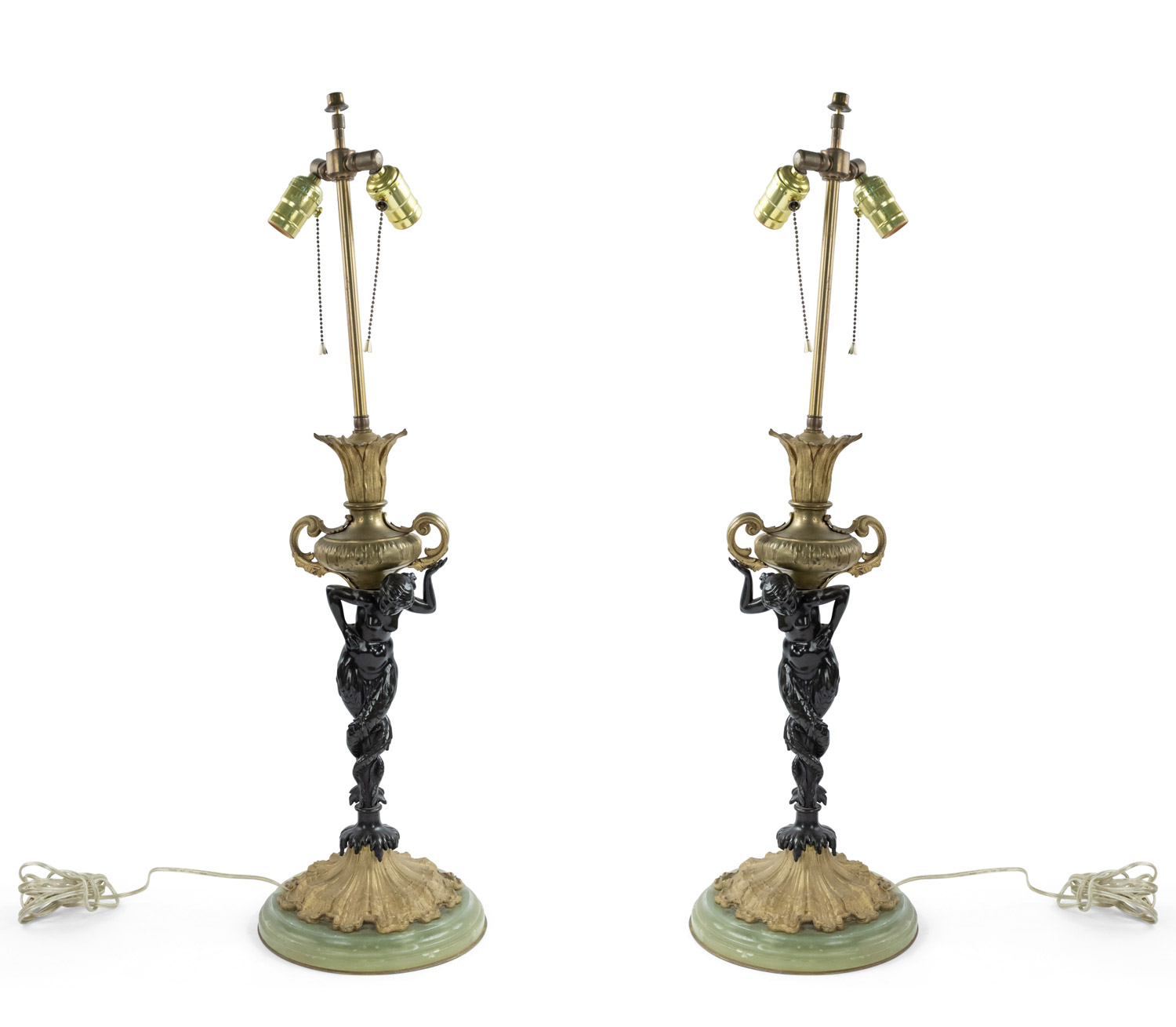 PAIR of French Victorian bronze table lamps with classic figures supporting urn on a round green onyx base (PRICED AS PAIR).