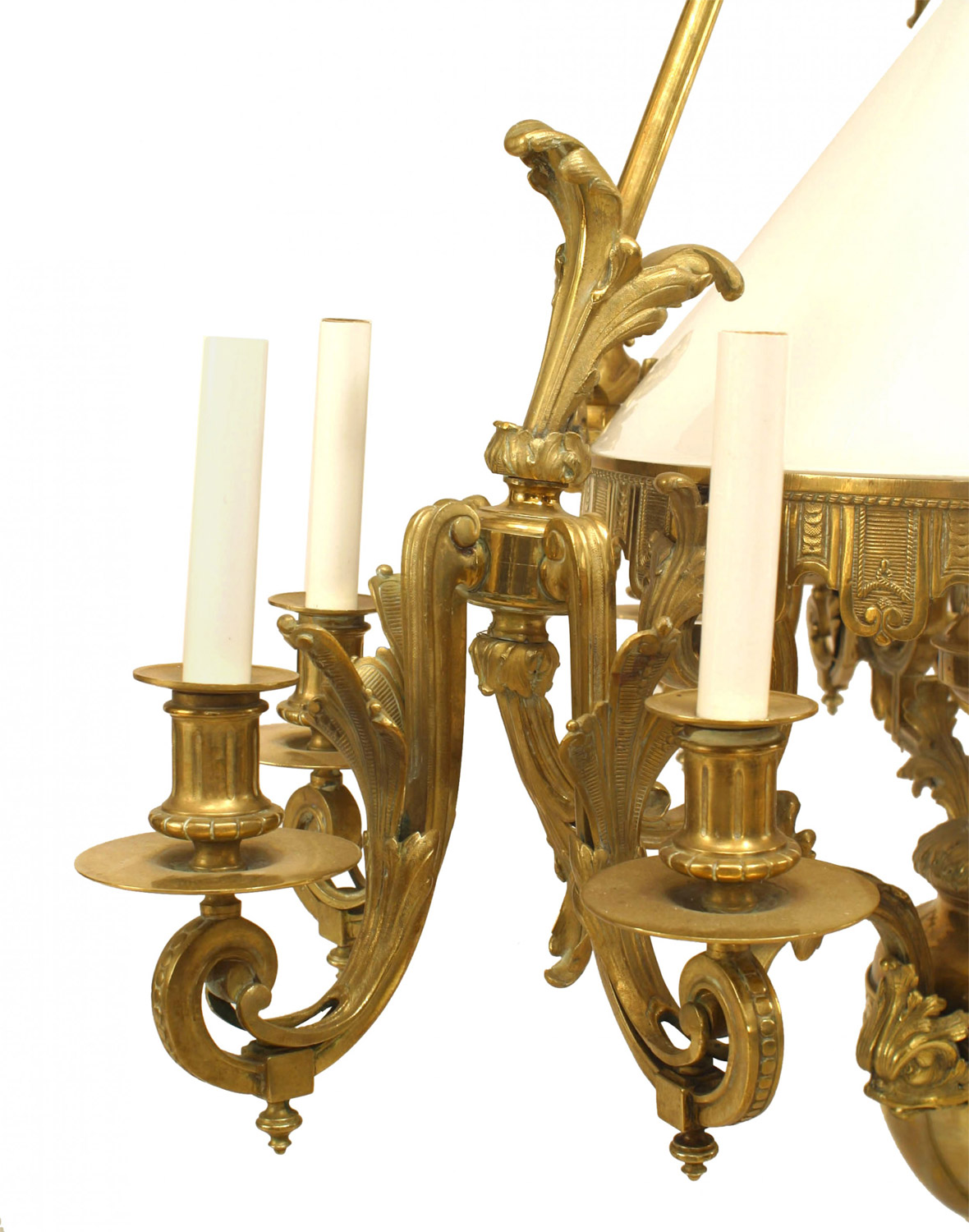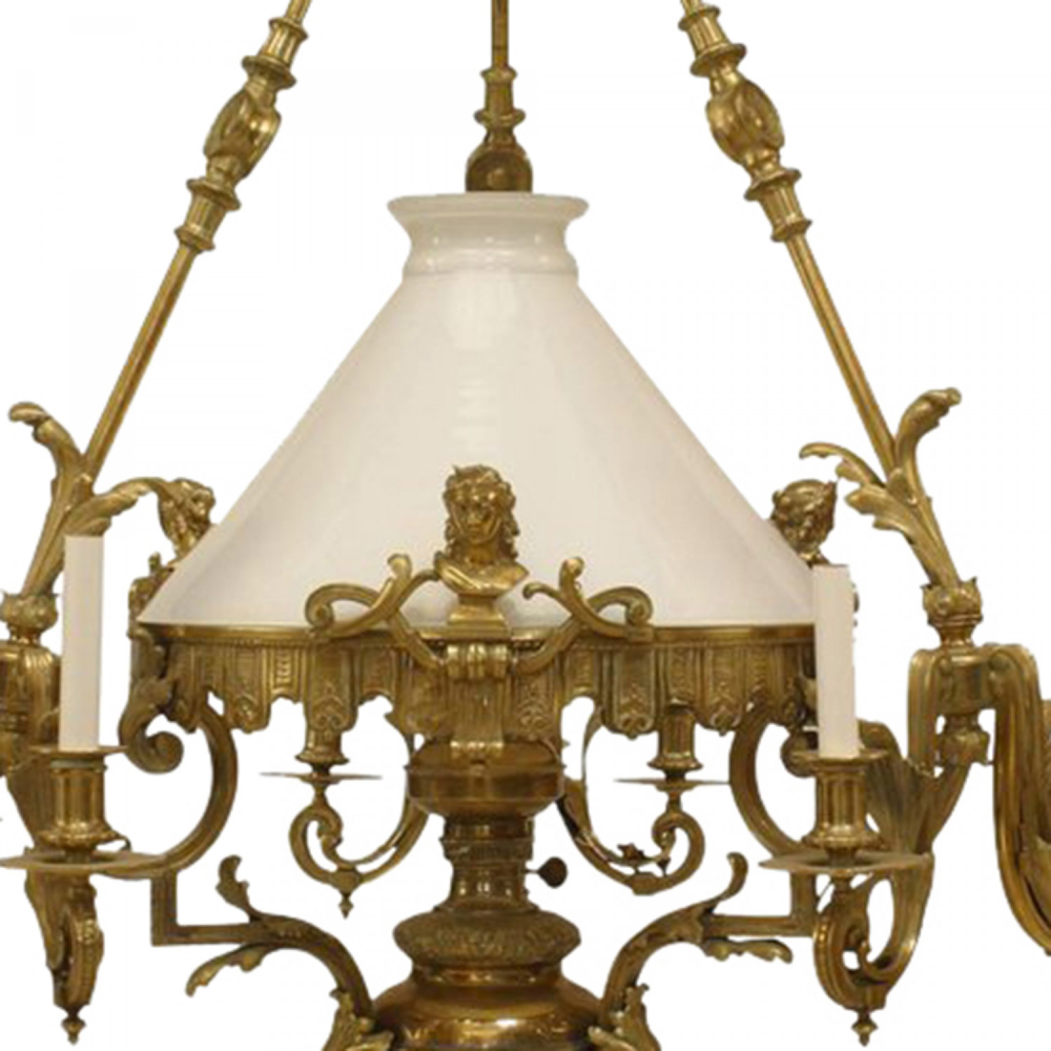French Victorian bronze 9 light converted gas chandelier with 3 lights on 3 foliate detailed arms with white glass center shade covering a center oil fount..