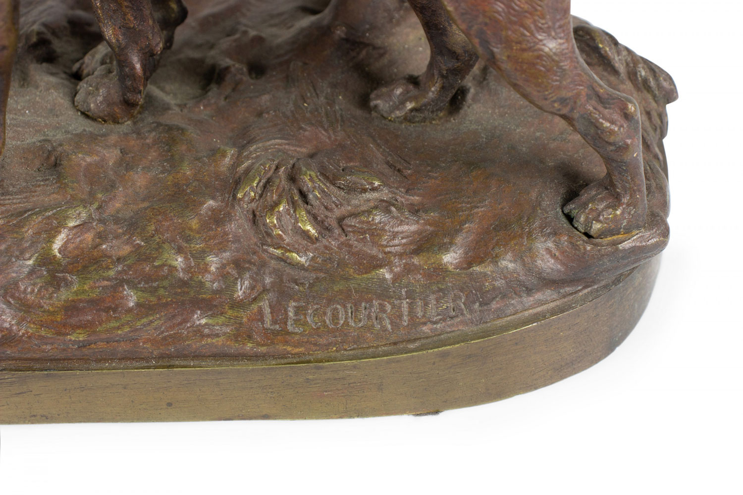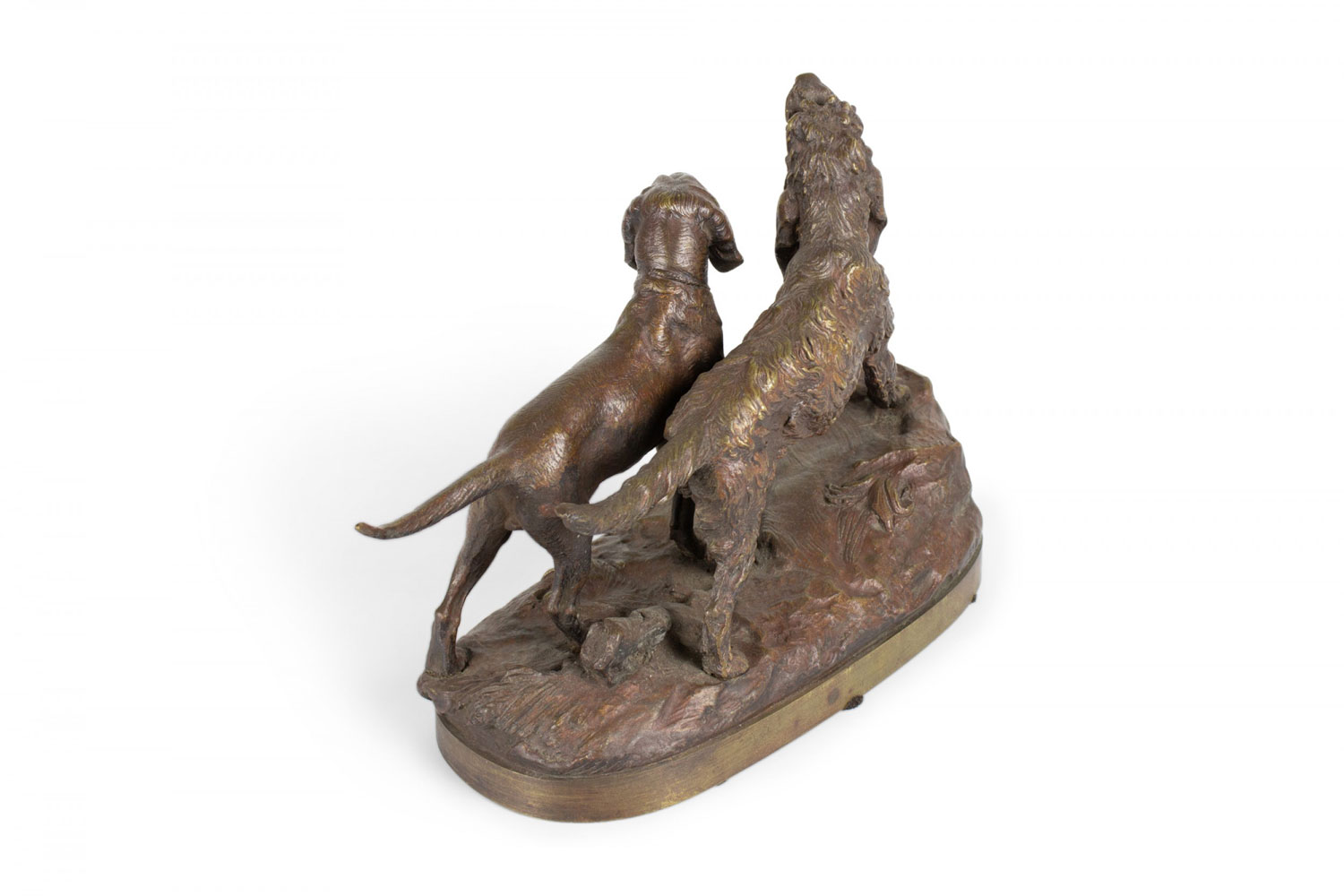French Victorian bronze figure of two dogs, one with long hair, on oval shaped base (att: Lecourtier)