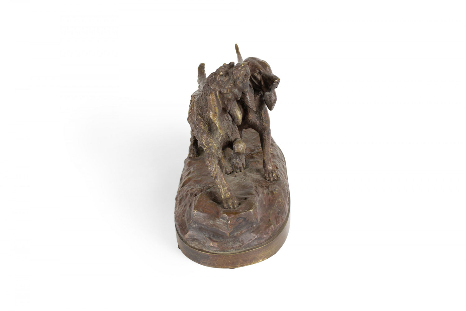 French Victorian bronze figure of two dogs, one with long hair, on oval shaped base (att: Lecourtier).