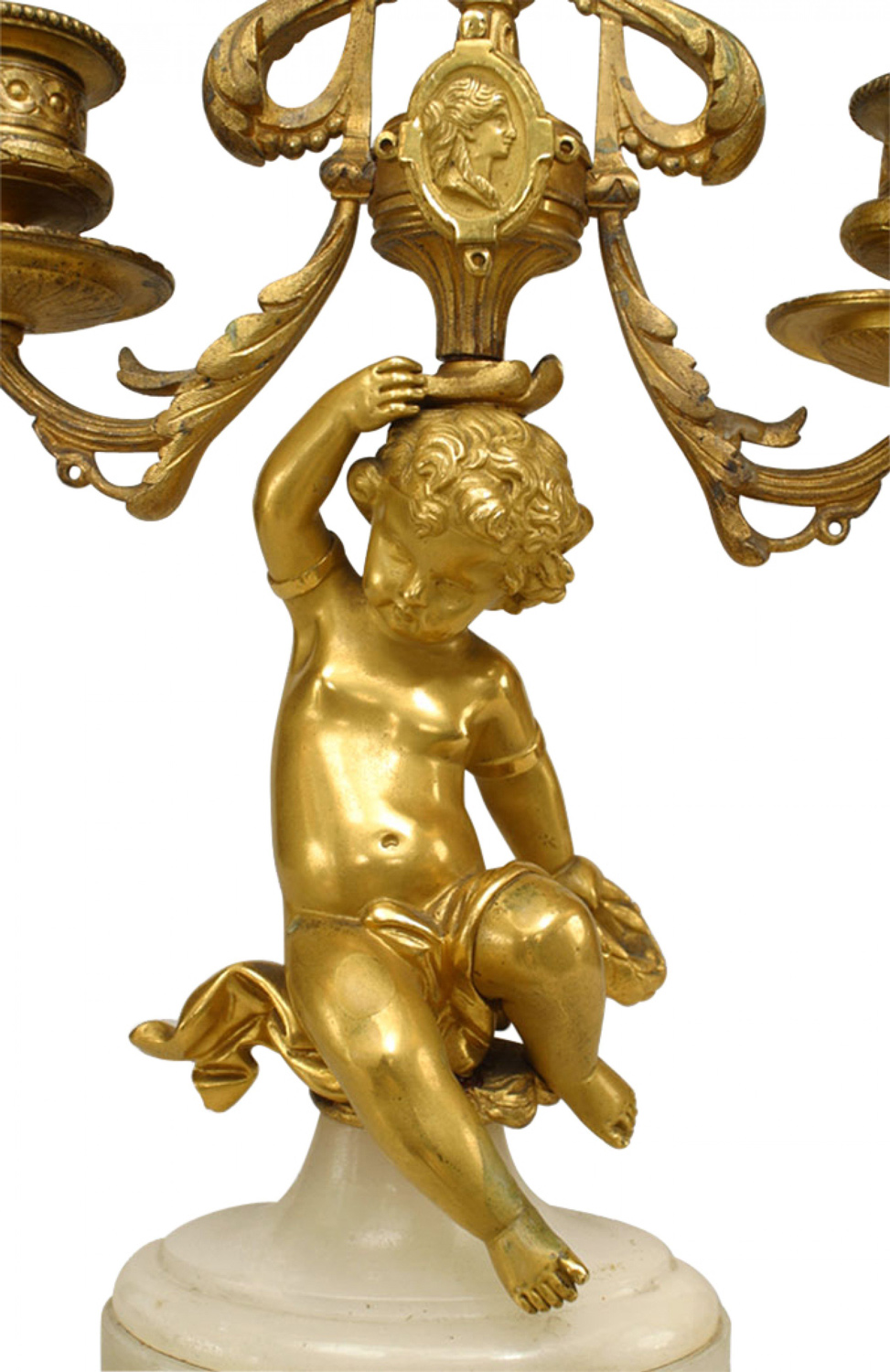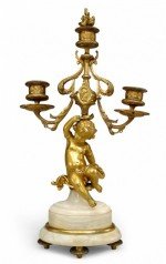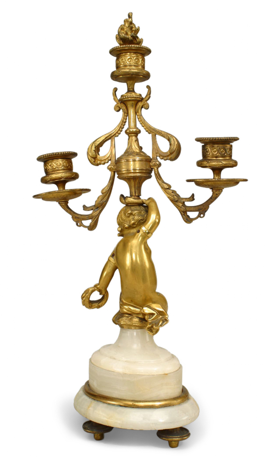 PAIR of French Victorian bronze dore 3 arm candelabras with decorative cupid on an oval shaped onyx base with finial (PRICED AS PAIR).