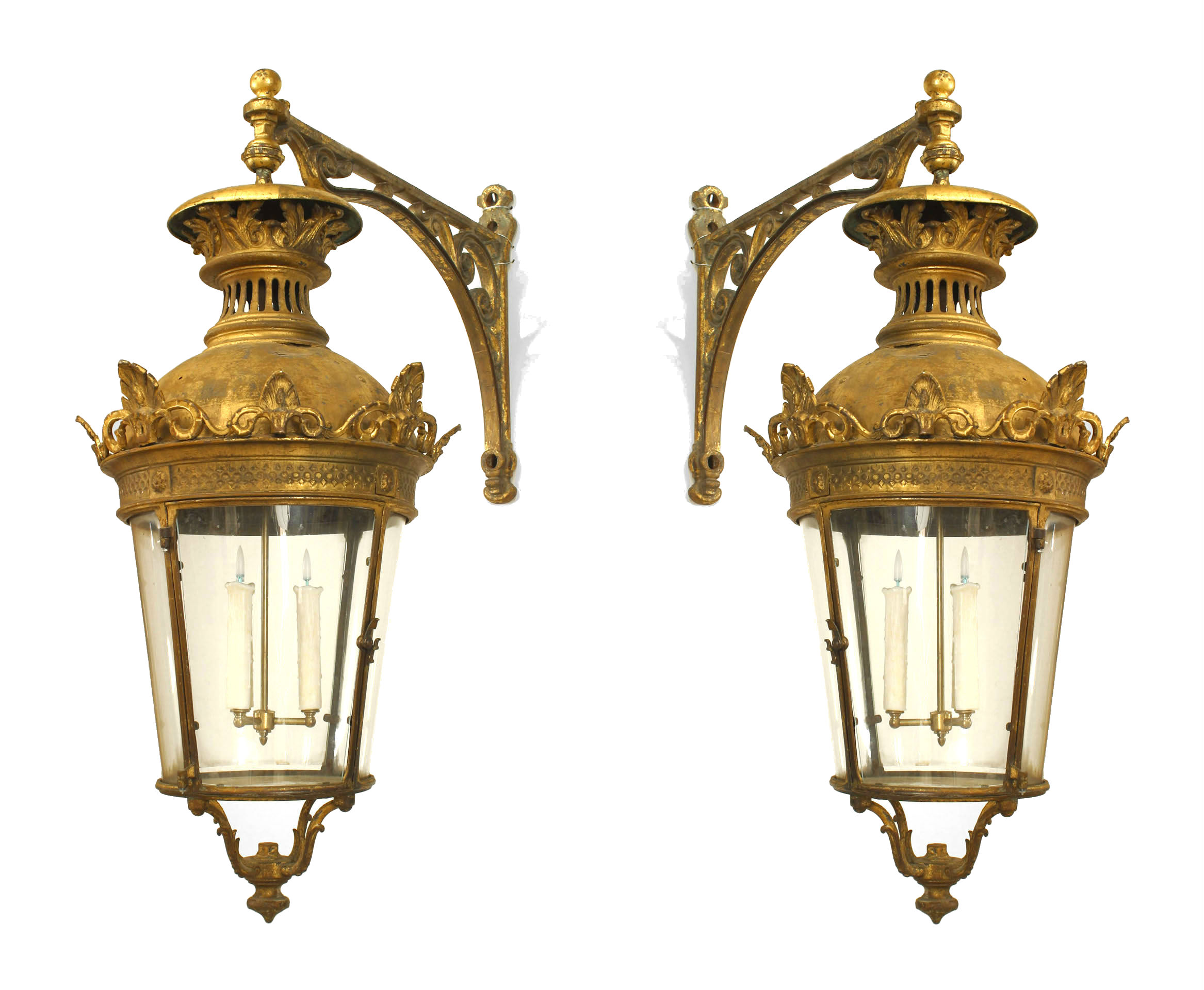 PAIR of French Victorian bronze 4 sided bent glass paneled lanterns with scroll bracket wall support (PRICED AS PAIR).