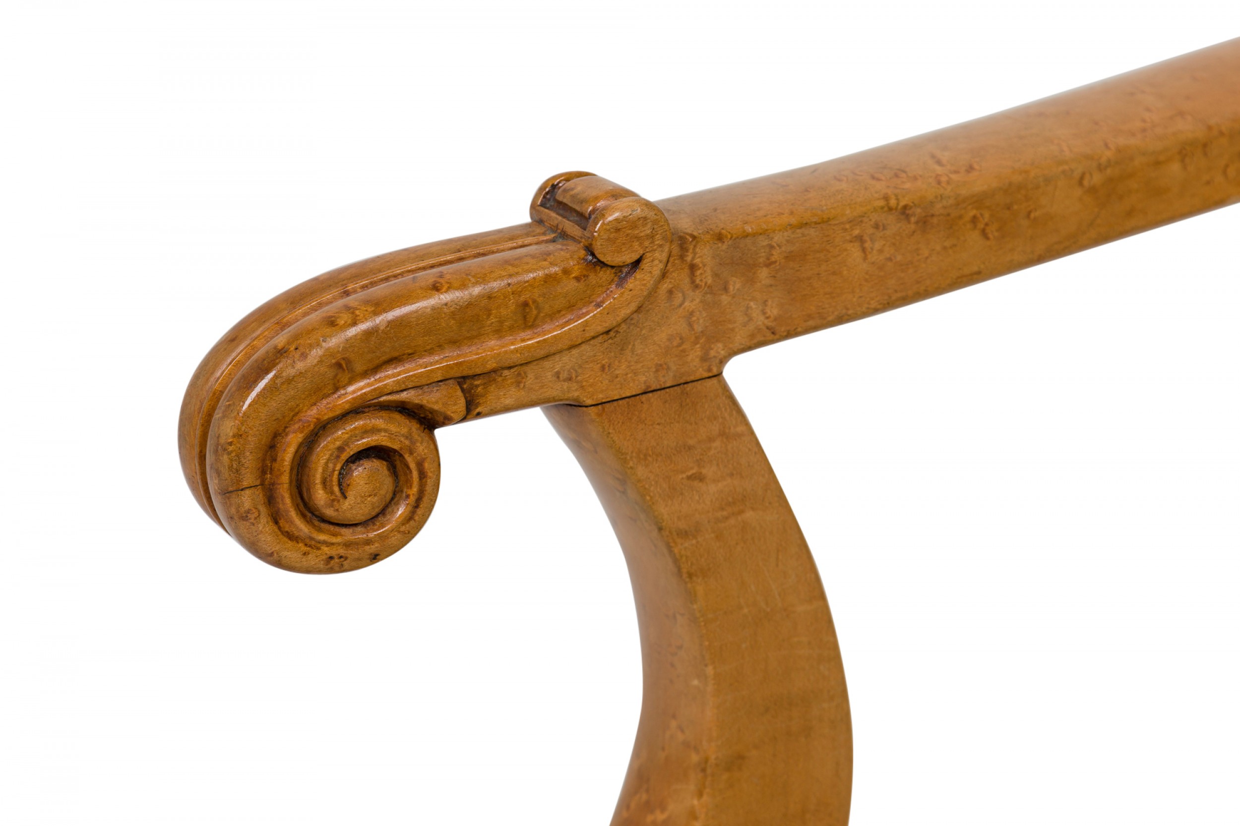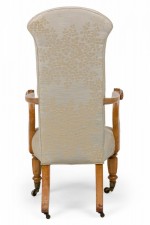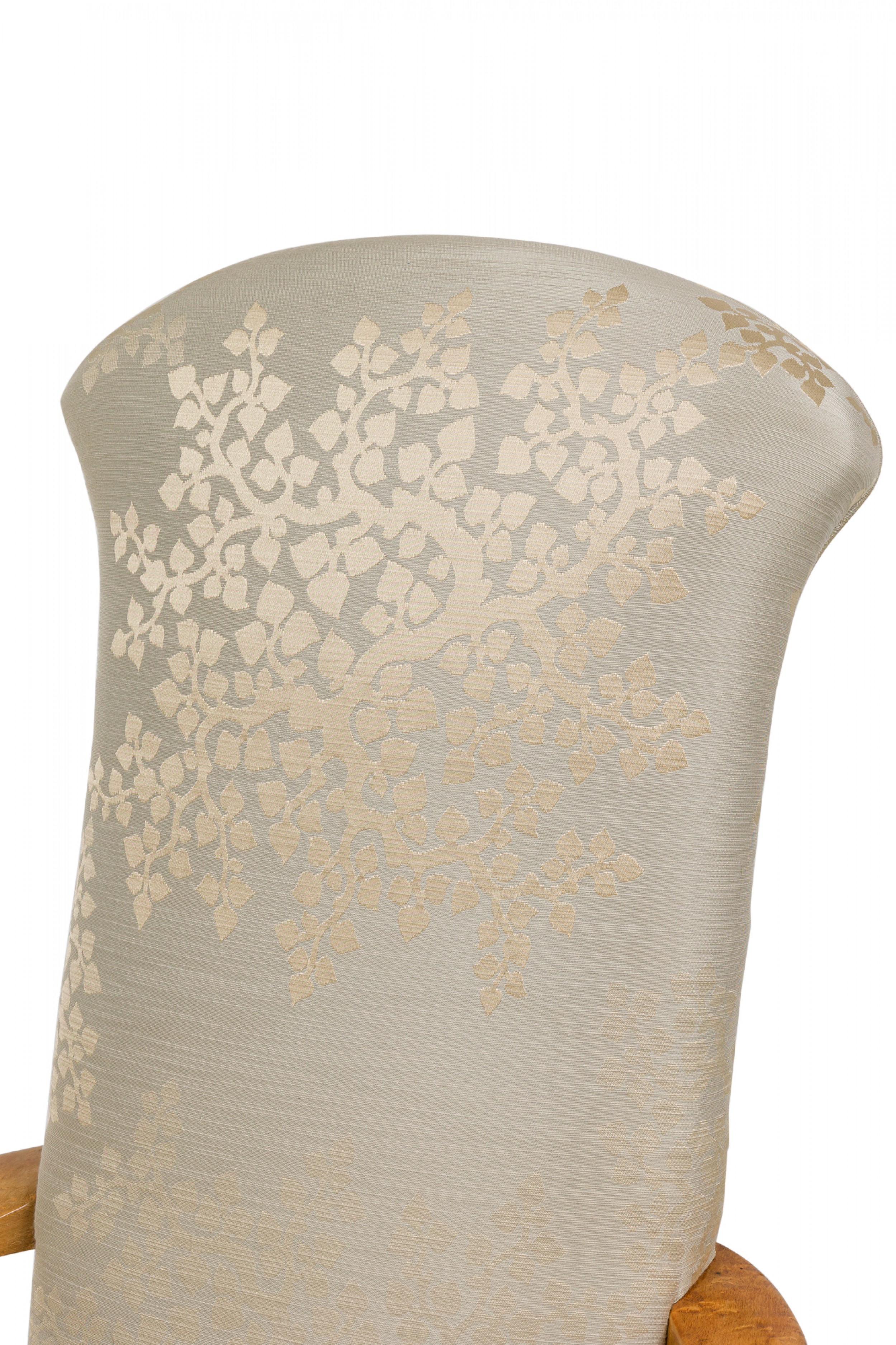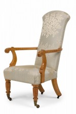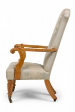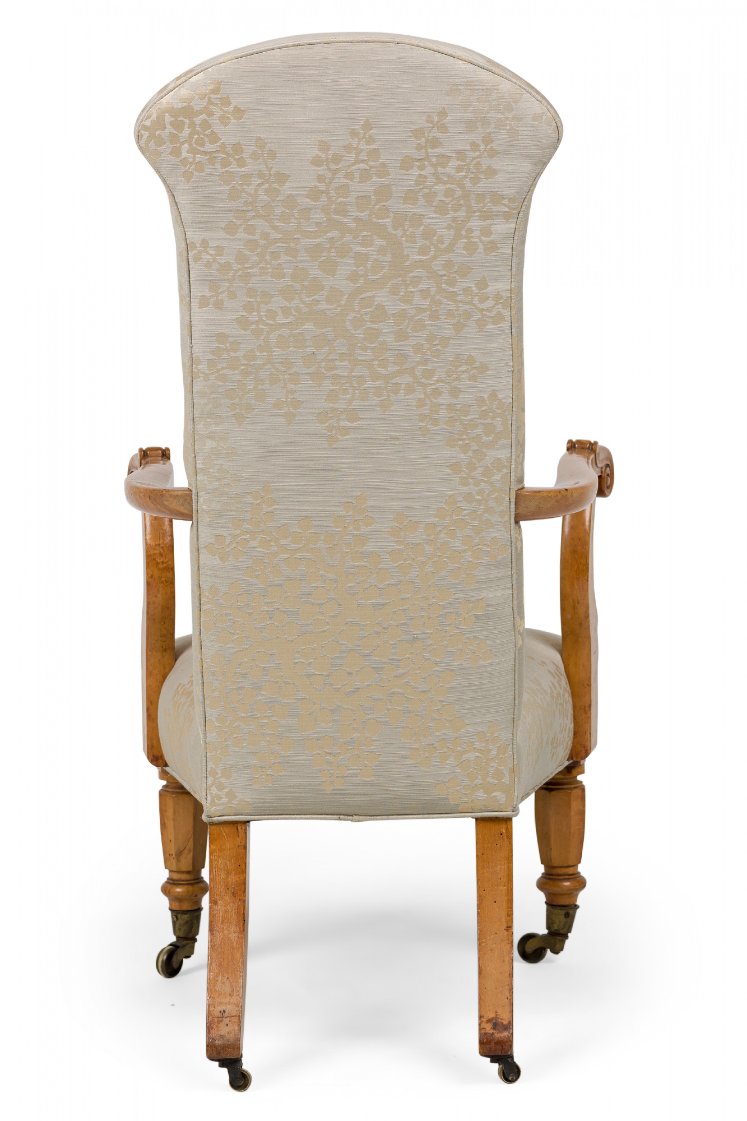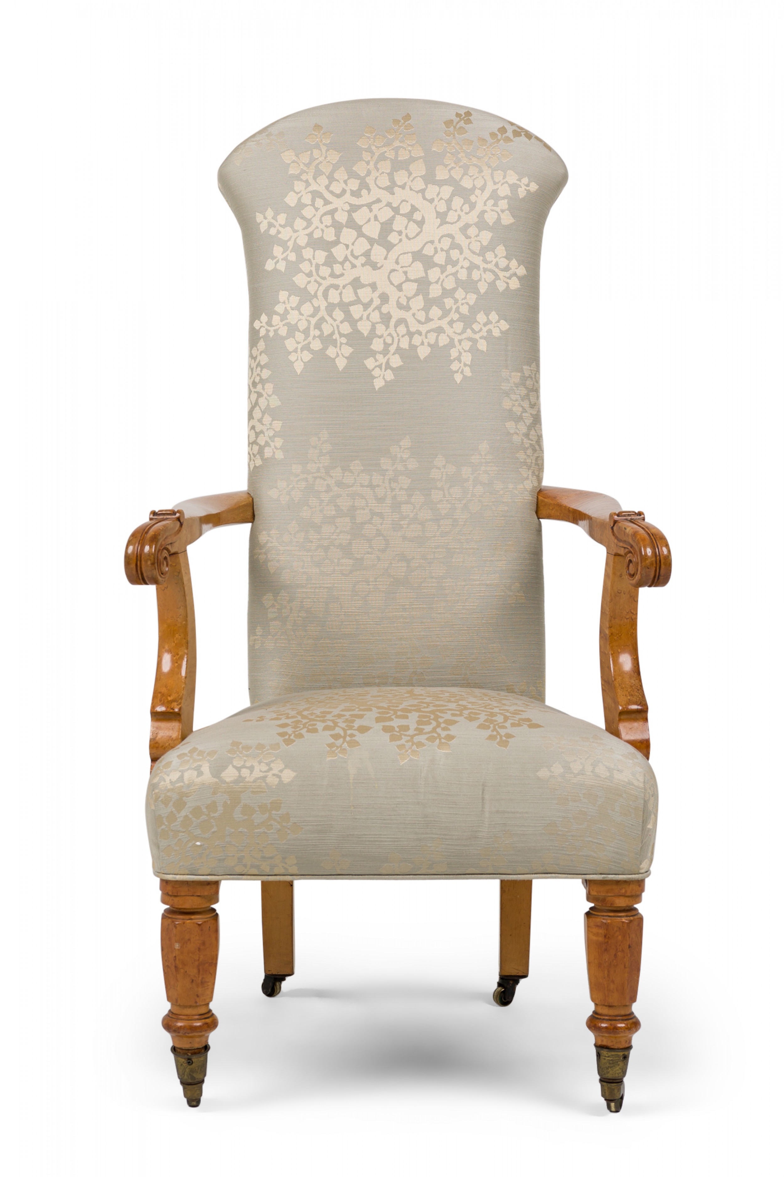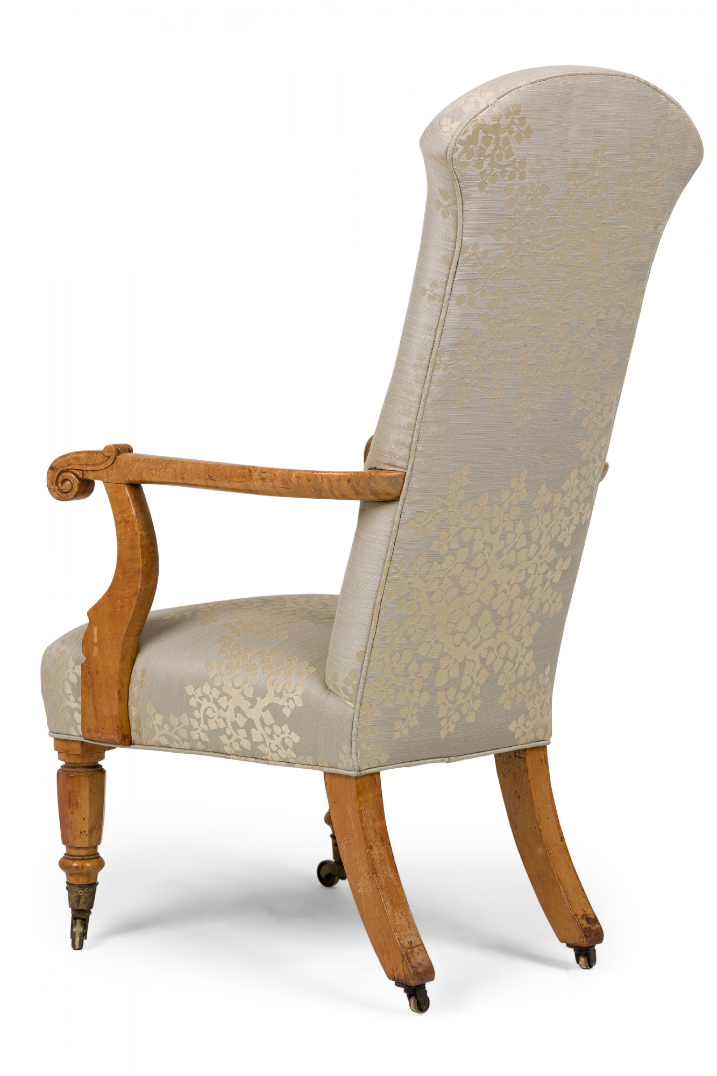 French Victorian (19th Century) maple armchair with a high shaped narrow back, having scroll-form arms, upholstered in a Dedar silk taupe floral damask, standing on turned front legs and back saber legs with casters.